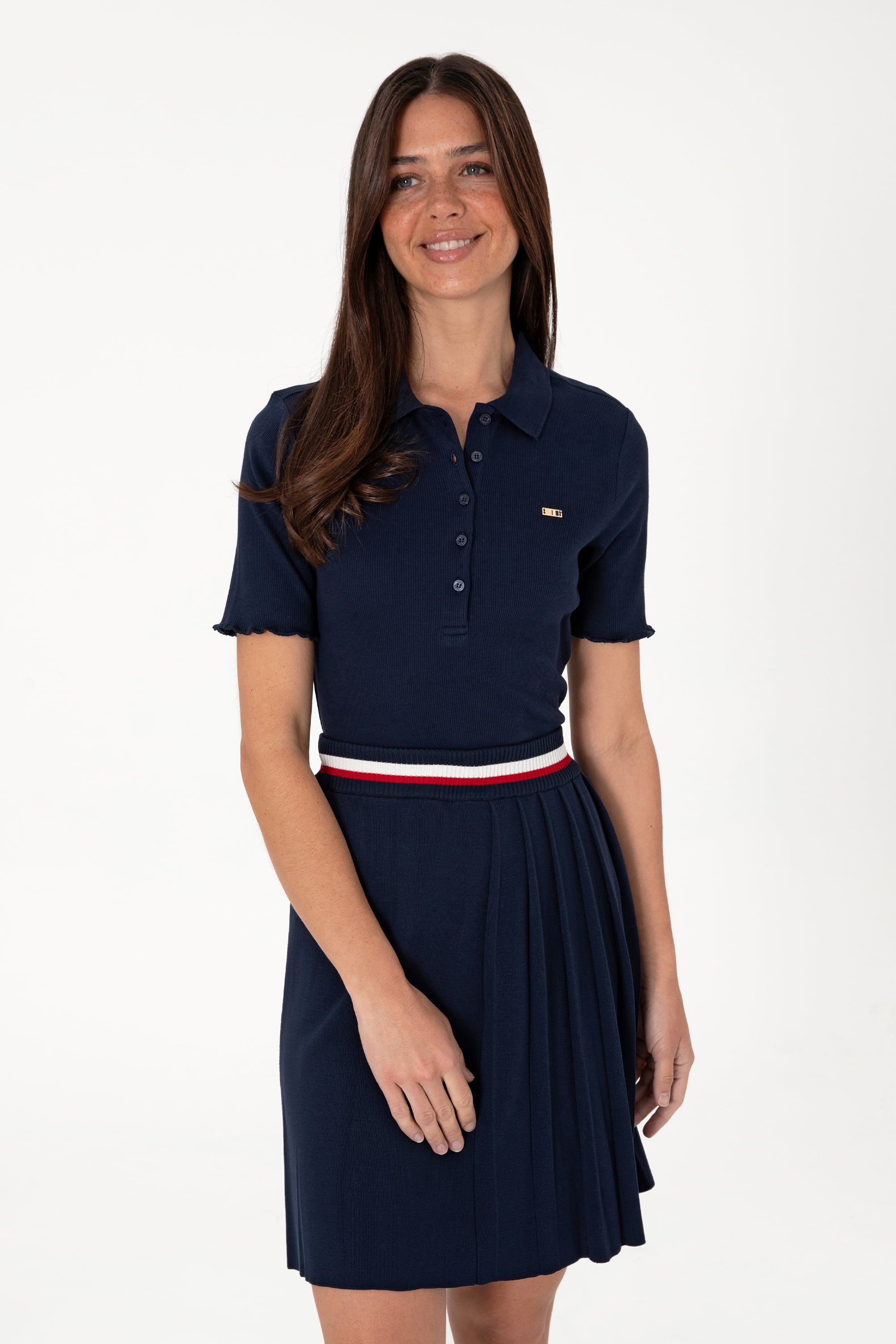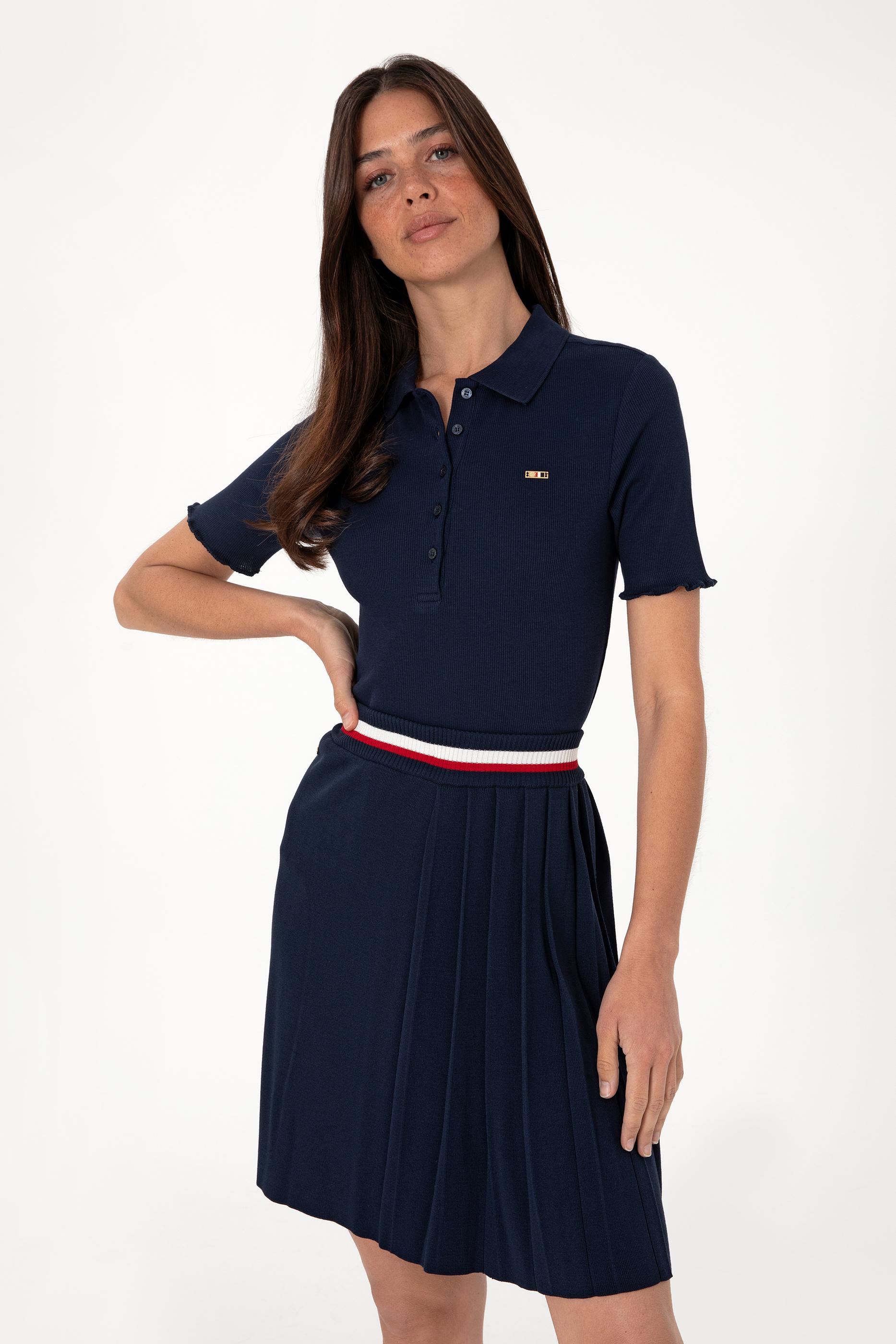 laciverti zarif detaylarla buluşturan bu kadın polo yaka tişört, klasik şıklığı sportif bir yorumla yeniden tanımlıyor. İnce nervürlü dokusu, hem yapısını koruyan hem de vücudu saran bir form sunarken, tok duruşu sayesinde giyildiğinde düzgün ve özenli bir siluet yaratır. Düğmeli yakasıyla zamansız bir görünüm kazanan tasarım, kol ucu ve yaka çevresindeki ince ribana detaylarıyla dikkat çeker. Sol göğüsteki metalik Polo arması ise sade tasarımı sofistike bir vurguyla tamamlar. Günlük hayattan iş yaşamına, etek ve kumaş pantolonlarla kombinlendiğinde güçlü ve özgüvenli bir stil ortaya koyar.