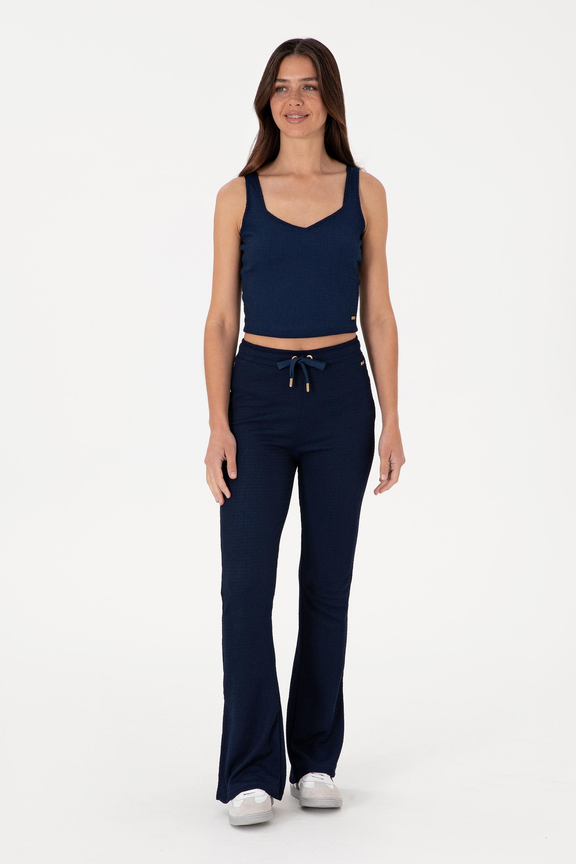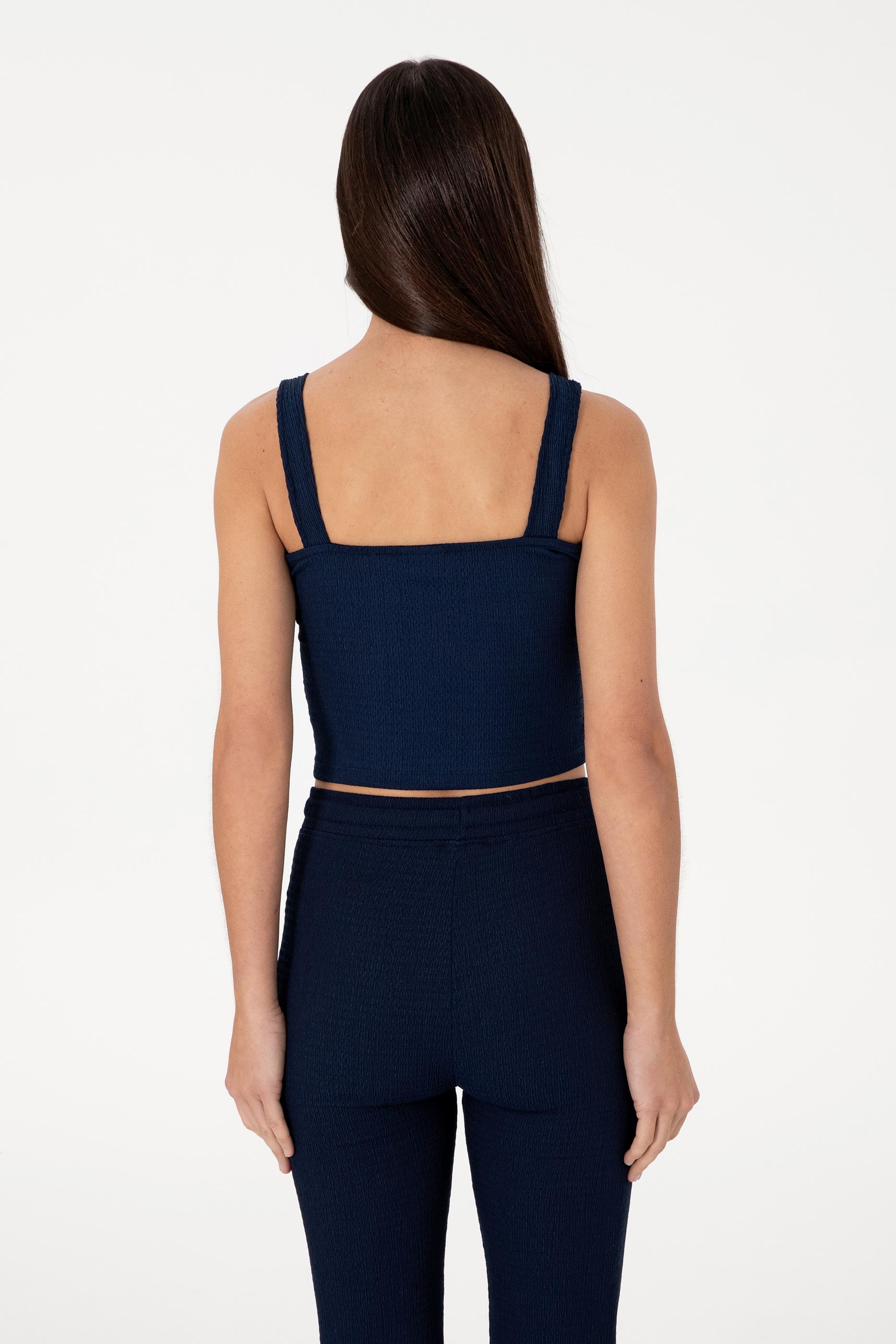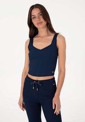Modern ve sade çizgileriyle dikkat çeken bu kadın lacivert kolsuz V yaka tişört, fit kesimiyle vücuda tam oturur ve silueti zarifçe vurgular. Ribana dokulu kumaşı hafif esnekliğiyle gün boyu rahat bir kullanım sunarken, tok yapısı sayesinde üzerinizde toparlayıcı ve düzgün bir duruş sağlar. Geniş askılı tasarımı ve kalp formunu andıran V yaka detayı, feminen ve şık bir görünüm kazandırır. Alt kısmındaki metal detaylı küçük arma, tasarımı minimal ama güçlü bir şekilde tamamlar. Crop boy tasarımı, yüksek bel pantolonlar ve eteklerle mükemmel bir uyum sağlıyor. Günlük giyimde ya da özel etkinliklerde tercih edilebilir, bu tişört stilinizi tamamlamak için ideal bir parça. Şık tasarımı ve rahat yapısıyla gardırobunuzun favorileri arasında yer alacak.