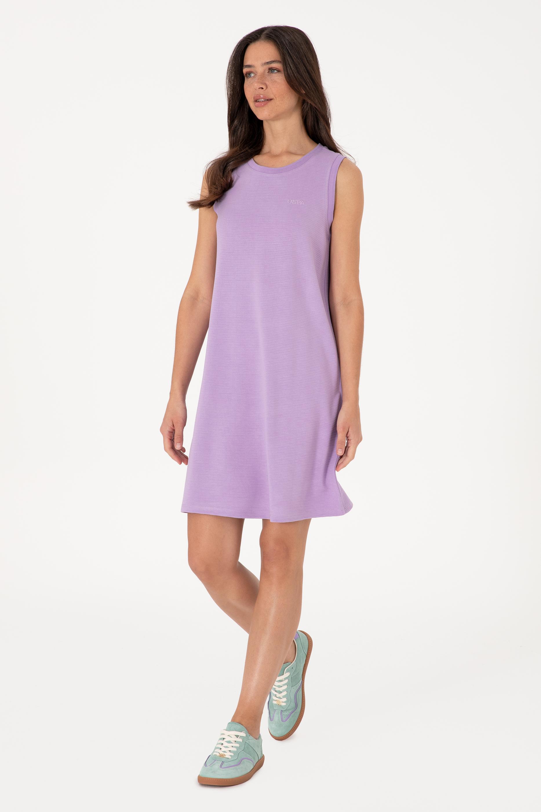 U.S. Polo Assn. stilini yalın bir zarafetle yansıtan bu lila kolsuz elbise, bisiklet yaka detayı ve dökümlü formuyla hem sade hem çabasız bir şıklık sunuyor. İnce dokulu, hafif örme kumaşı ciltte yumuşak bir his bırakırken; nefes alan yapısıyla yaz günlerinde maksimum konfor sağlıyor. Vücudu sarmayan rahat kesimiyle doğal bir duruş kazandıran elbise, yürüyüşten şehir gezilerine kadar birçok ana eşlik edecek kadar çok yönlü. Göğüs kısmında yer alan zarif U.S. Polo Assn. yazısı ise markaya ait sade bir imza niteliğinde. Beyaz sneakers veya renkli bantlı sandaletlerle tamamlandığında ise modern, enerjik bir görünüm elde etmek mümkün.
