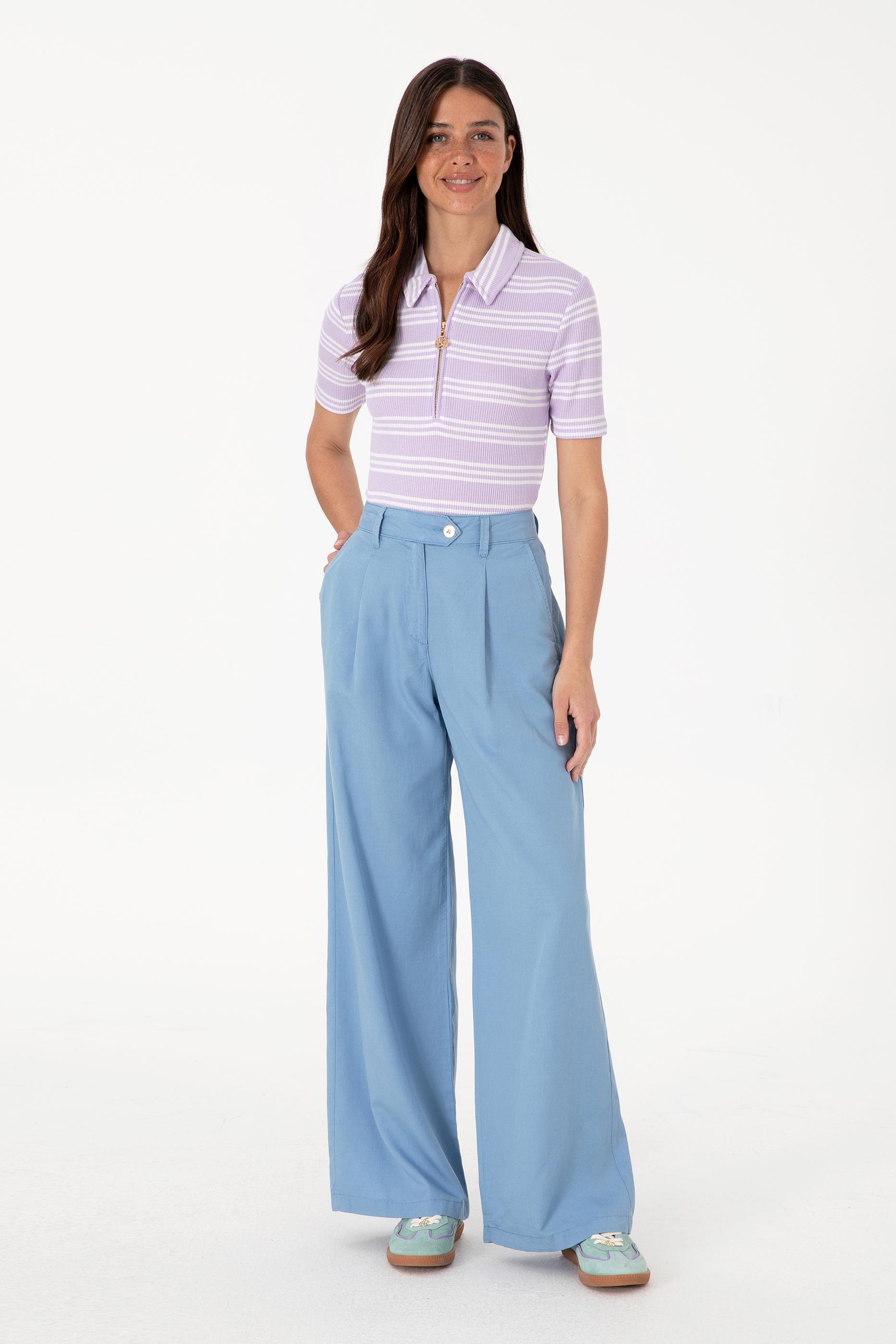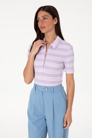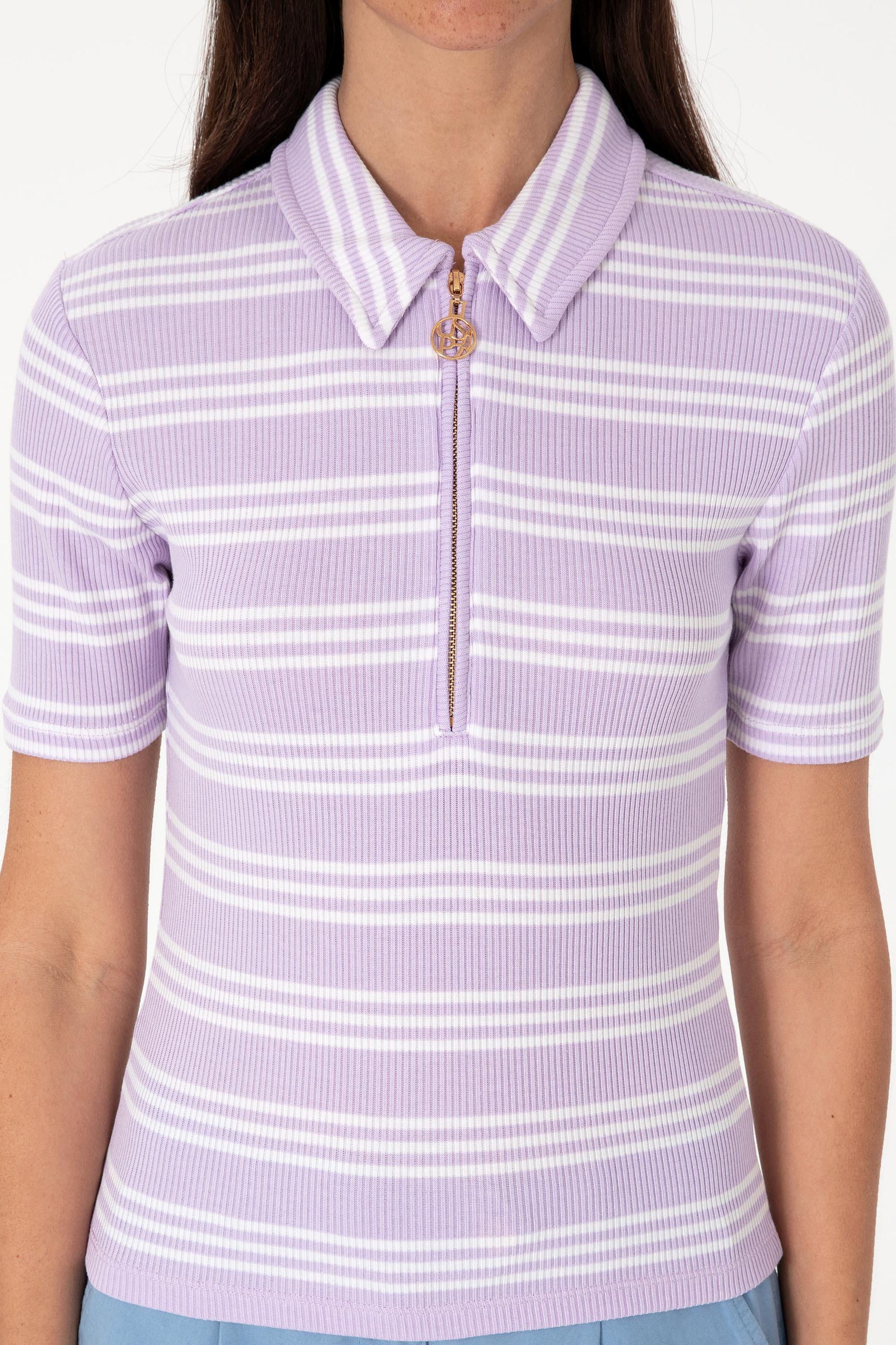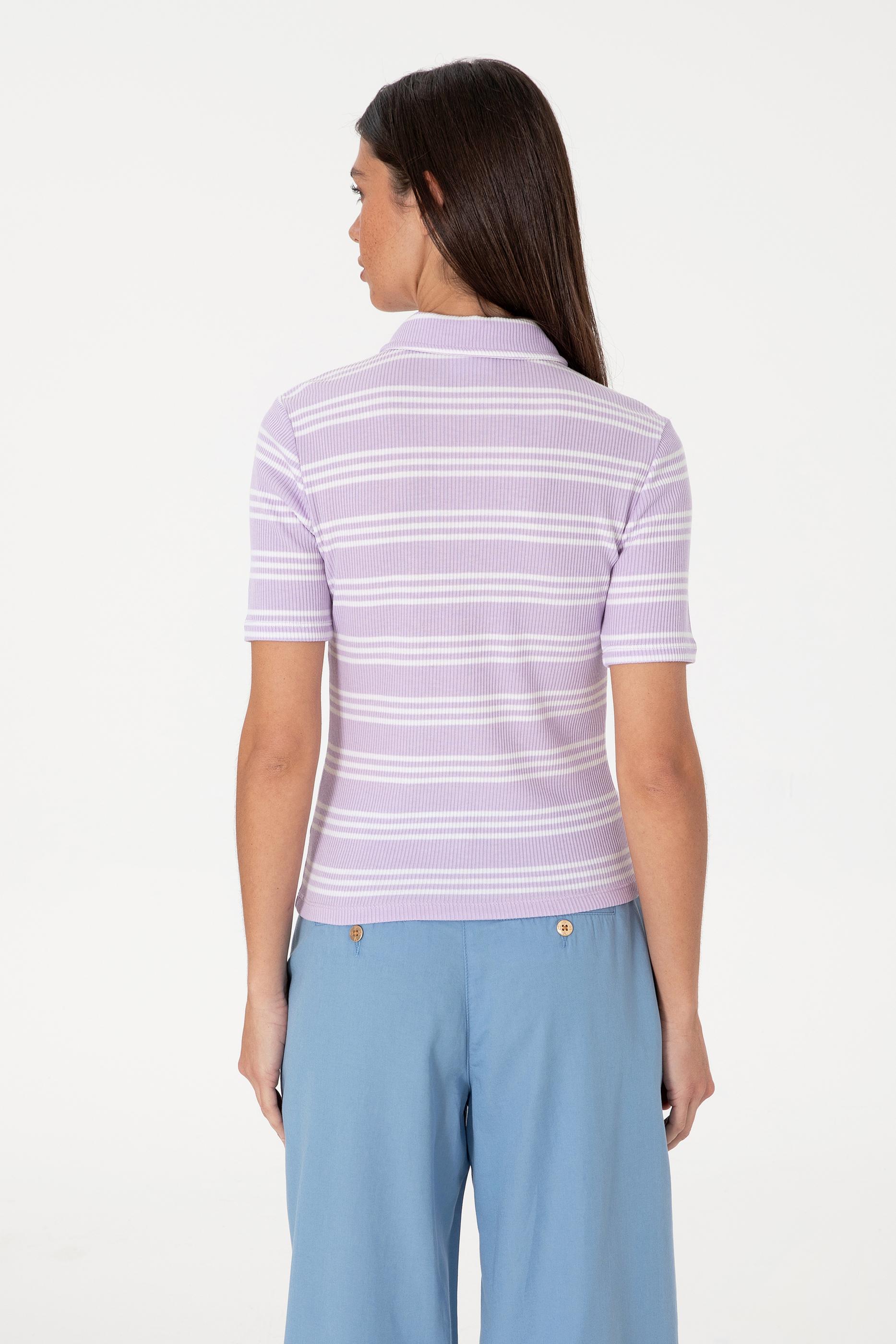 - Kadın Lila Çizgili Polo Yaka Tişört