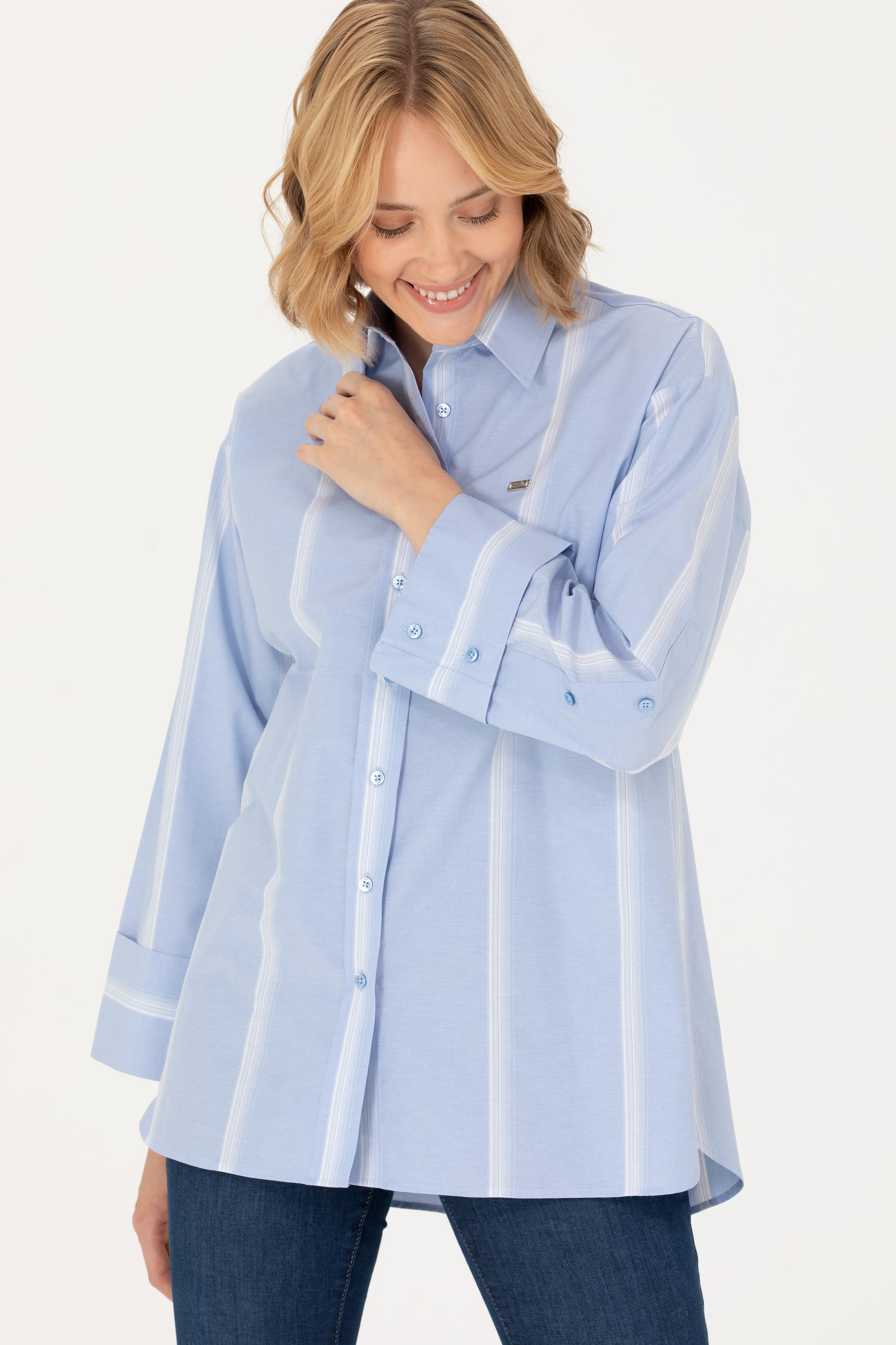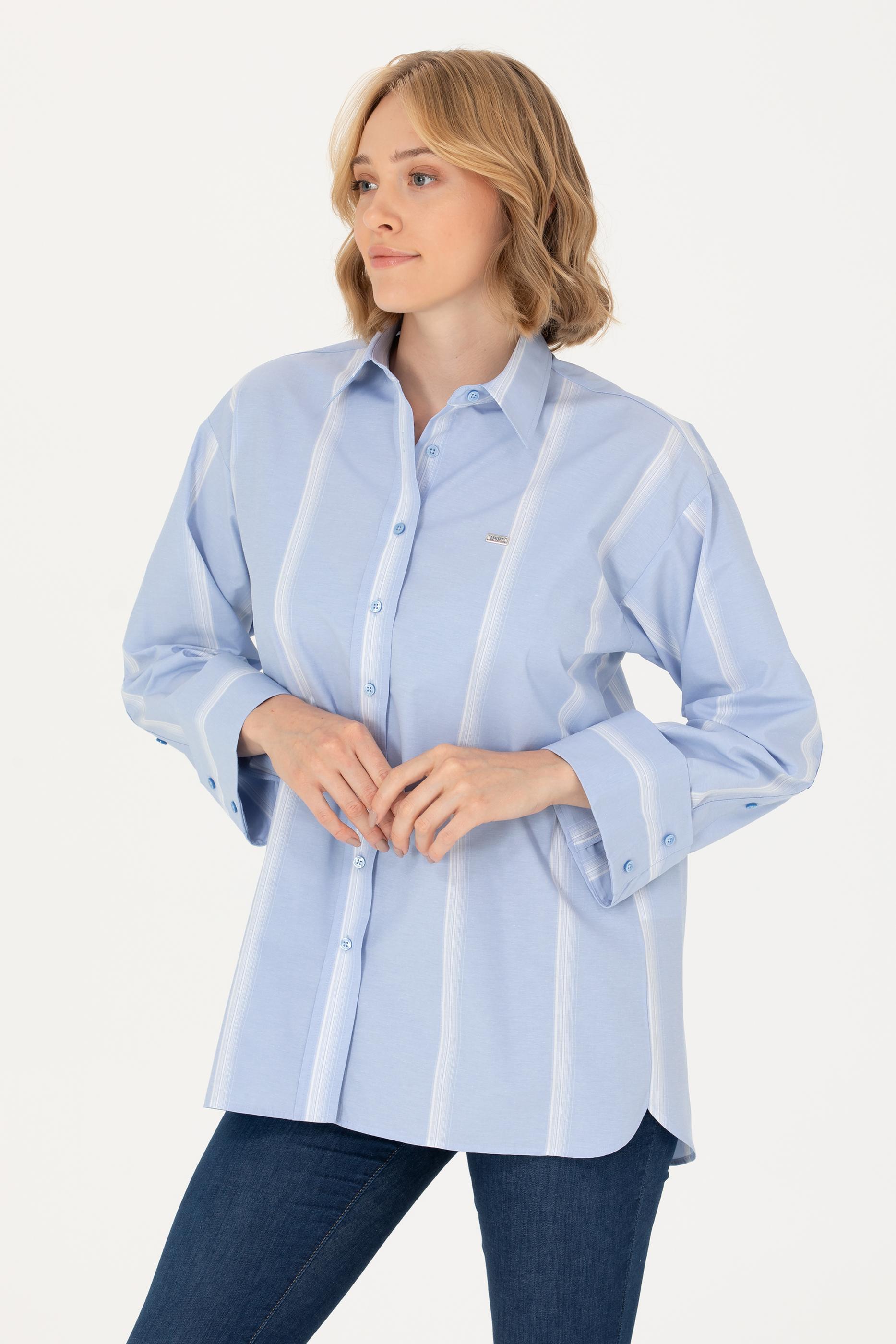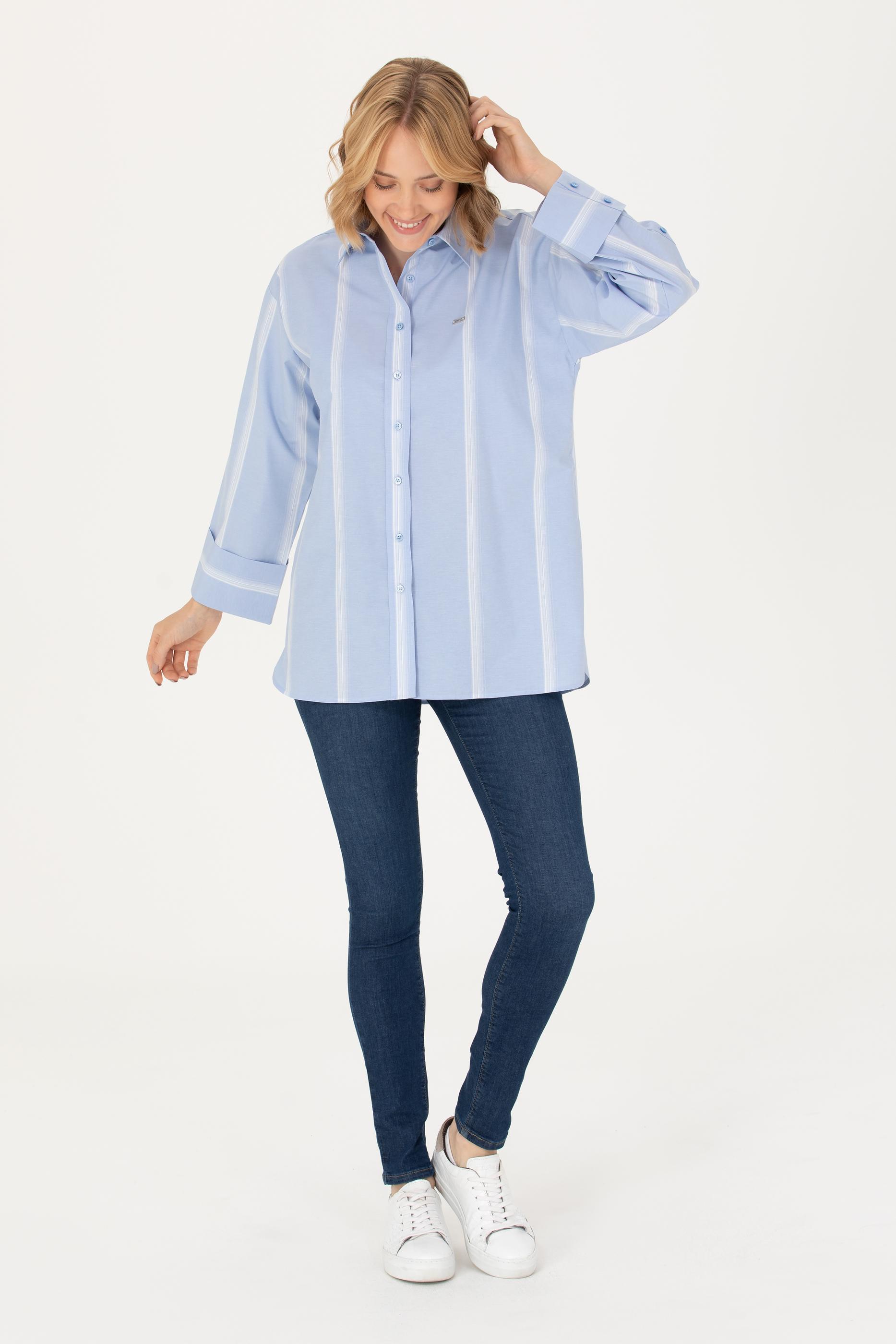 Mavi rengi ve çizgili tasarımıyla modern bir görünüme sahip olan uzun kol gömlek, comfort kalıbı sayesinde rahat bir kullanım sunar. Bu gömlek, %58 pamuk ve %42 poliester karışımıyla üretilmiştir. Bu sayede cildinizi tahriş etmez ve gün boyu konforlu bir şekilde kullanabilirsiniz. Poliester ise dayanıklılık sağlayarak gömleğin uzun süre kullanılmasını sağlar. Sadece online mağazada satılan gömlek modellerini pek çok kıyafetinizle rahatlıkla kombinleyerek kullanabilirsiniz.
