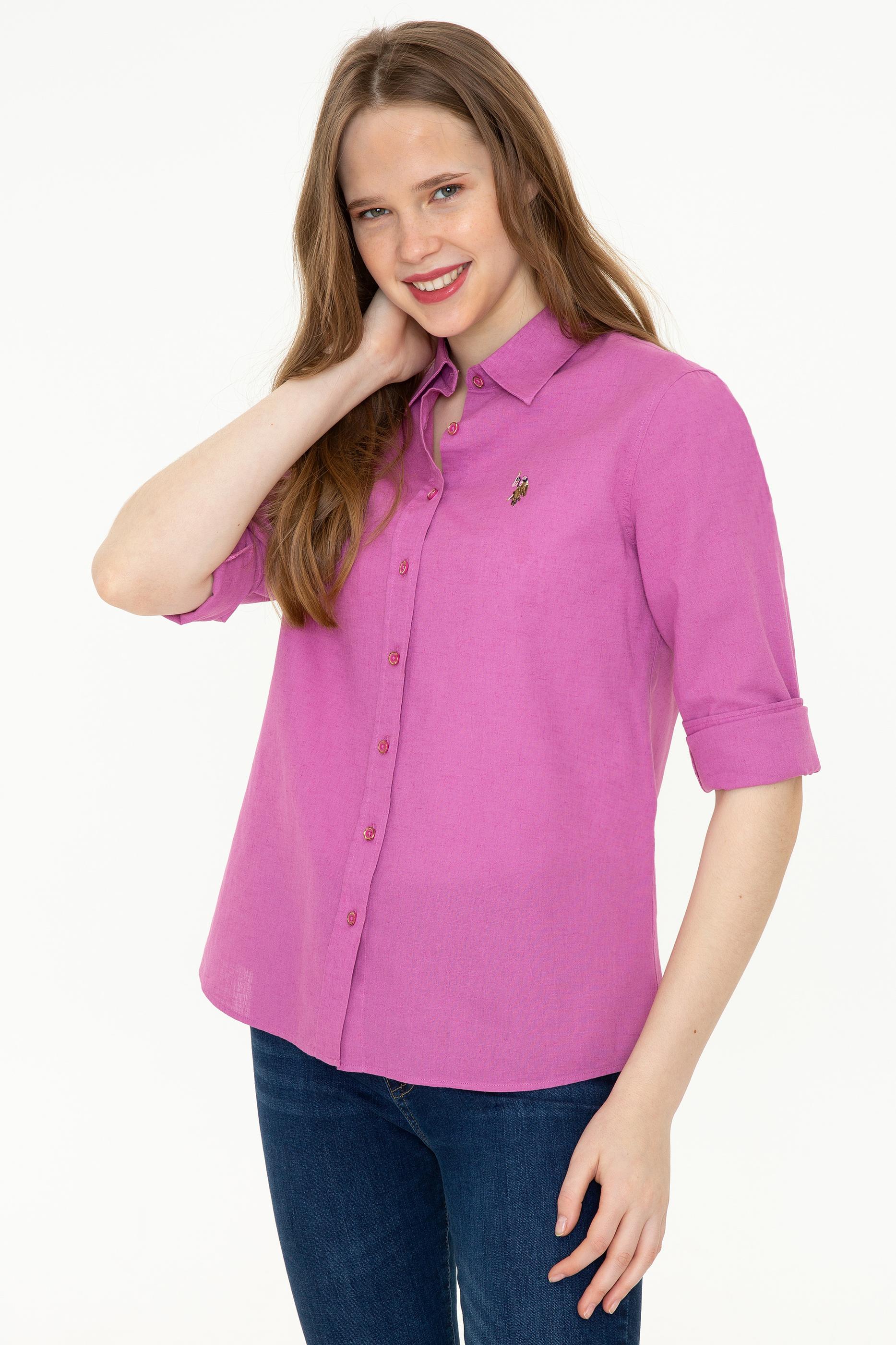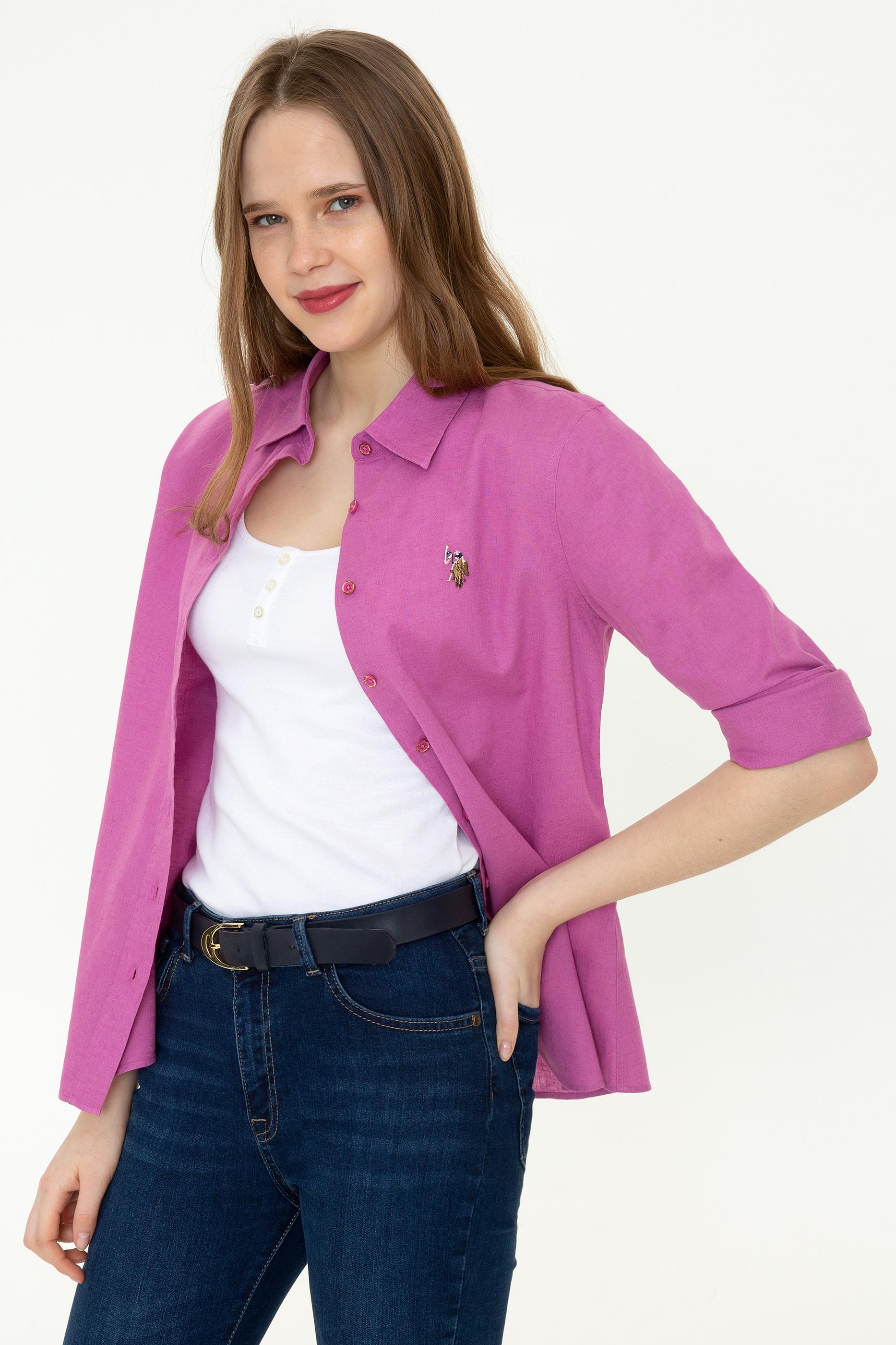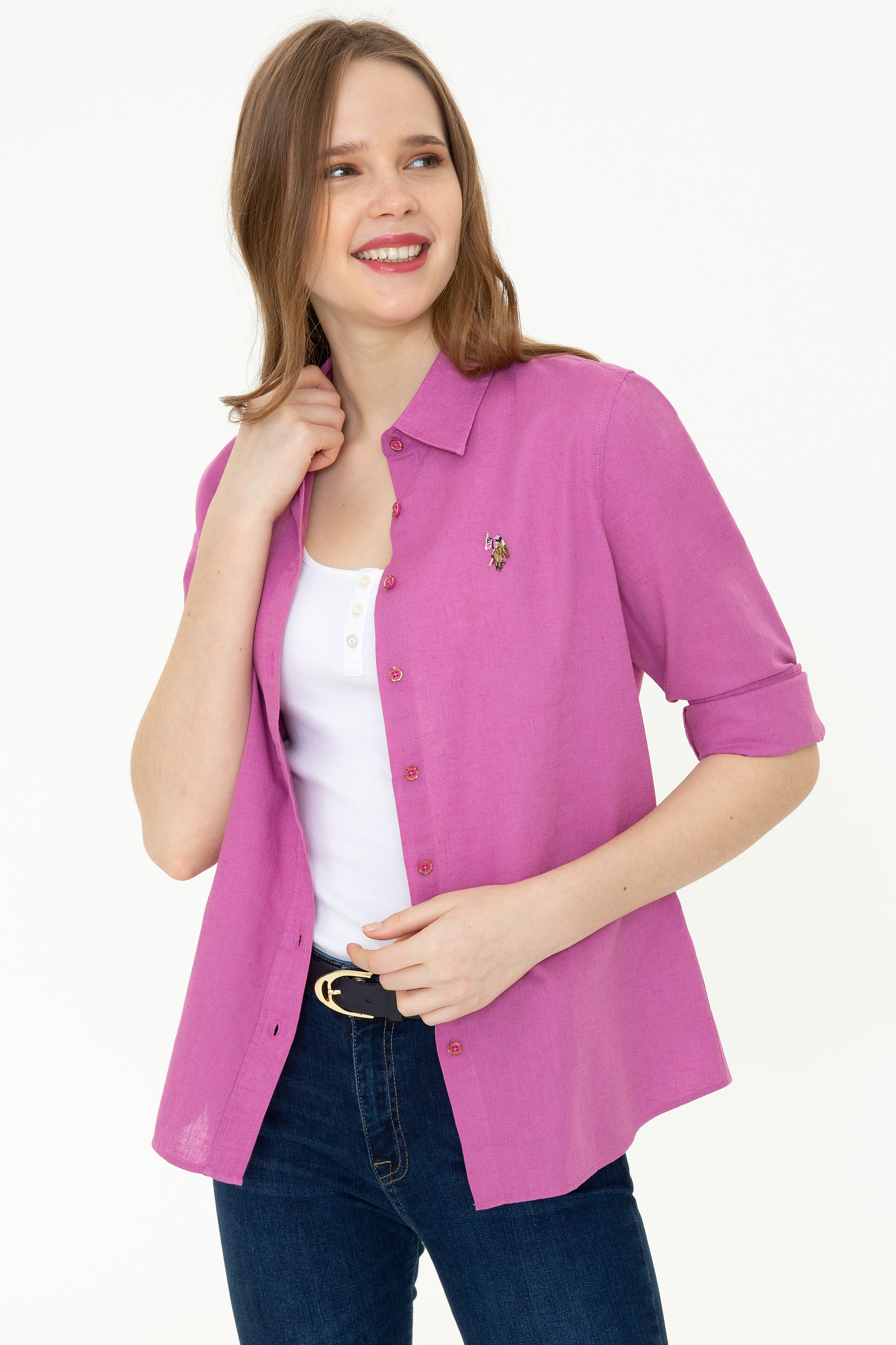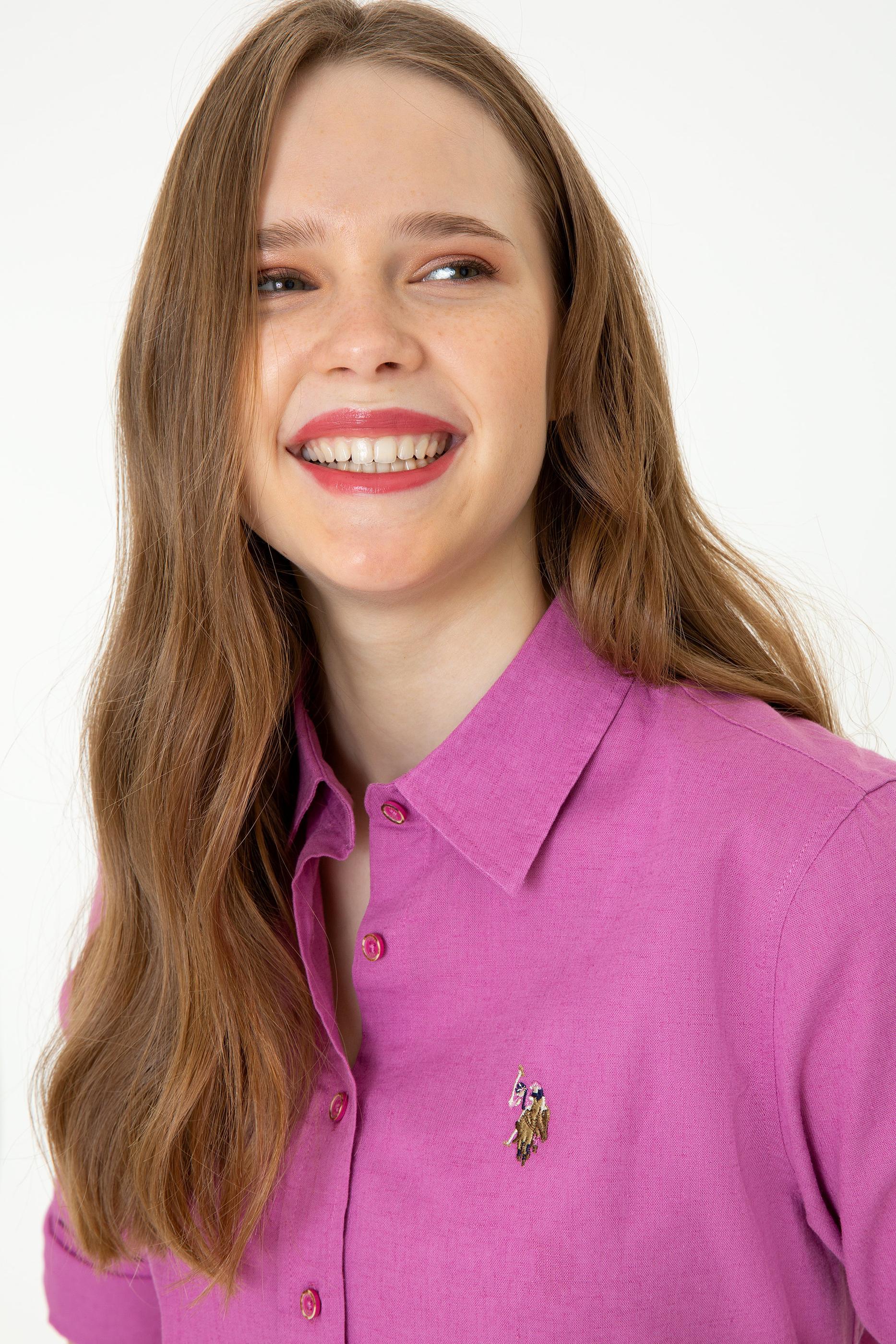 Kadın Menekşe Keten Görünümlü Uzun Kollu Basic Gömlek