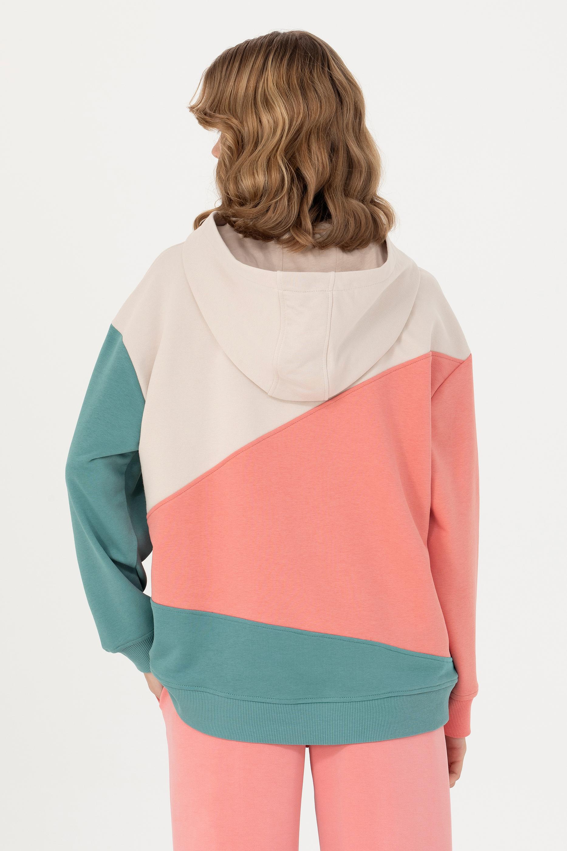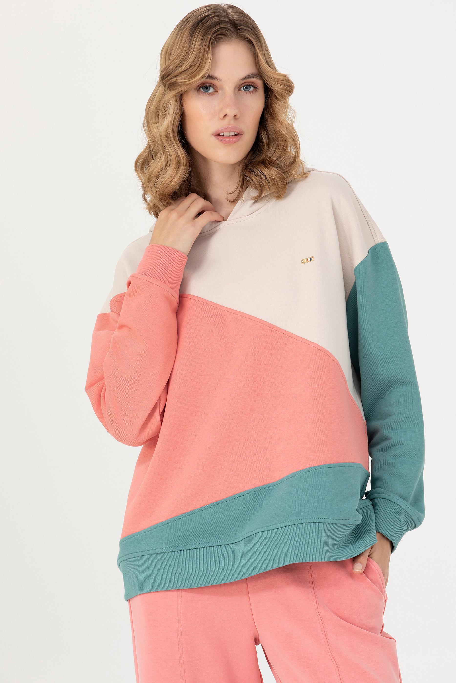 Spor ve casual kombinleri parçalı renkli tasarımı ile özgün hale getirecek kapüşonlu kadın sweatshirt modelimiz sadece Online’a özel satıştadır. Oversize kesime sahip modelimiz, her an konfor arayanların vazgeçilmezlerindendir. Pamuk karışımlı kadın sweatshirt modelimiz, cildin nem dengesini koruyarak gün içinde meydana gelebilecek terlemelere karşı önlem almayı kolaylaştırır.