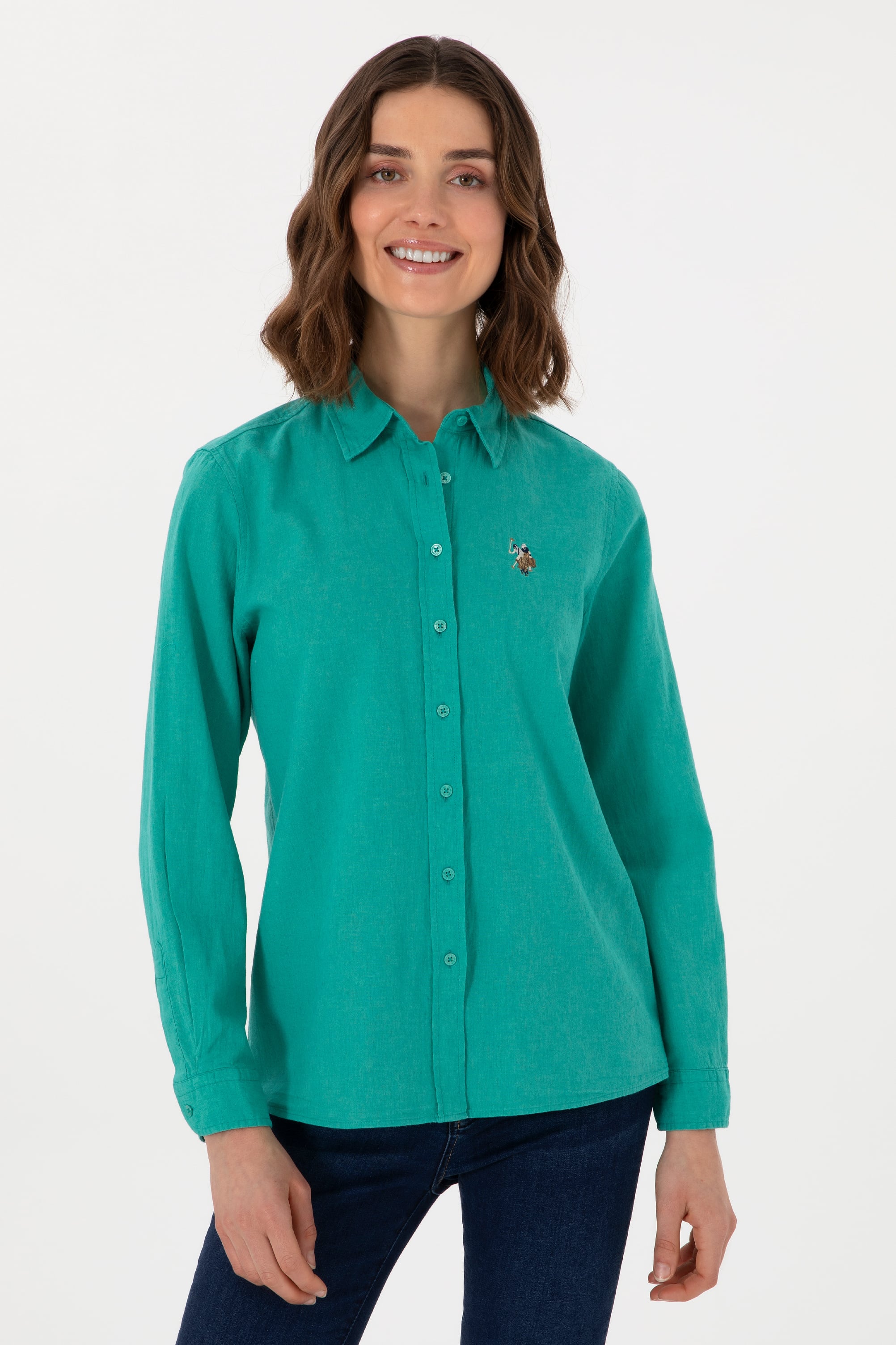 Kadın Mint Keten Karışımlı Uzun Kollu Basic Gömlek