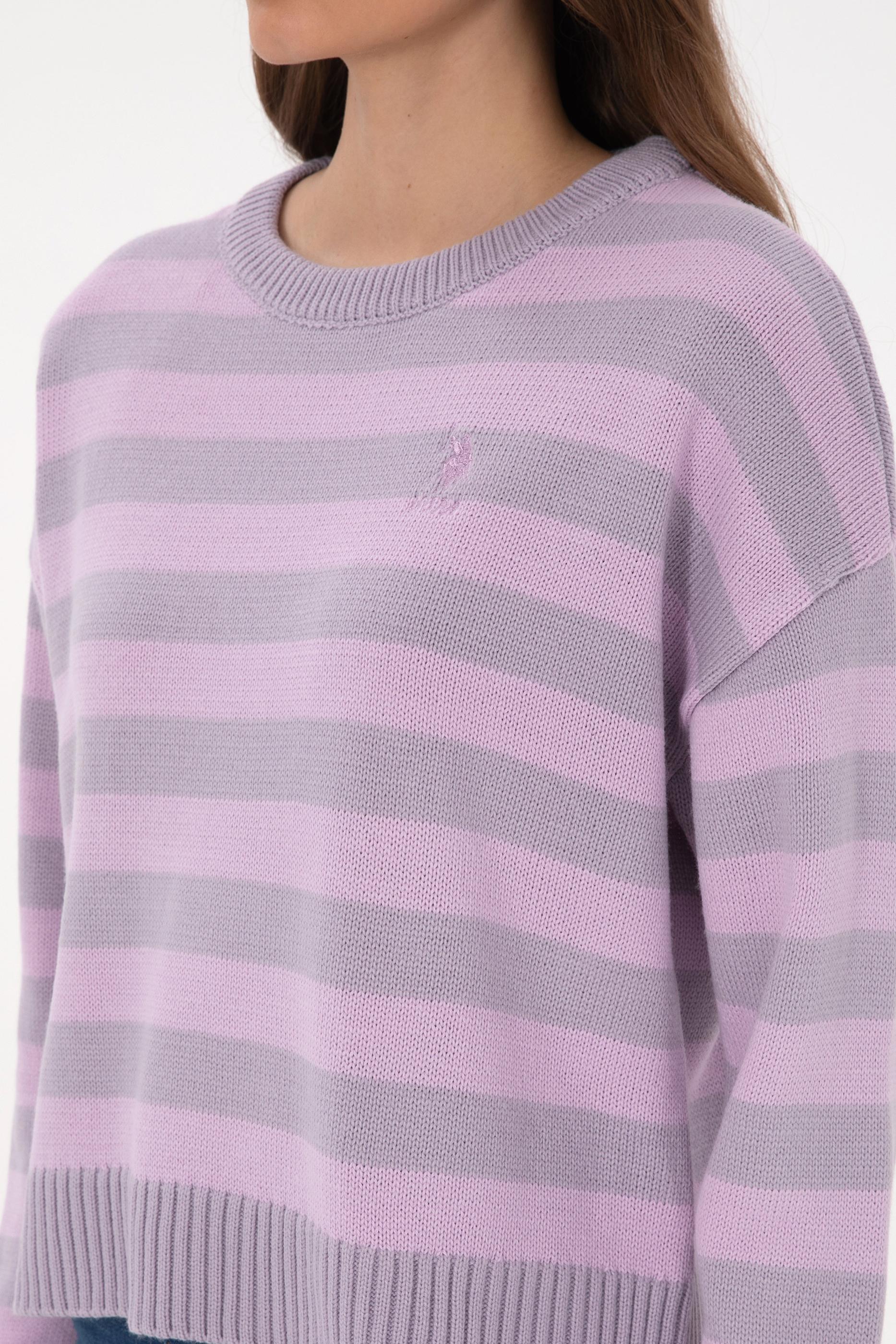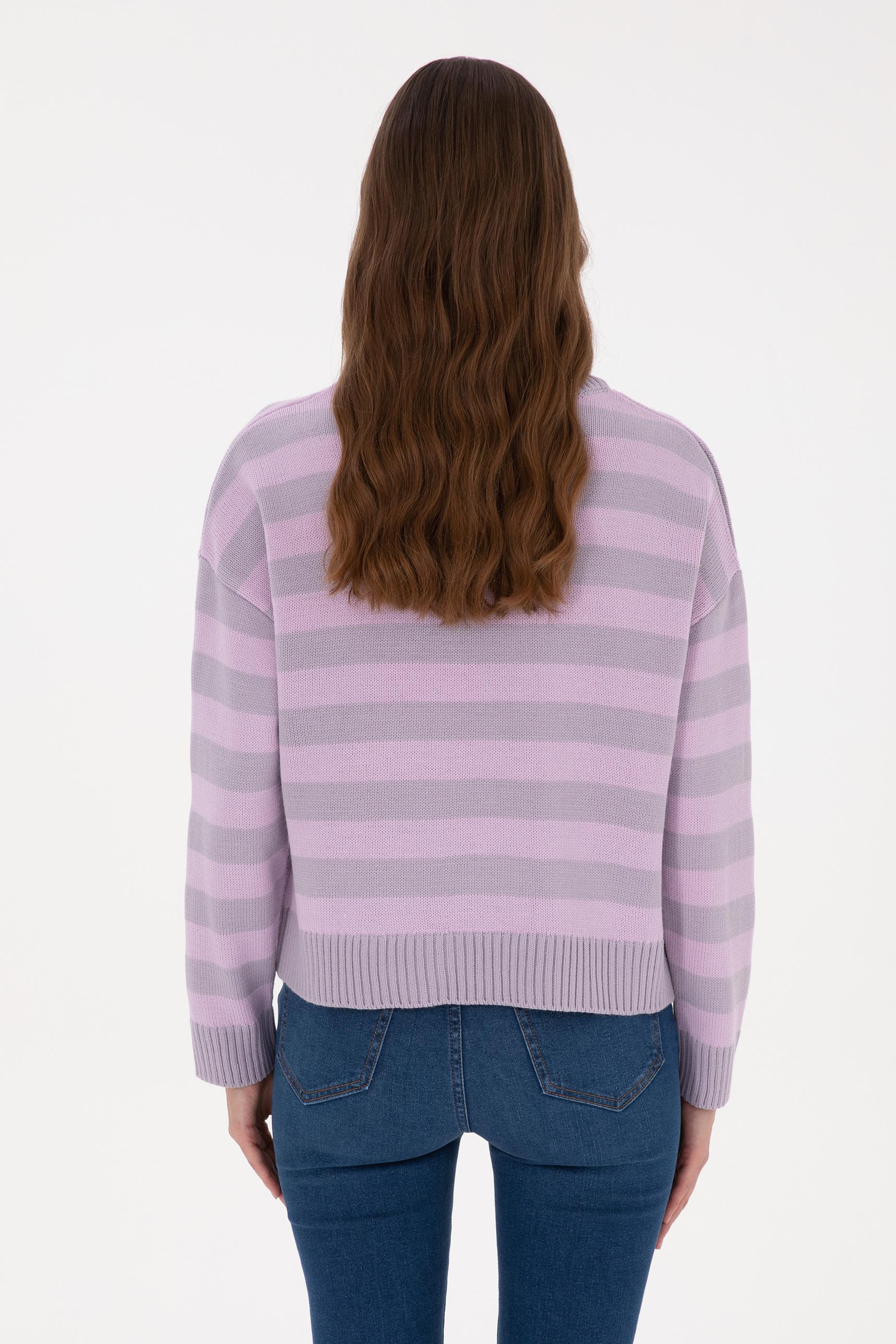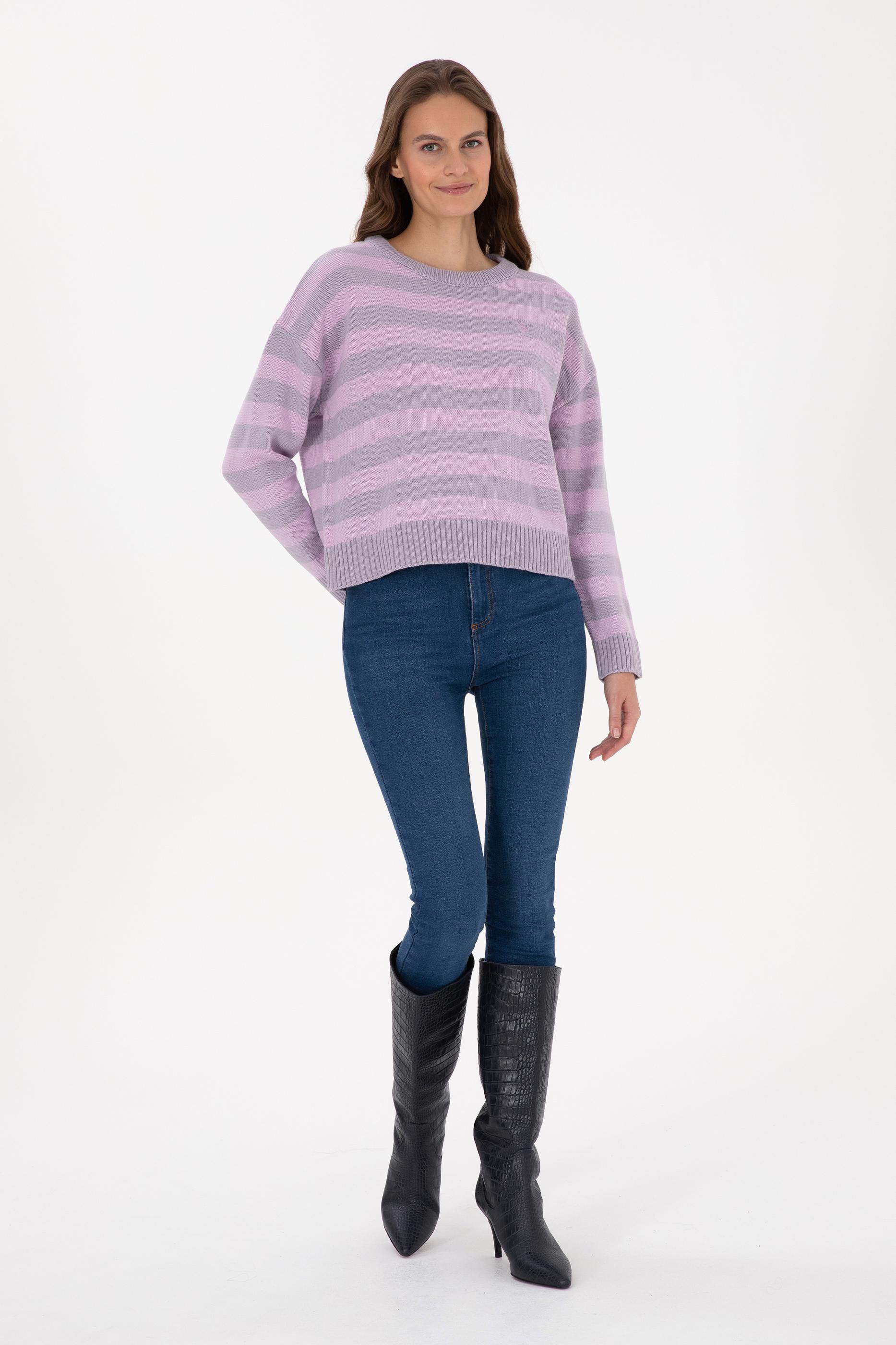 Kadın Mor Çizgili Bisiklet Yaka Kazak