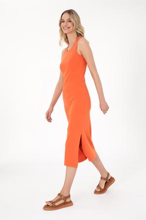 U.S. Polo Assn. imzasını taşıyan bu turuncu renkli kolsuz elbise, %100 pamuklu dokusu sayesinde cilde nefes aldıran doğal bir konfor sunar. Yumuşak ve esnek örme kumaşıyla gün boyu rahatlık sağlarken, vücuda zarifçe oturan formu ve midi boy kesimiyle sade ama etkileyici bir görünüm kazandırır. Bisiklet yaka detayı ve etek ucundaki yırtmaç hareket özgürlüğünü artırırken, minimal tarzı sayesinde hem sandalet hem sneaker’la zahmetsizce şıklık sağlar. Hafif yapısı ve doğal dokusuyla yaz mevsiminin favori parçalarından biridir.