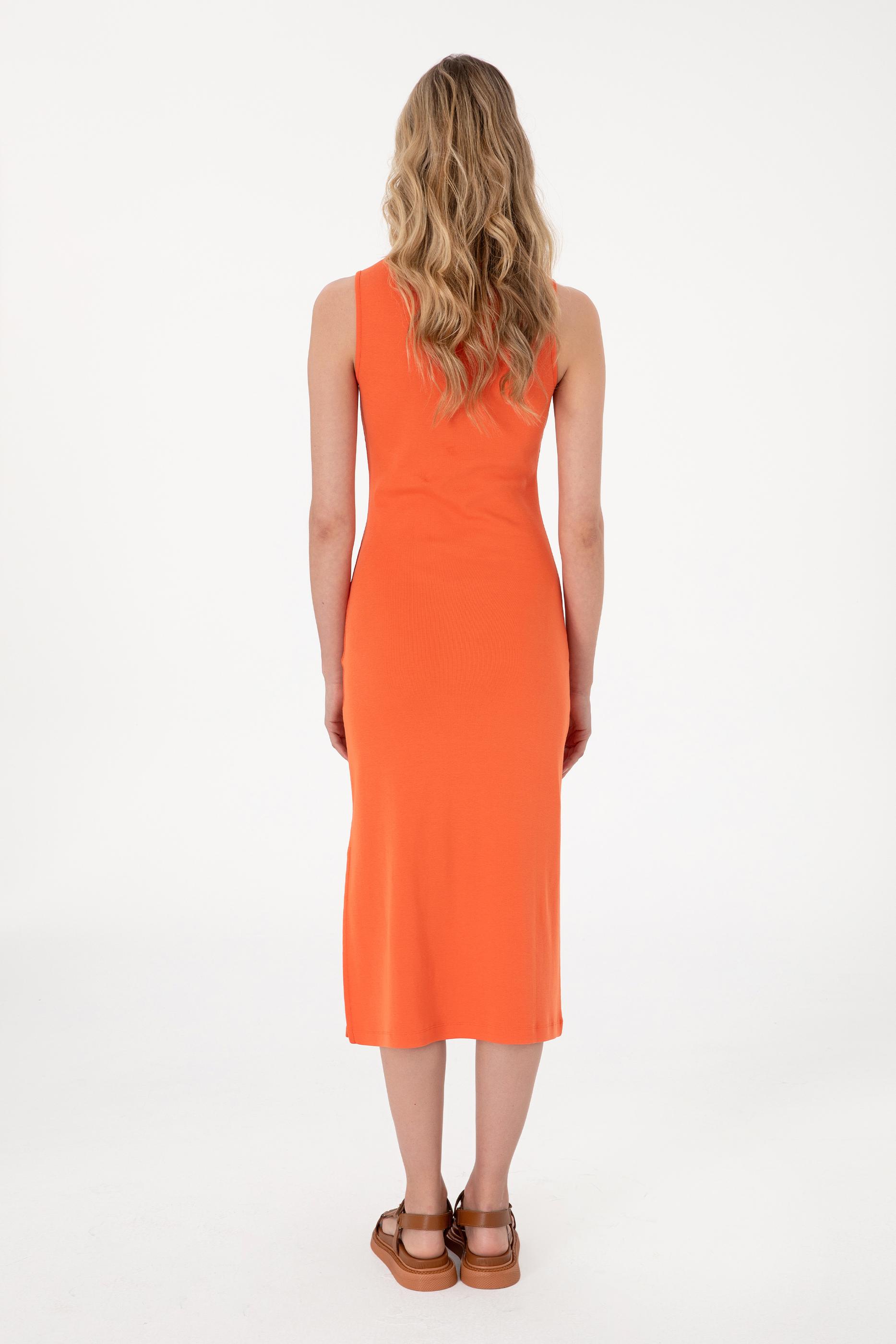 Kadın Nar Çiçeği Yırtmaçlı Kolsuz Bisiklet Yaka Midi Boy Örme Elbise