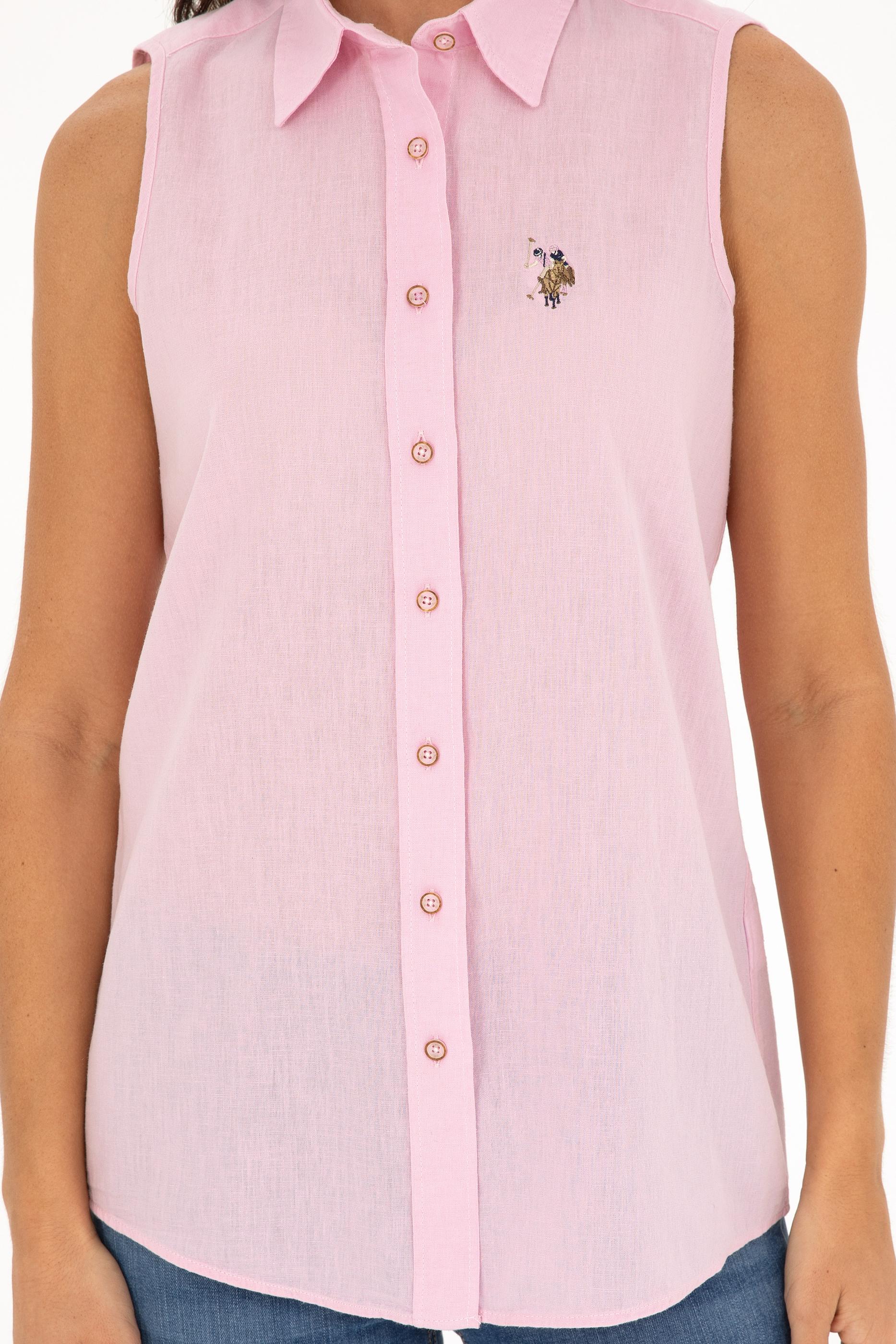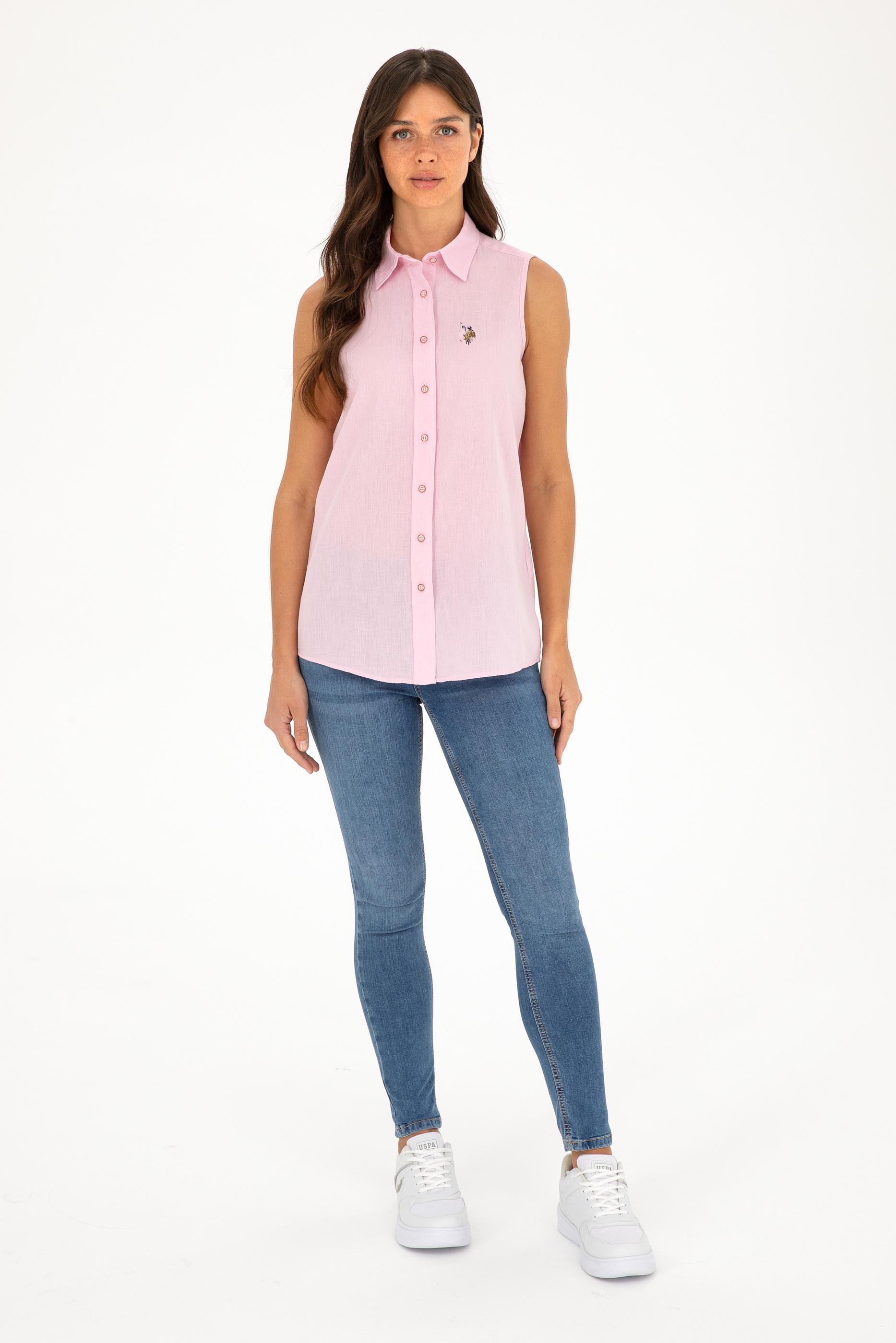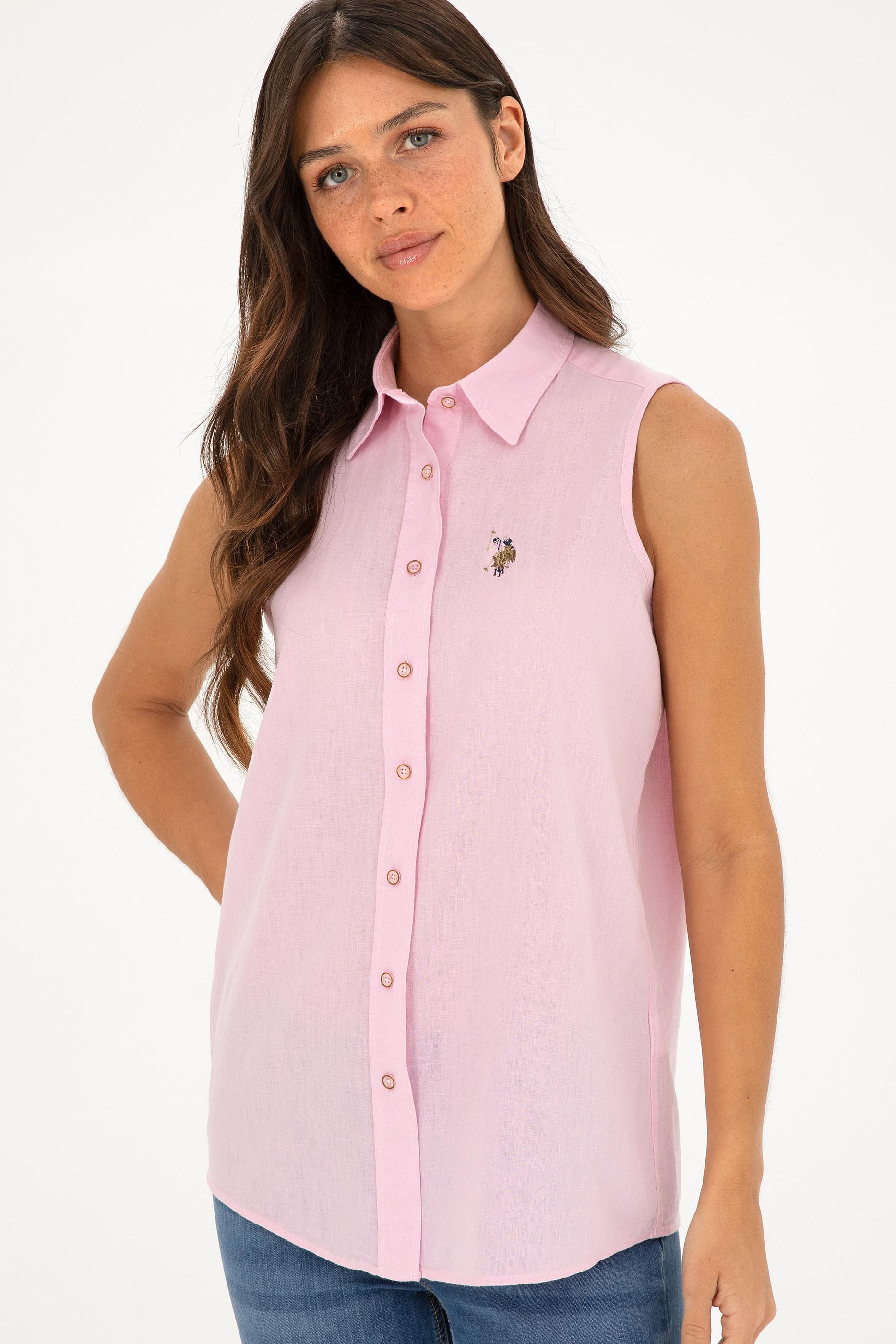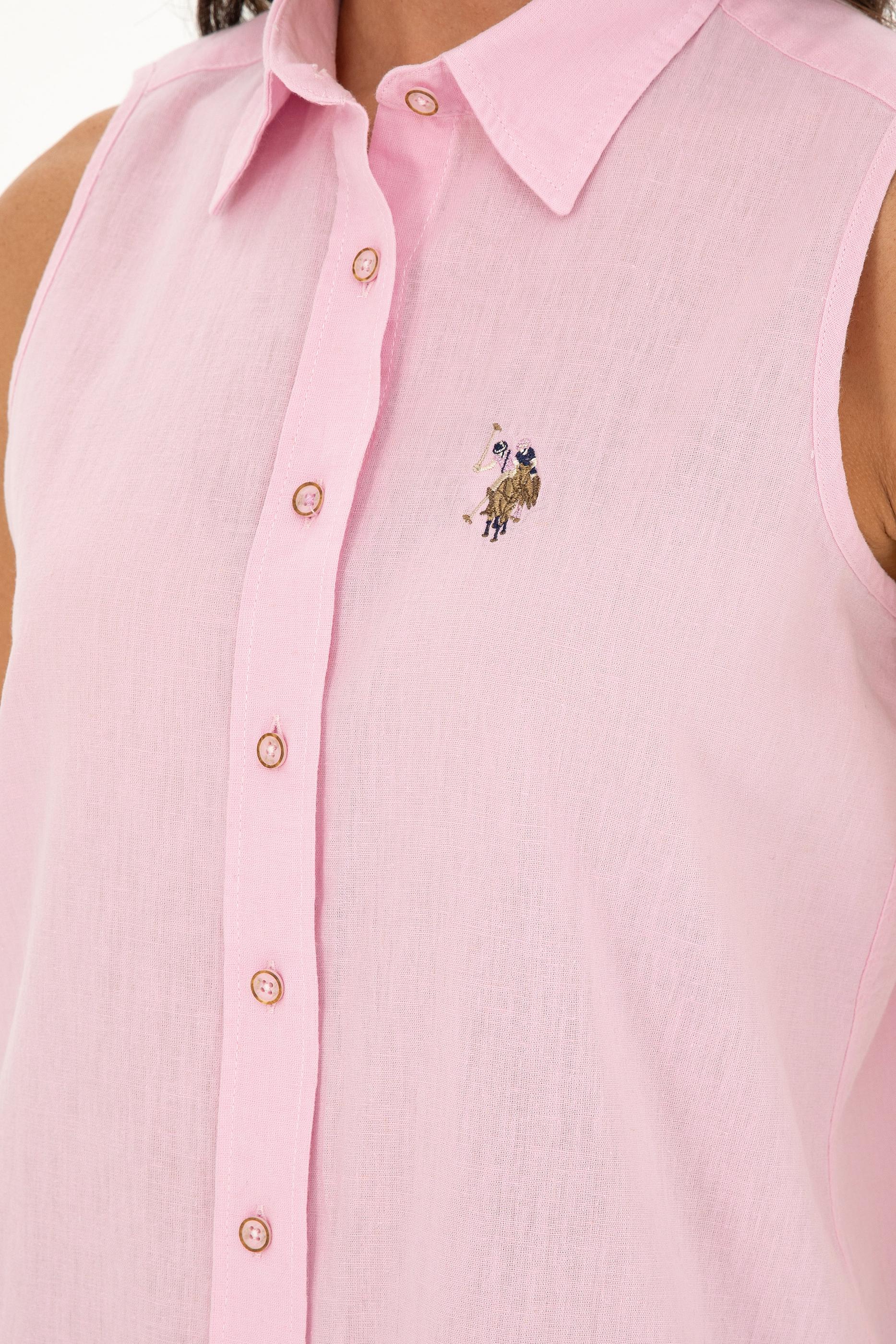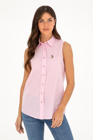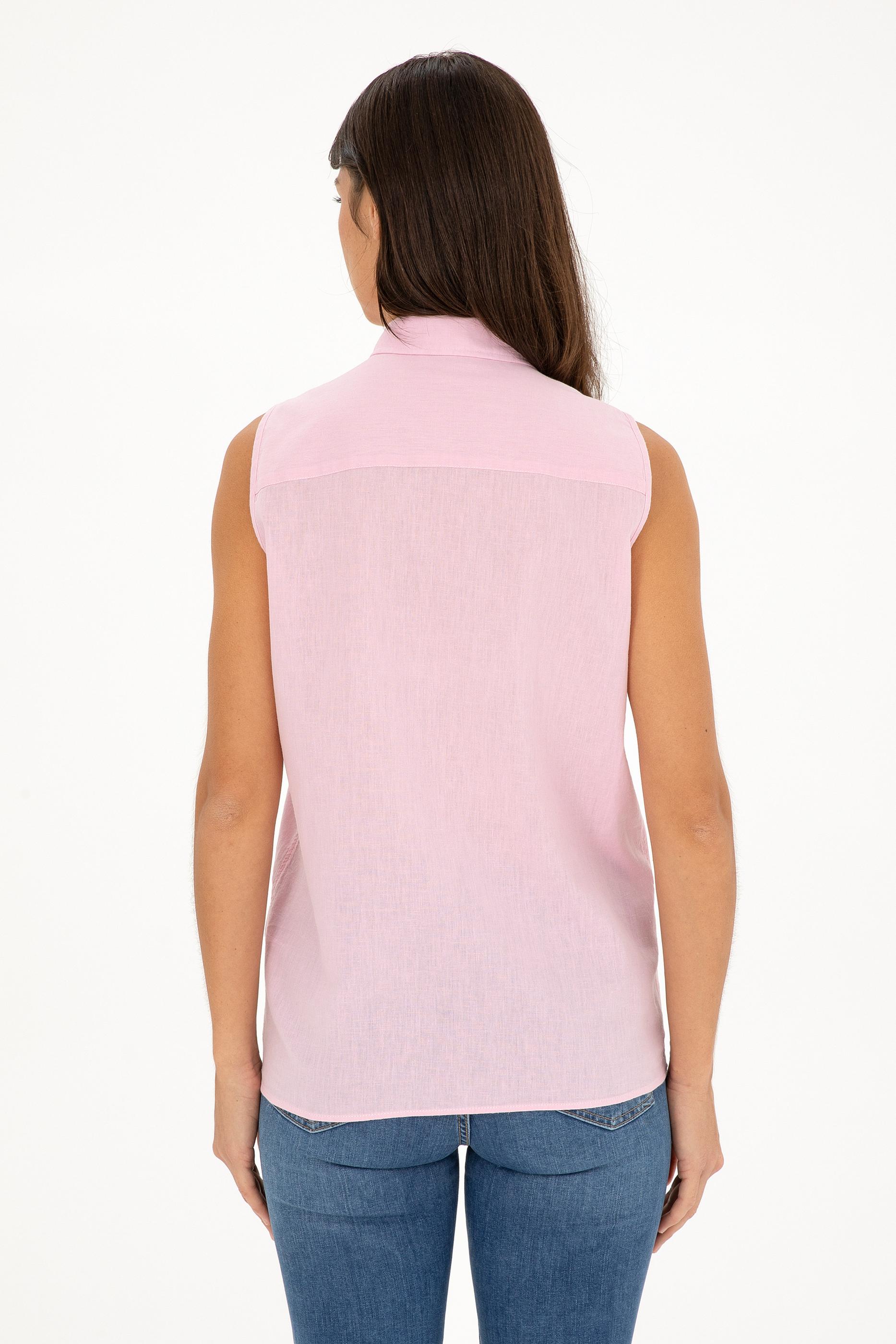 Kadın Pembe Keten Görünümlü Kısa Kollu Gömlek