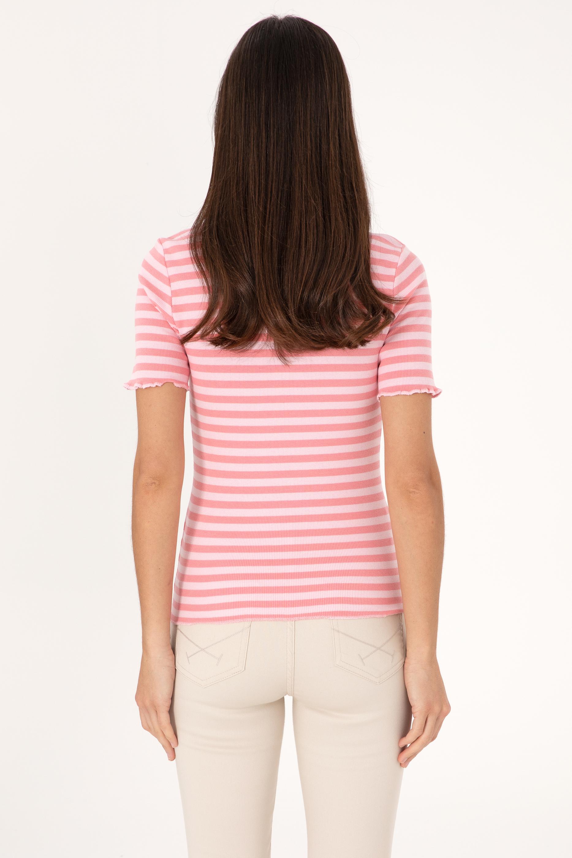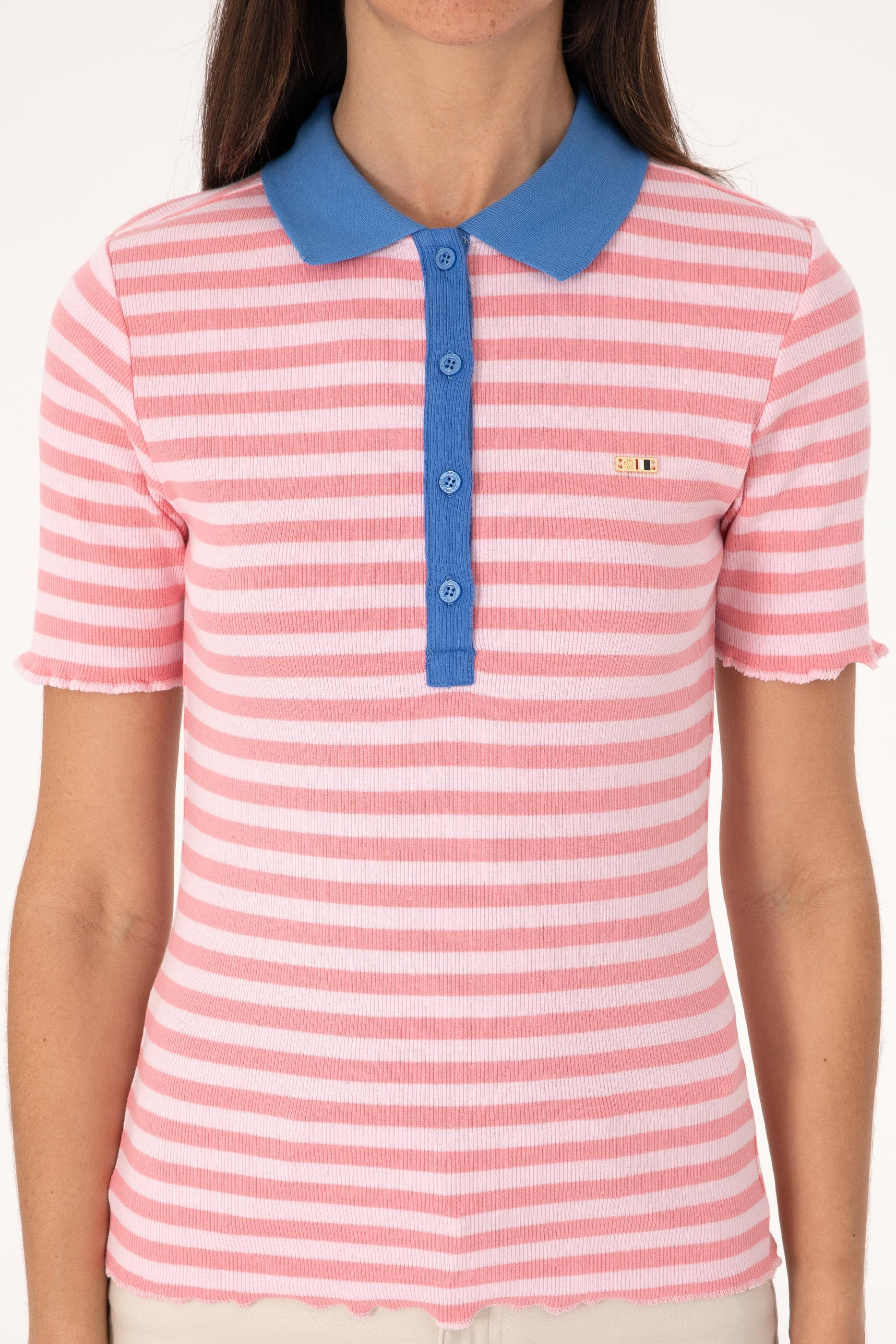 - Kadın Pembe Çizgili Polo Yaka Tişört