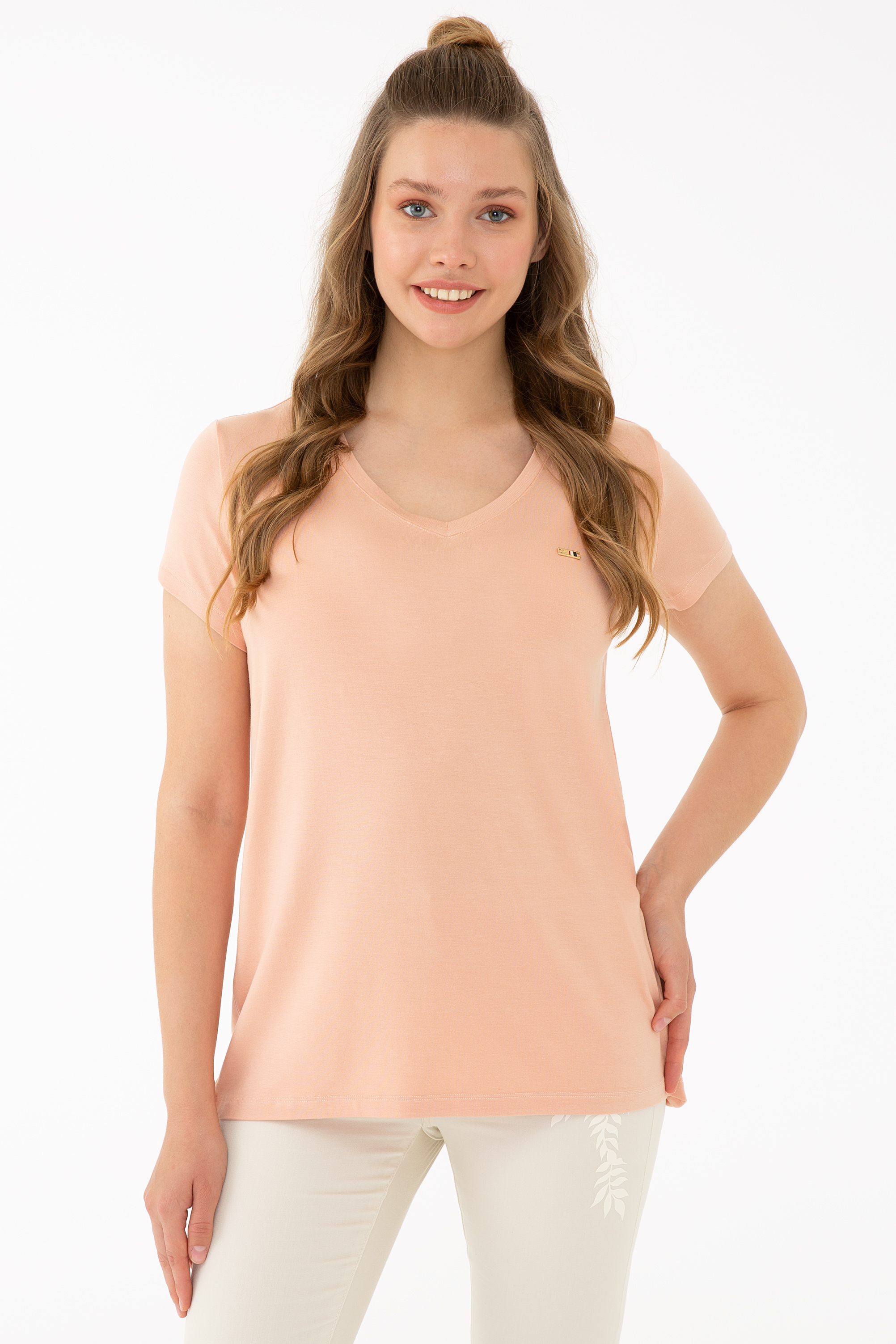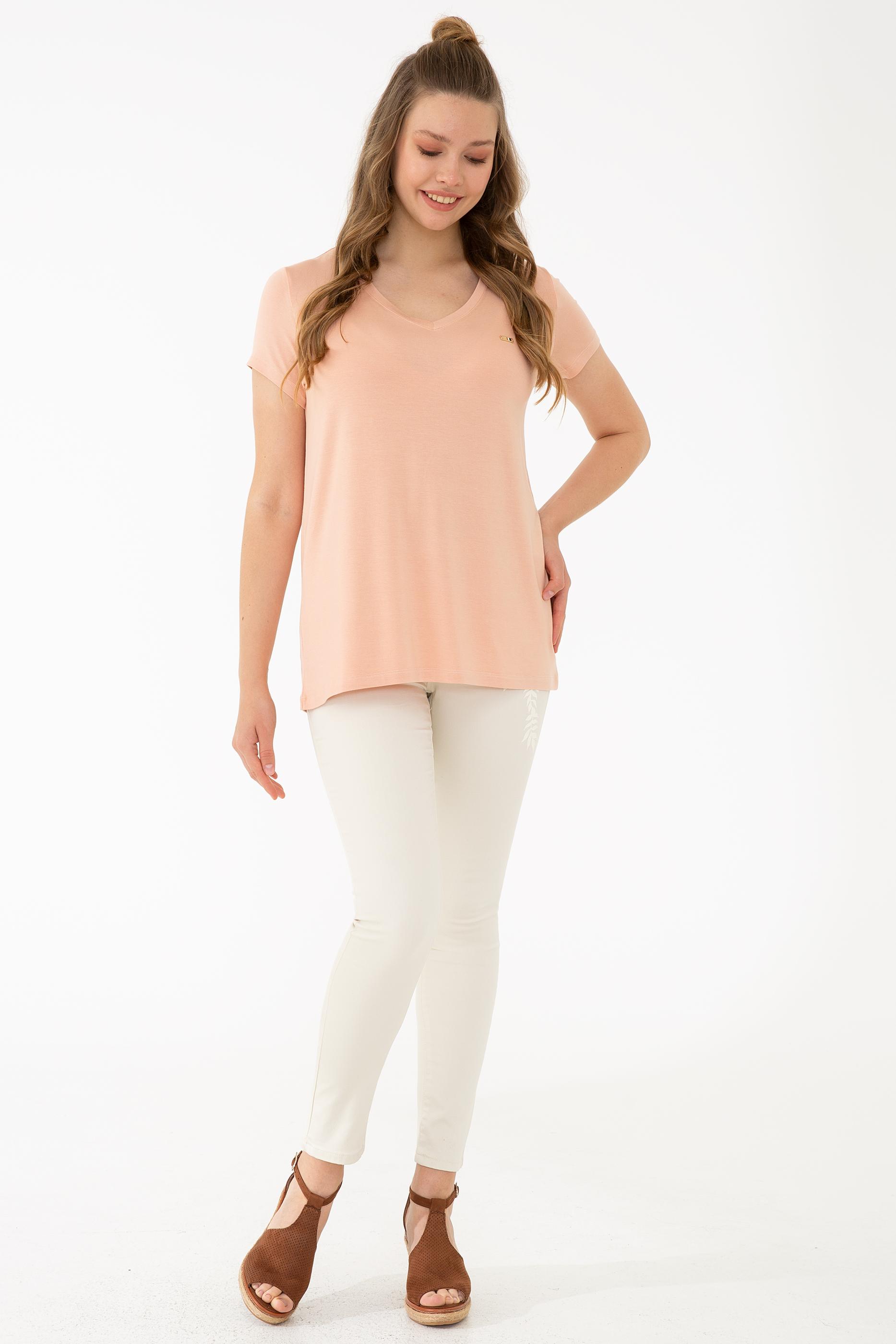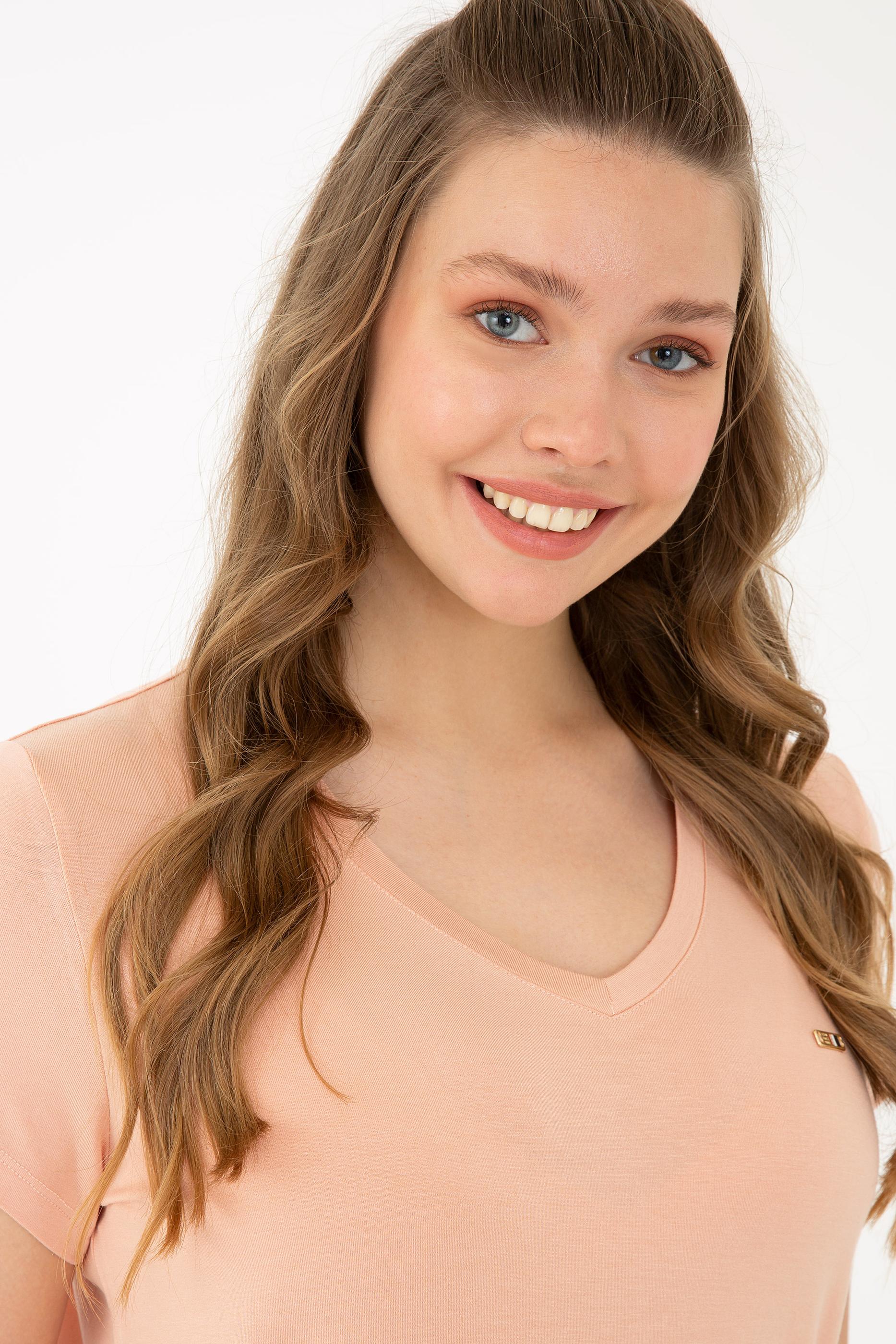 Kadın Pudra Basic V Yaka Tişört