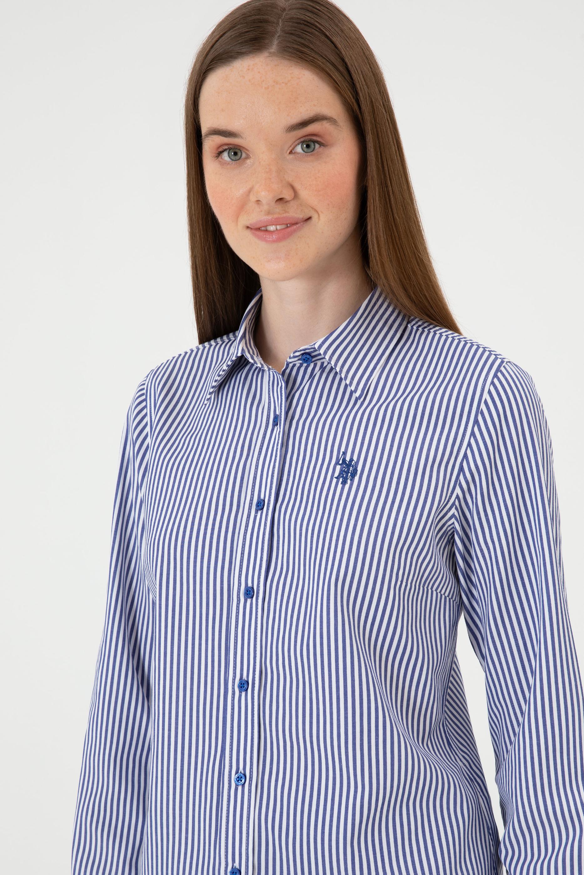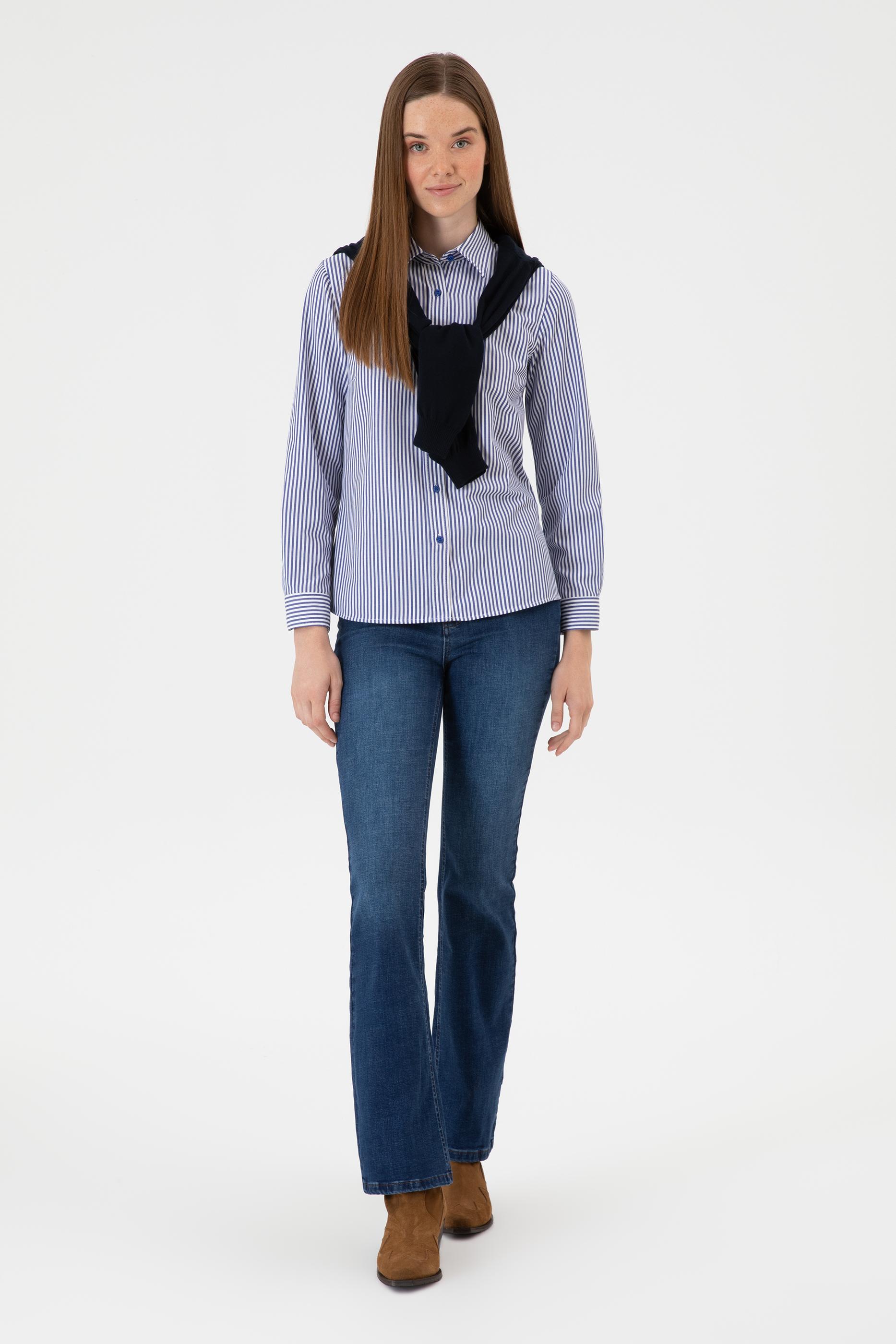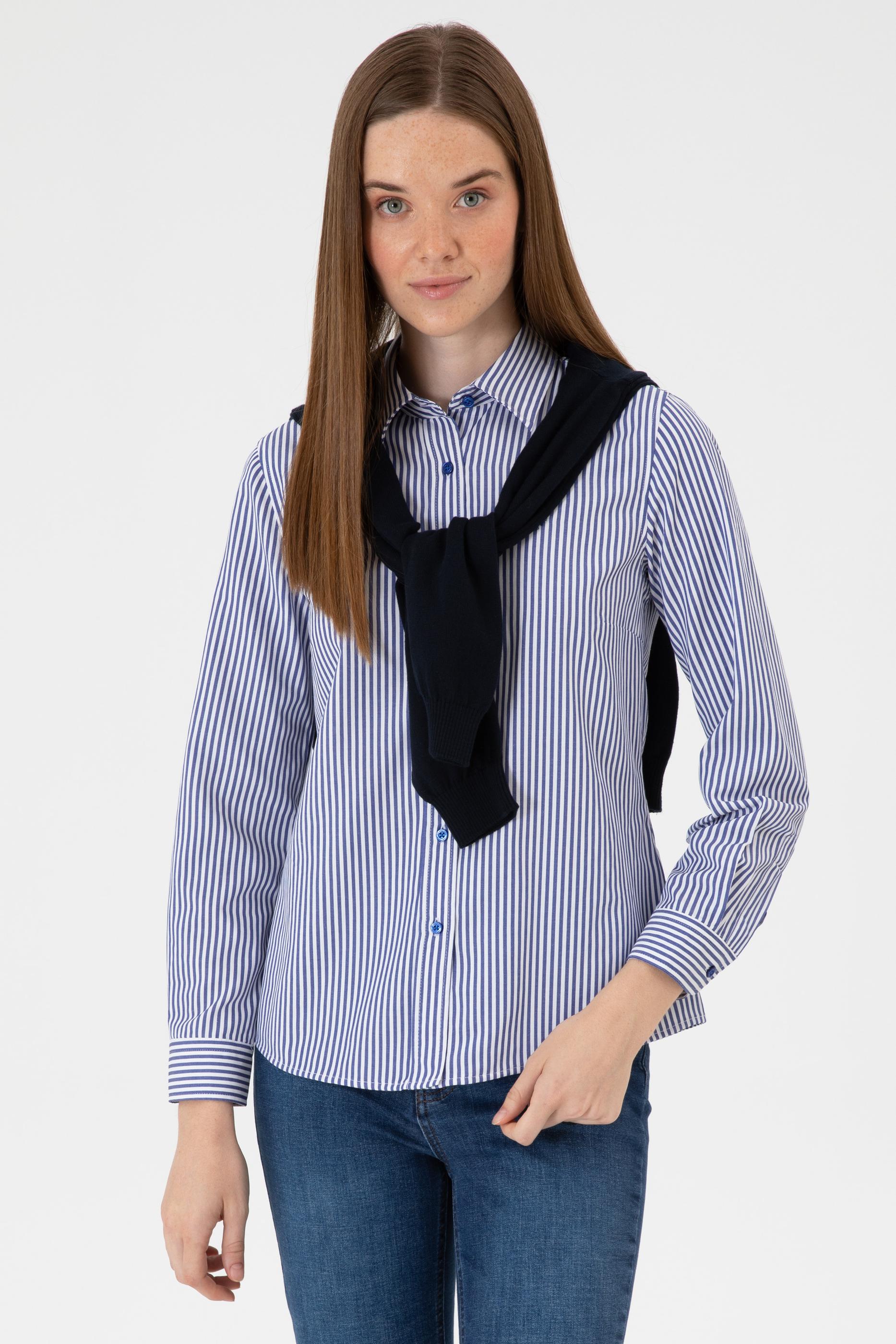- Kadın Saks Çizgili Uzun Kollu Gömlek