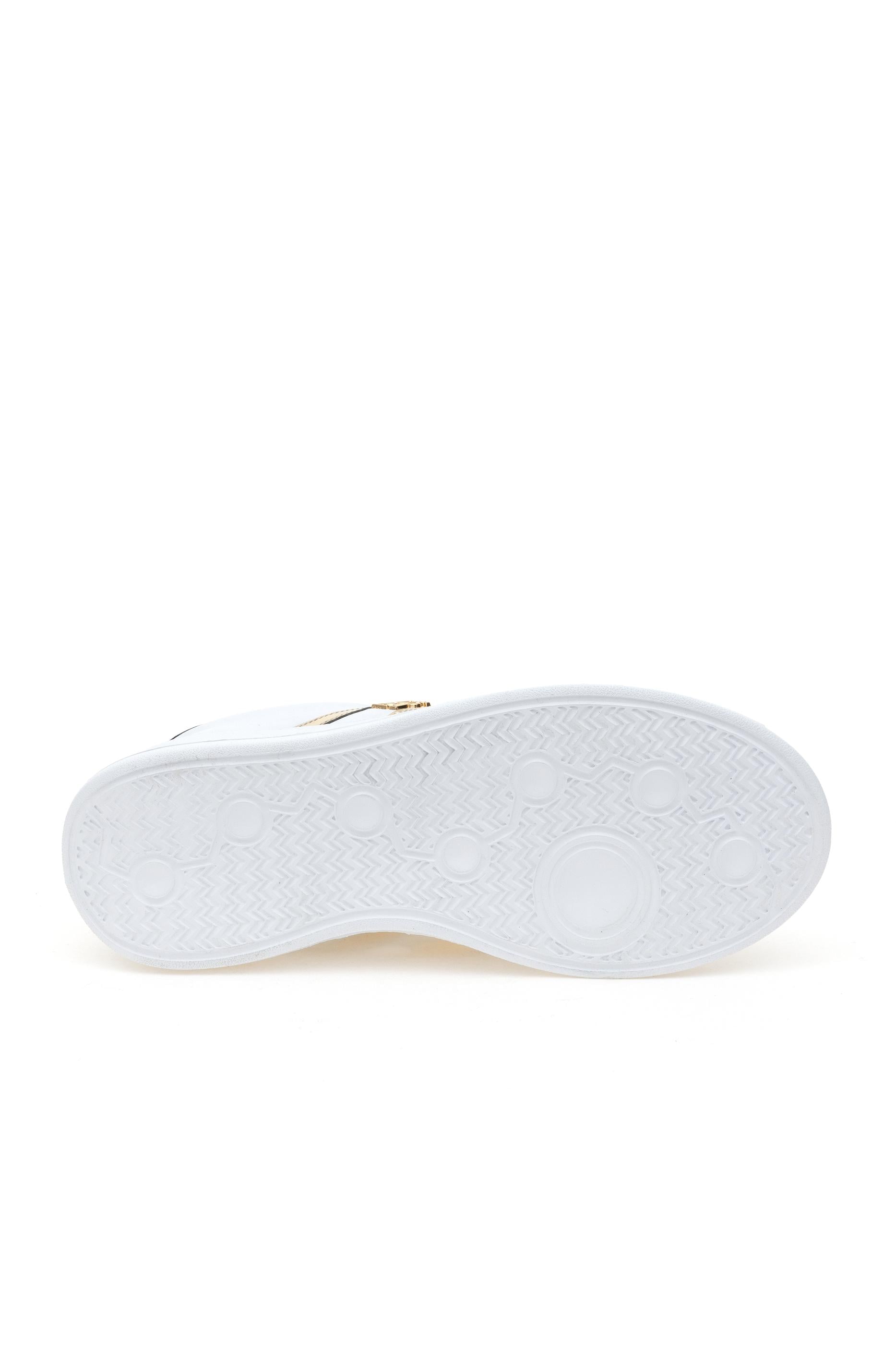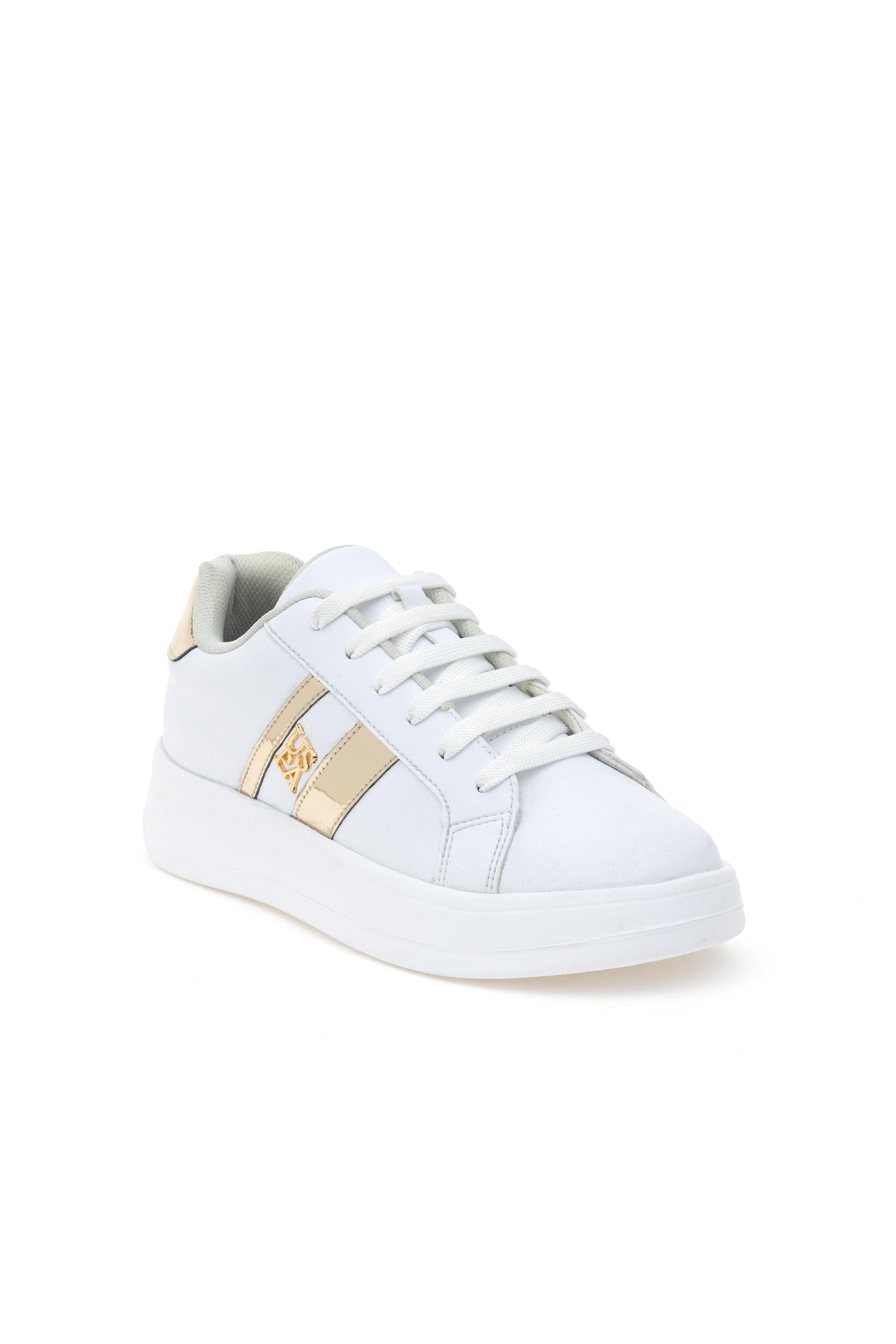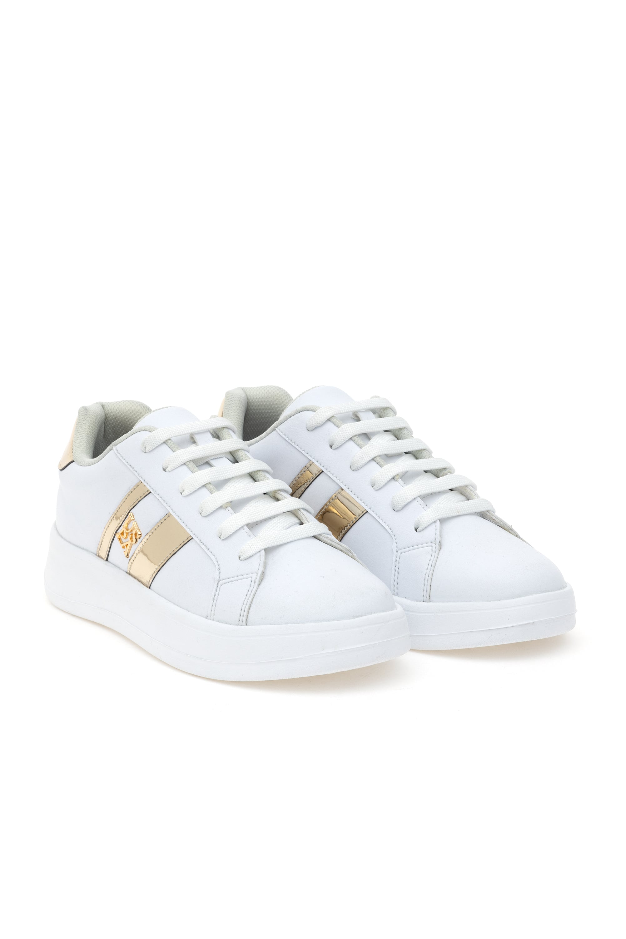 Hafifliği ve şık detaylarıyla dikkat çeken kadın sneaker, beyaz ve altın renk uyumuyla zarif bir görünüm sunar. Günlük kullanımda rahatlık sağlarken, modern tasarımıyla stil sahibi bir duruş kazandırır. Sneaker, yumuşak dokulu üst yüzeyiyle ayağı nazikçe sararak konforlu bir deneyim sunar. Deri görünümlü materyali, dayanıklılığı artırırken pürüzsüz bir his bırakır. Bağcıklı yapısı sayesinde ayağa tam uyum sağlayarak destekleyici bir yapı sunar. Yan kısımlarda yer alan altın rengi şerit detayları, modeli hareketlendirerek dinamik bir tarz oluşturur. Aynı zamanda küçük metal logo detayı, tasarıma şık bir dokunuş ekler. Taban kısmı, yürüyüş sırasında dengeyi koruyan hafif ve esnek bir yapıya sahiptir. Kalın ve yumuşak orta taban, ayağı yormadan uzun süreli konfor sunar. Beyaz renkli dış tabanı, zemin tutuşunu artıran özel bir malzemeyle üretilerek güvenli bir kullanım sağlar. İç astarı ise nefes alabilen bir yapıya sahip olup, gün boyu ferahlık hissi sunar. Altın detaylarla hareketlendirilen sneaker modeli, sade ama etkileyici bir tarz arayanlar için ideal bir seçenek sunar. Günlük kombinlerden sportif şıklığa kadar geniş bir kullanım alanına uyum sağlayarak, her adımda konfor ve estetik bir denge oluşturur.