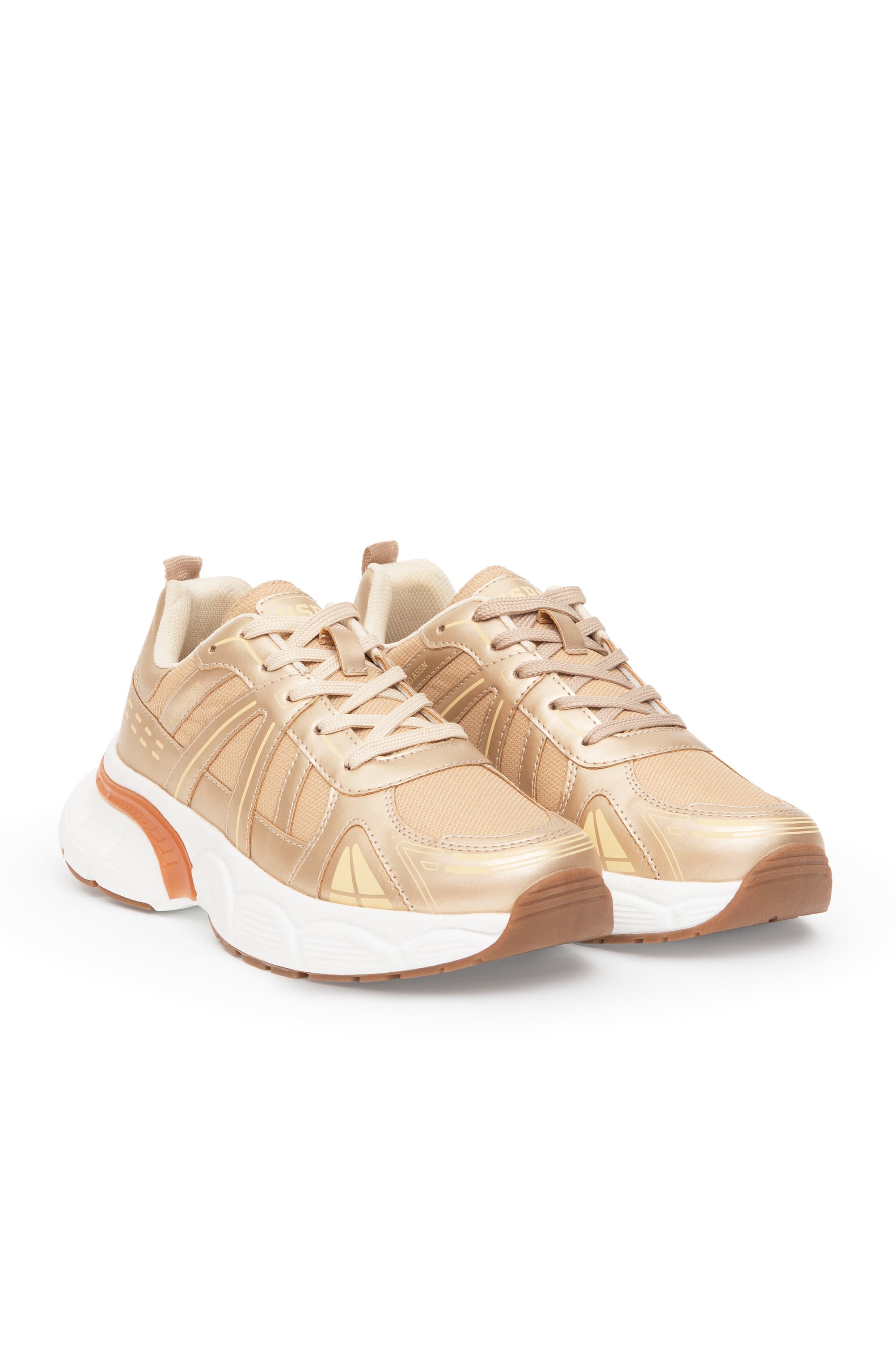 Işıltılı altın tonlarıyla dikkat çeken bu sneaker, spor rahatlığını modern bir stil anlayışıyla birleştiriyor. Standart formu, ayağı dengeli bir şekilde kavrayarak uzun süreli kullanımlarda konfor sunarken, kalın ve destekleyici tabanı adımlarınıza ekstra yumuşaklık katıyor. File ve deri görünümlü panellerin kombinasyonu, hem nefes alabilirlik hem de dayanıklılık sağlıyor. Yan kısımlardaki metalik efektli çizgiler ve arka bölümdeki şeffaf detay, tasarıma dinamik ve trend bir görünüm kazandırıyor. Hem günlük şehir stiline hem de spor kombinlere uyum sağlayan bu model, dikkat çekici renk geçişleriyle fark yaratmak isteyenler için ideal bir seçenek. Sadece online’a özel olarak sunuluyor.