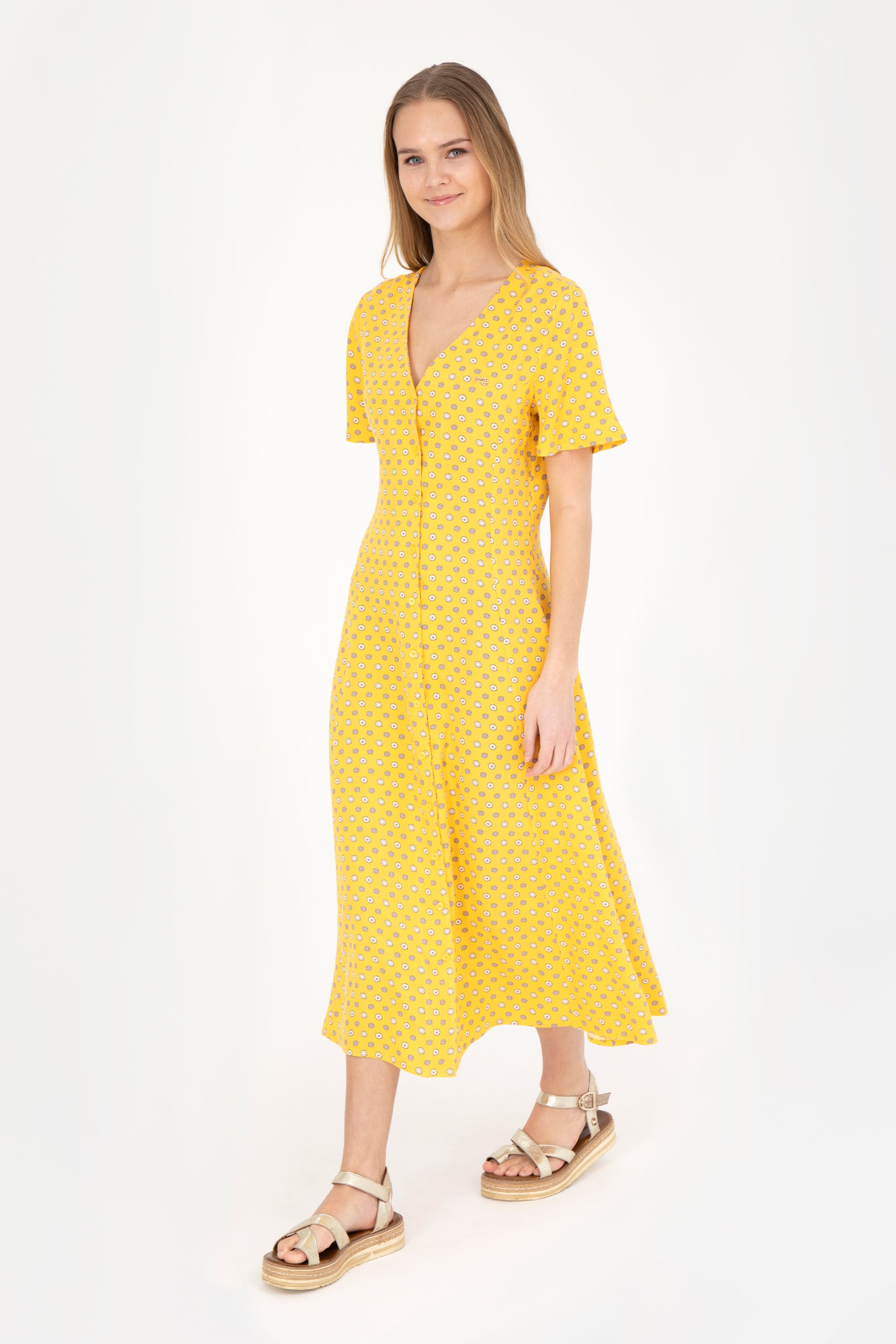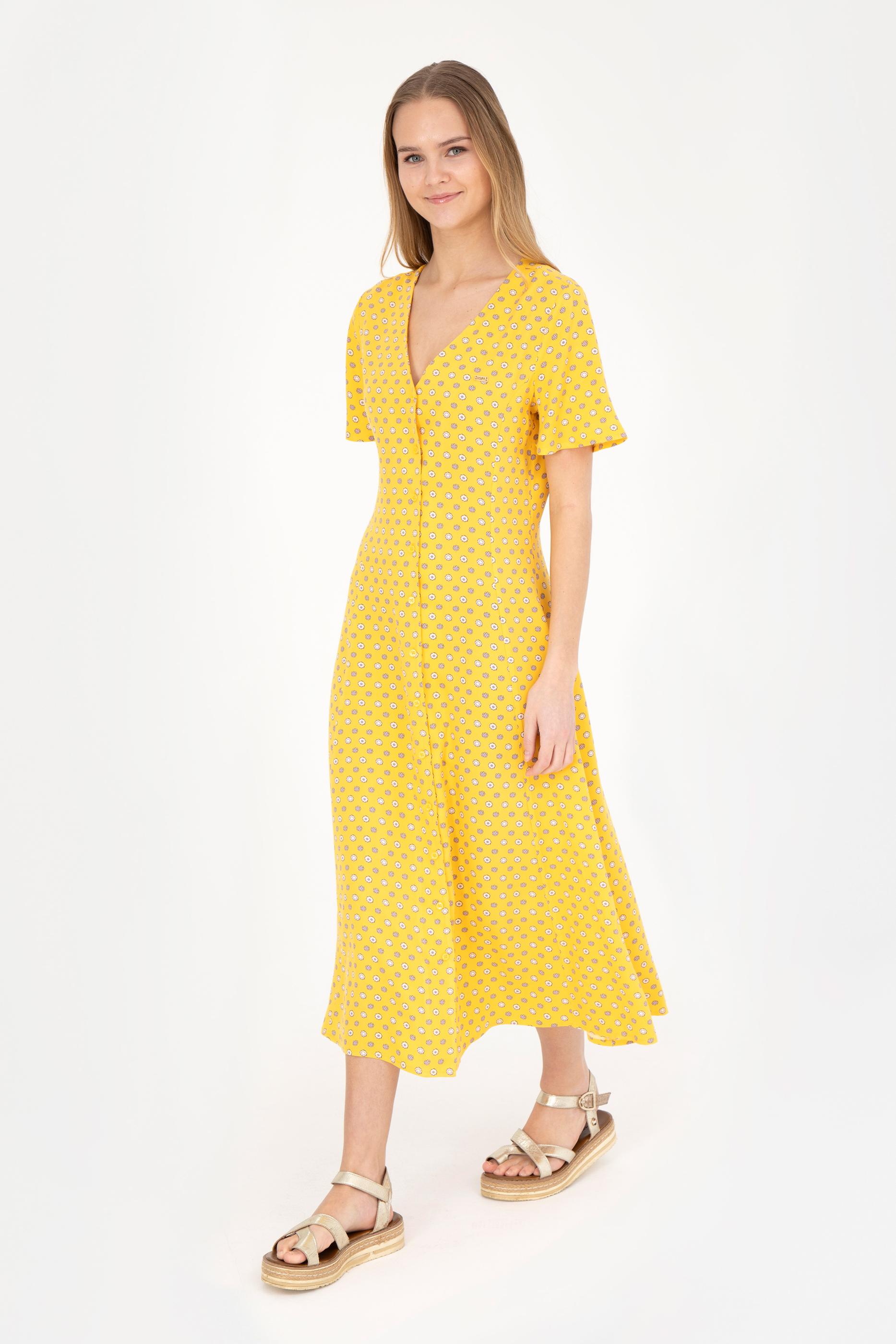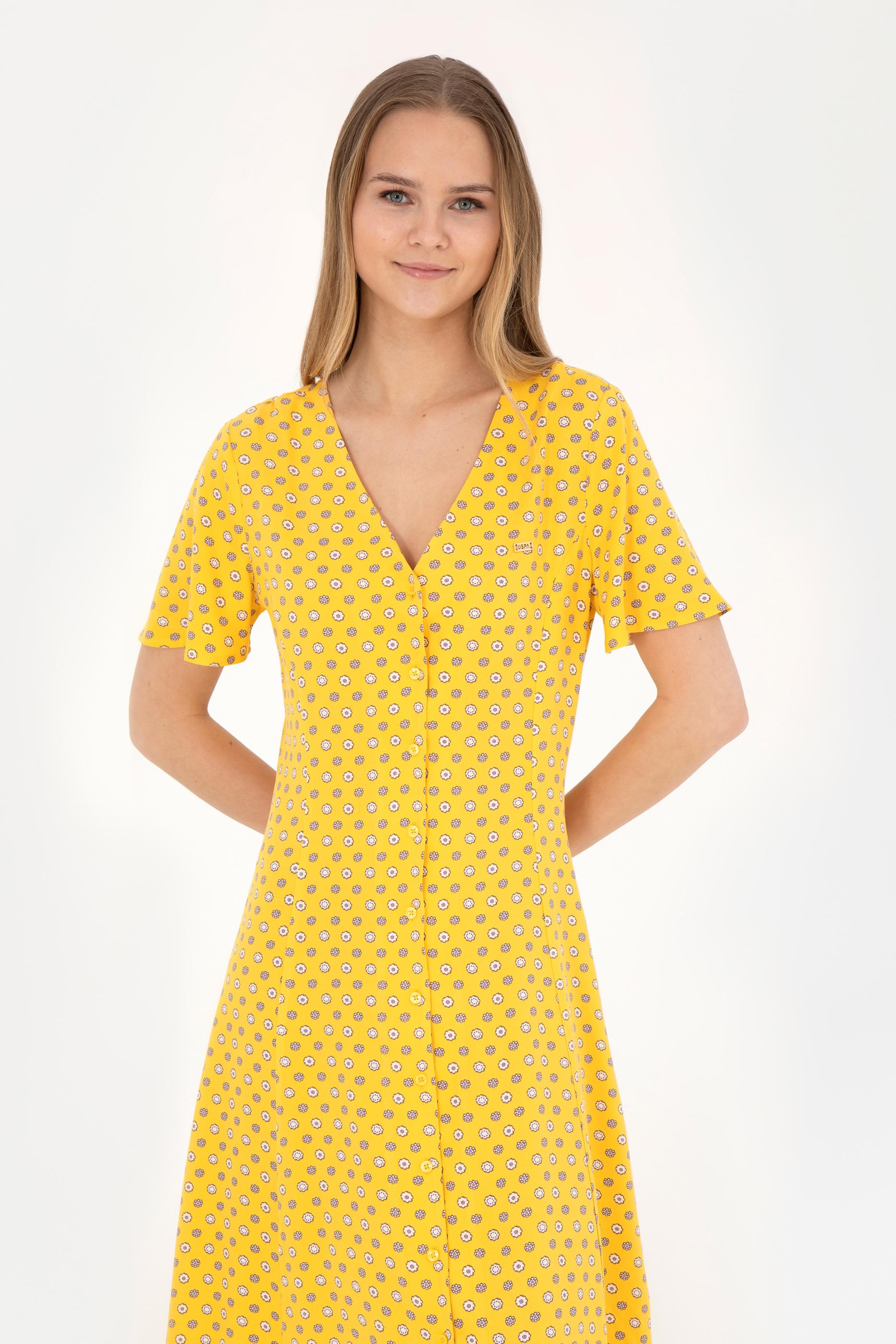 %100 viskozdan dokunmuş kadın V yaka sarı elbise, desenli yapısıyla göz alıcı bir görünüme sahiptir. V-yaka kesimi zarafeti ve şıklığı bir araya getirirken, kısa kolları yaz günlerinde ferahlık sağlar. Diz altına inen boyu hem rahat bir kullanım sunar hem de hareket özgürlüğü sağlar. Konforlu fit kesimi ise gün boyu rahat hissetmenizi sağlar.