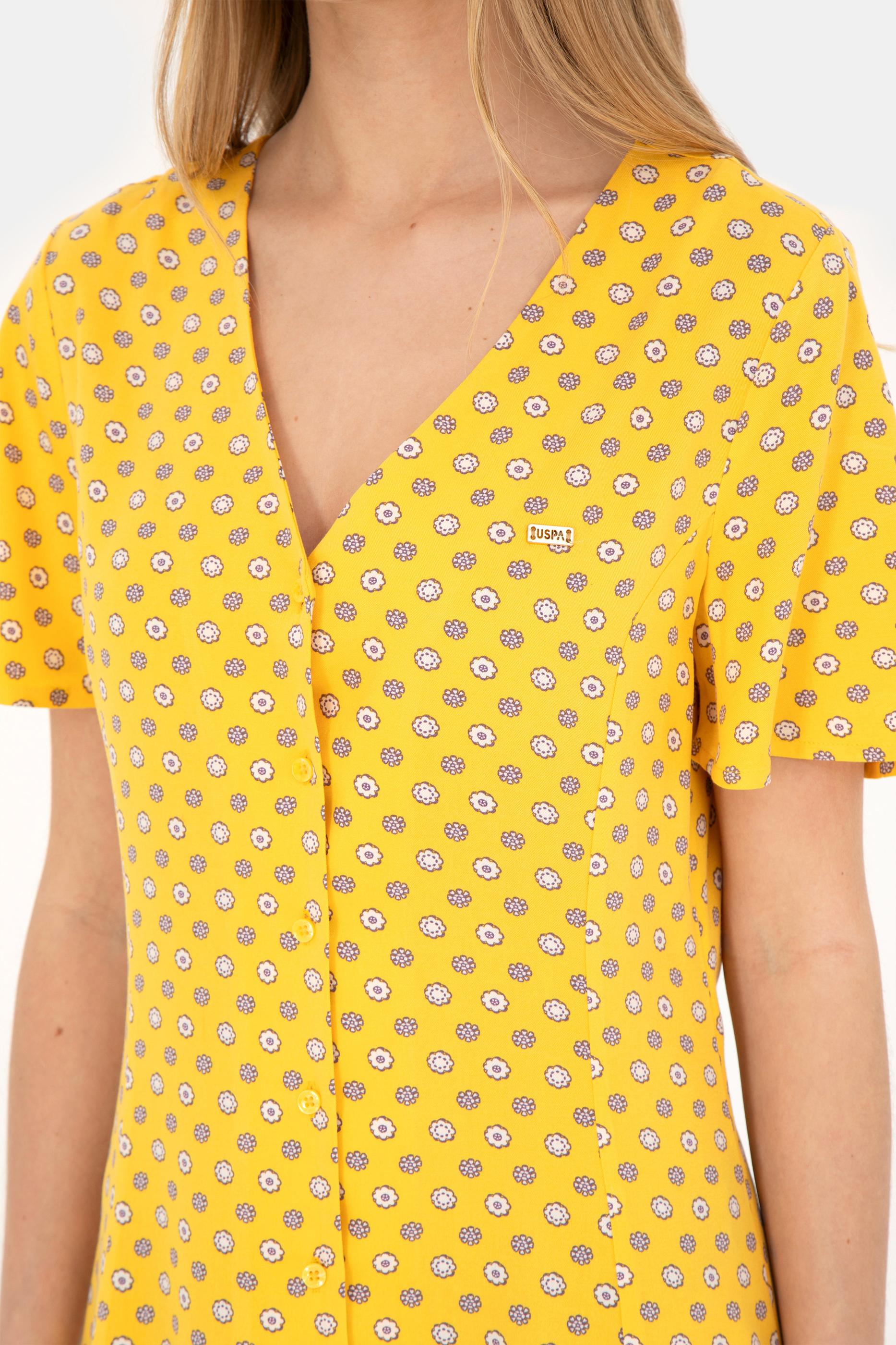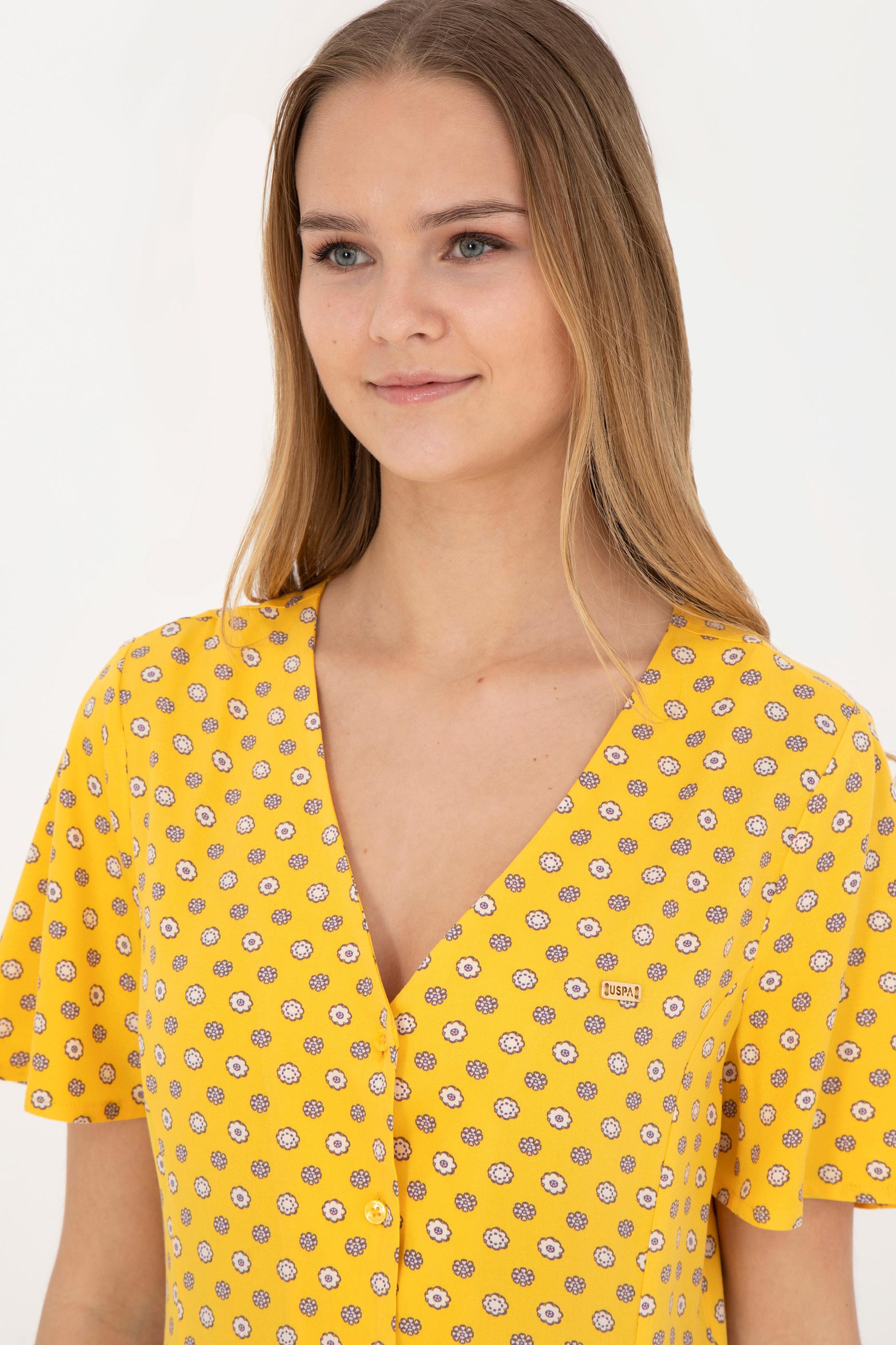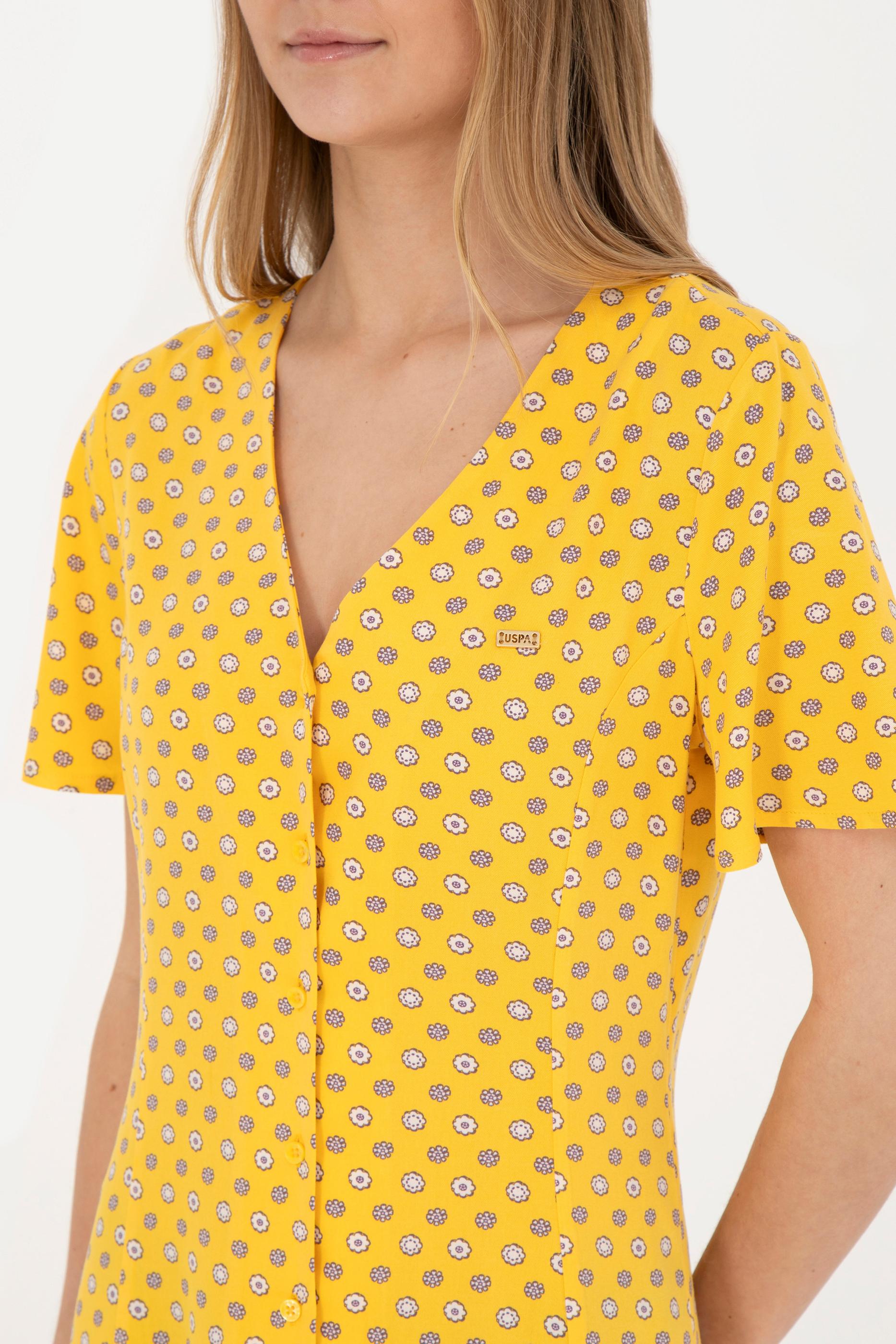 %100 viskozdan dokunmuş kadın V yaka sarı elbise, desenli yapısıyla göz alıcı bir görünüme sahiptir. V-yaka kesimi zarafeti ve şıklığı bir araya getirirken, kısa kolları yaz günlerinde ferahlık sağlar. Diz altına inen boyu hem rahat bir kullanım sunar hem de hareket özgürlüğü sağlar. Konforlu fit kesimi ise gün boyu rahat hissetmenizi sağlar.