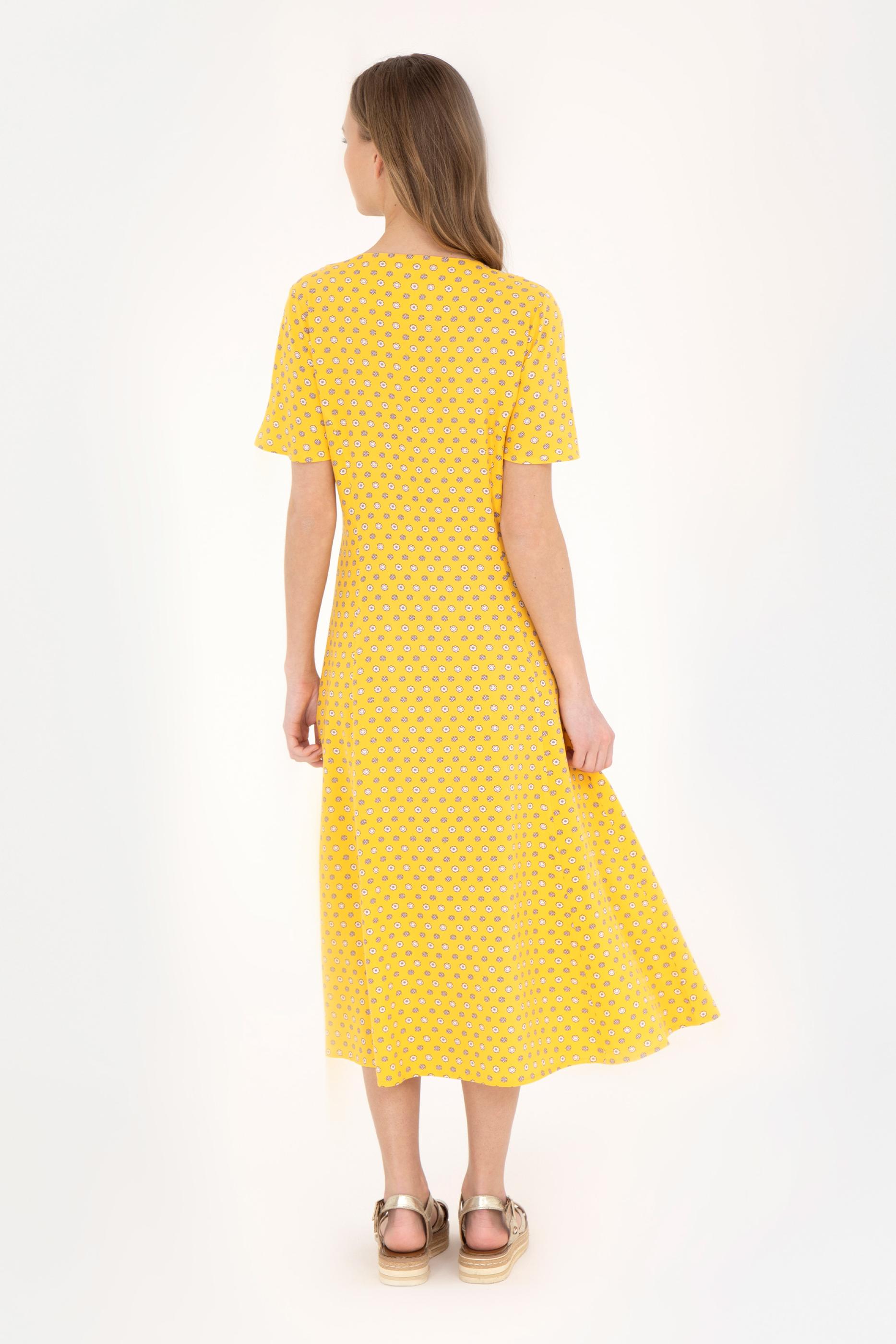 Desenli yapısı, hareketli bir görünüm sunarken, sarının canlılığı ile birleşerek dinamik bir tarz yaratır. Kısa kolları ve diz altı boyu hem rahat hem de modern bir görünüm sağlar. Uçuş uçuş eteği ve zarif desenleri ile rahat ve şık bir görünüm sunar. Bel kısmındaki hafif oturan kesimi ile vücut hatlarını kusursuz bir şekilde vurgular.