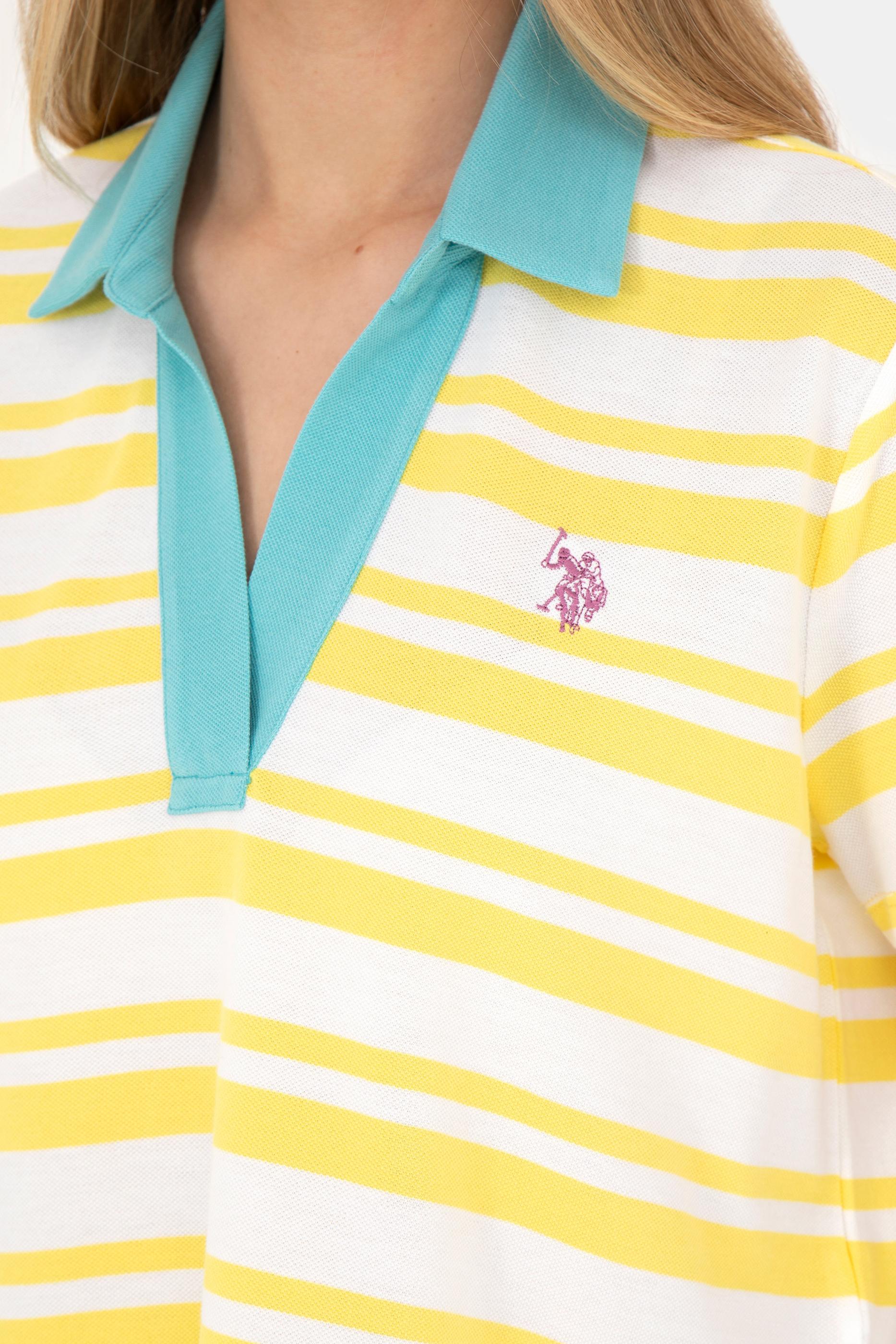 Sarı ve beyaz çizgilerin mükemmel uyumu sarı çizgili polo tişört de dinamik bir hava katarken, turkuaz renkli V yaka tasarımıyla modern bir şıklık sağlıyor. Canlı bir stil sahibi olmak isteyenler için tasarlanan parça, her anınızı renkli kılacak.
