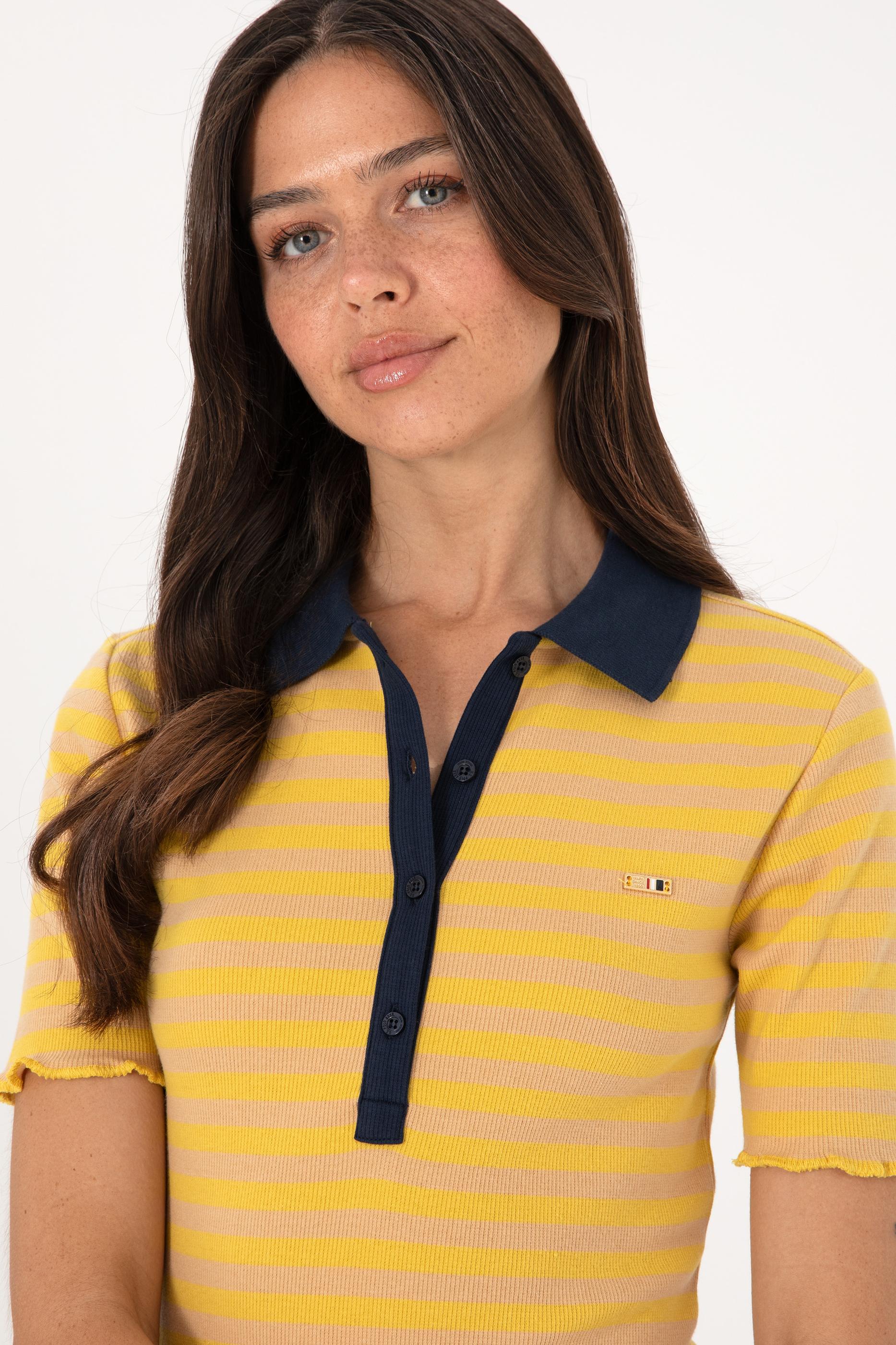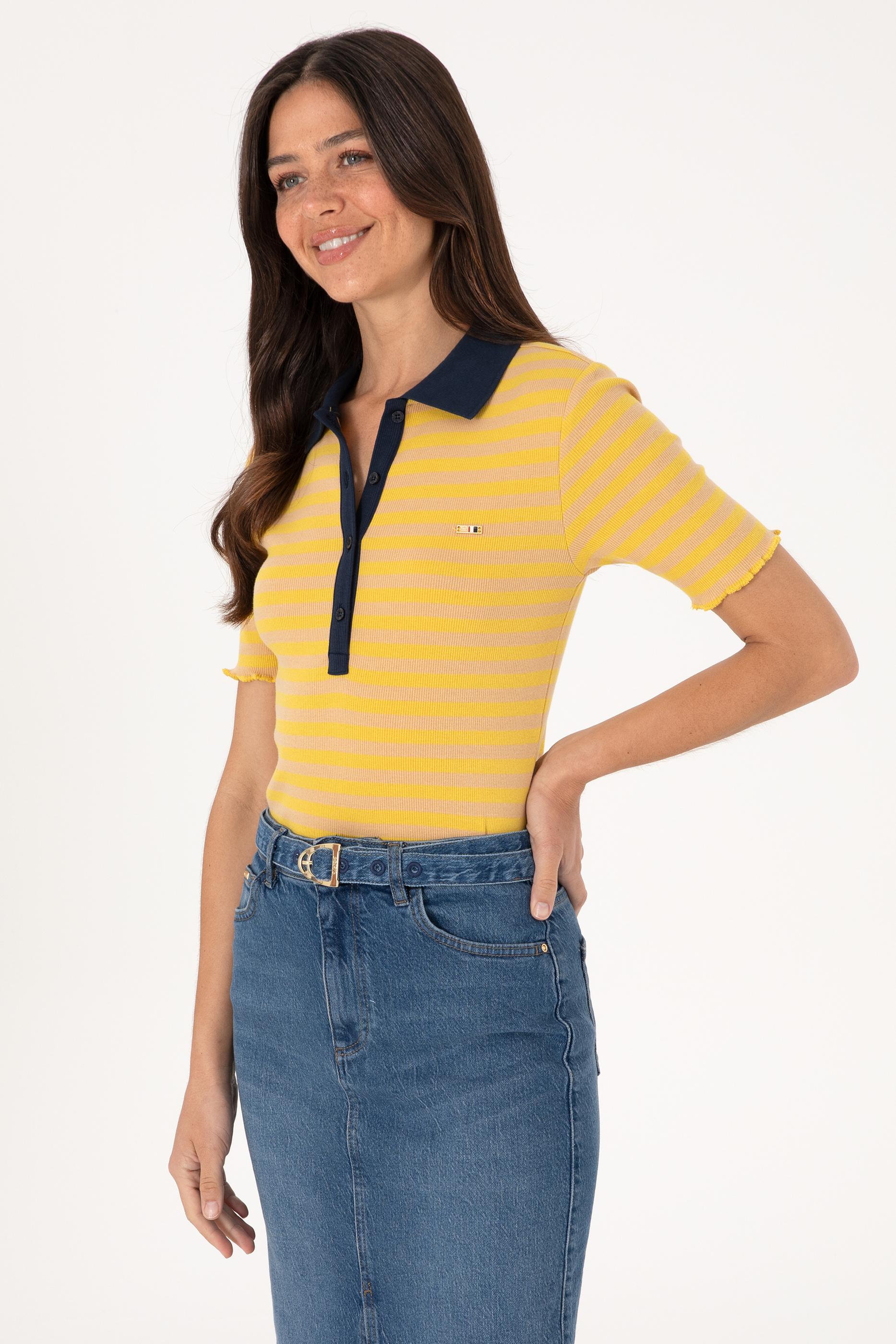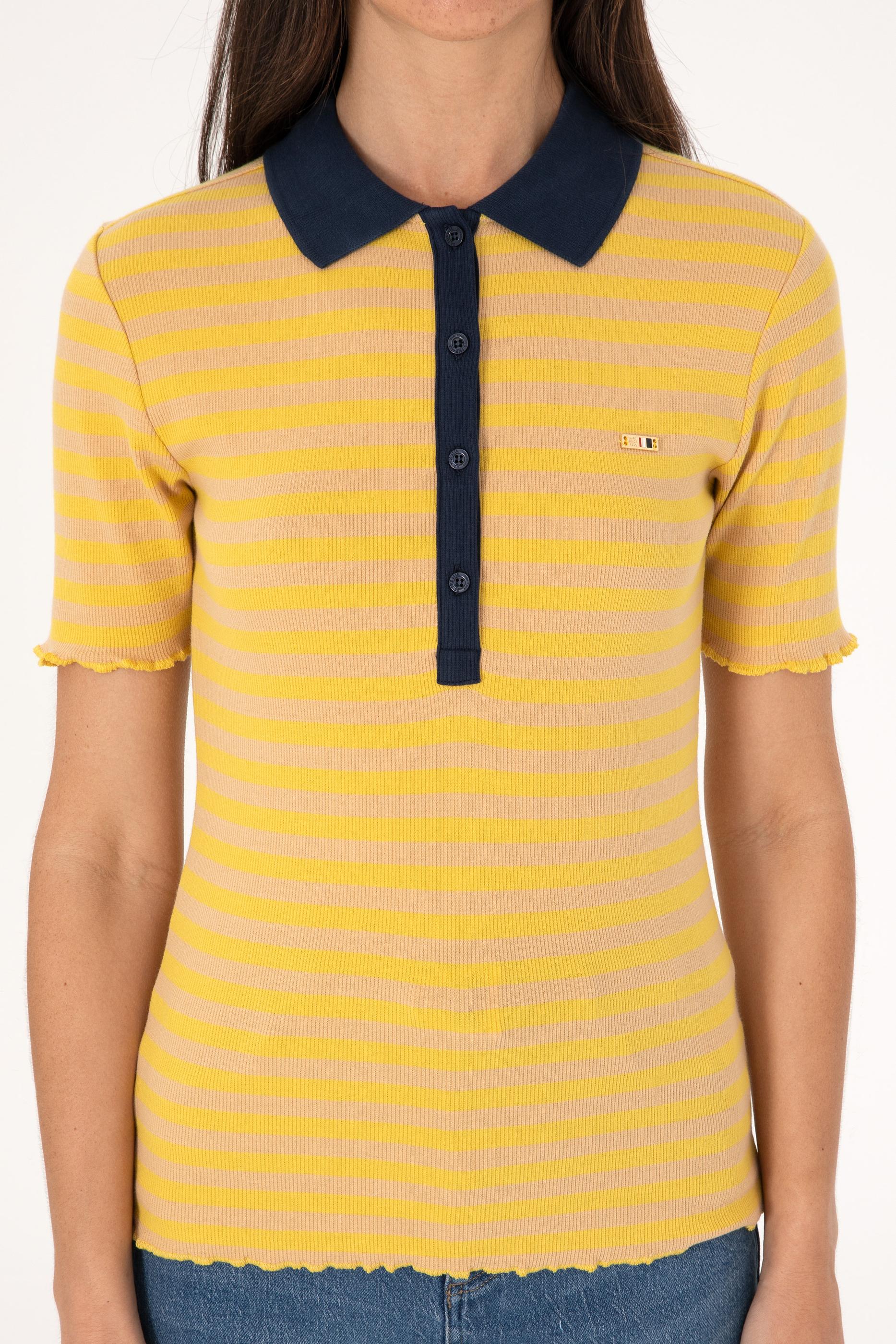 Kadın Koyu Sarı Çizgili Polo Yaka Tişört