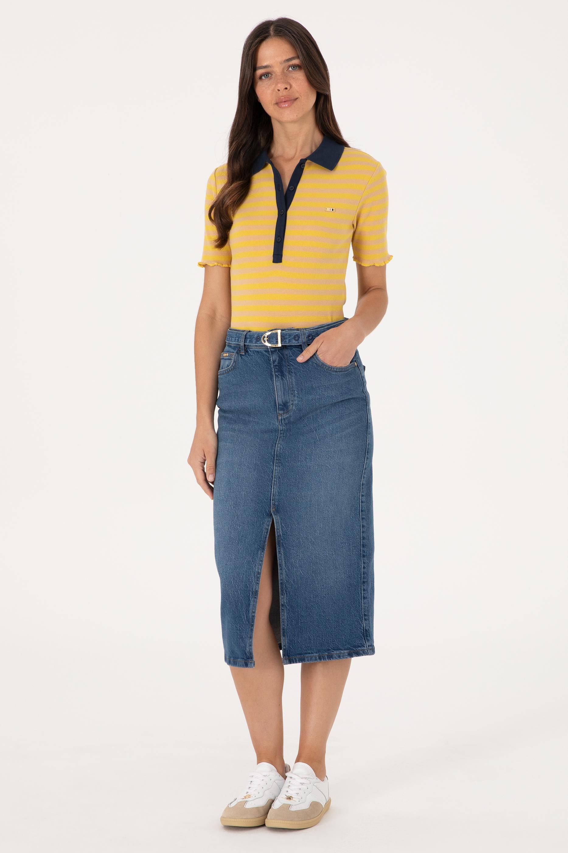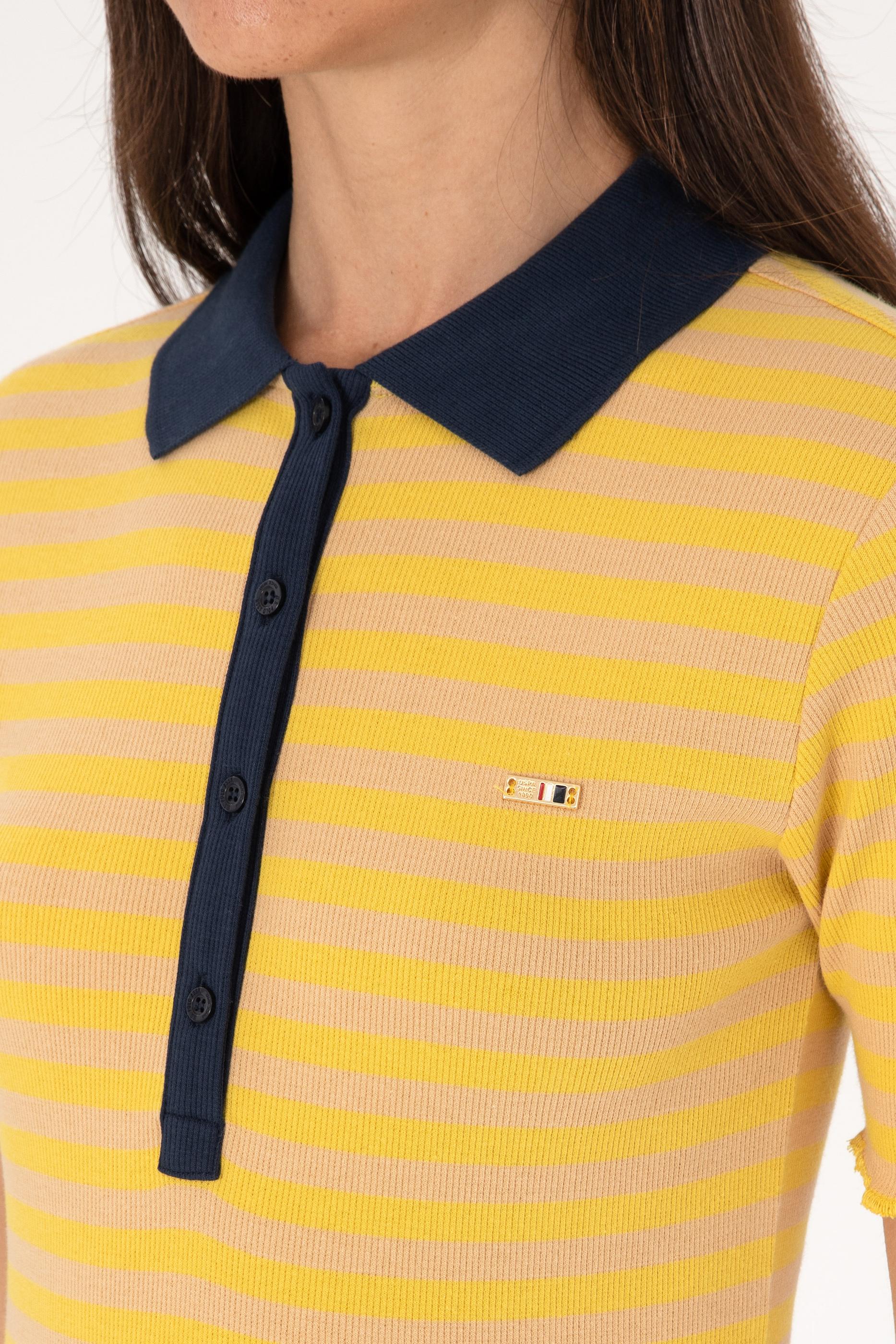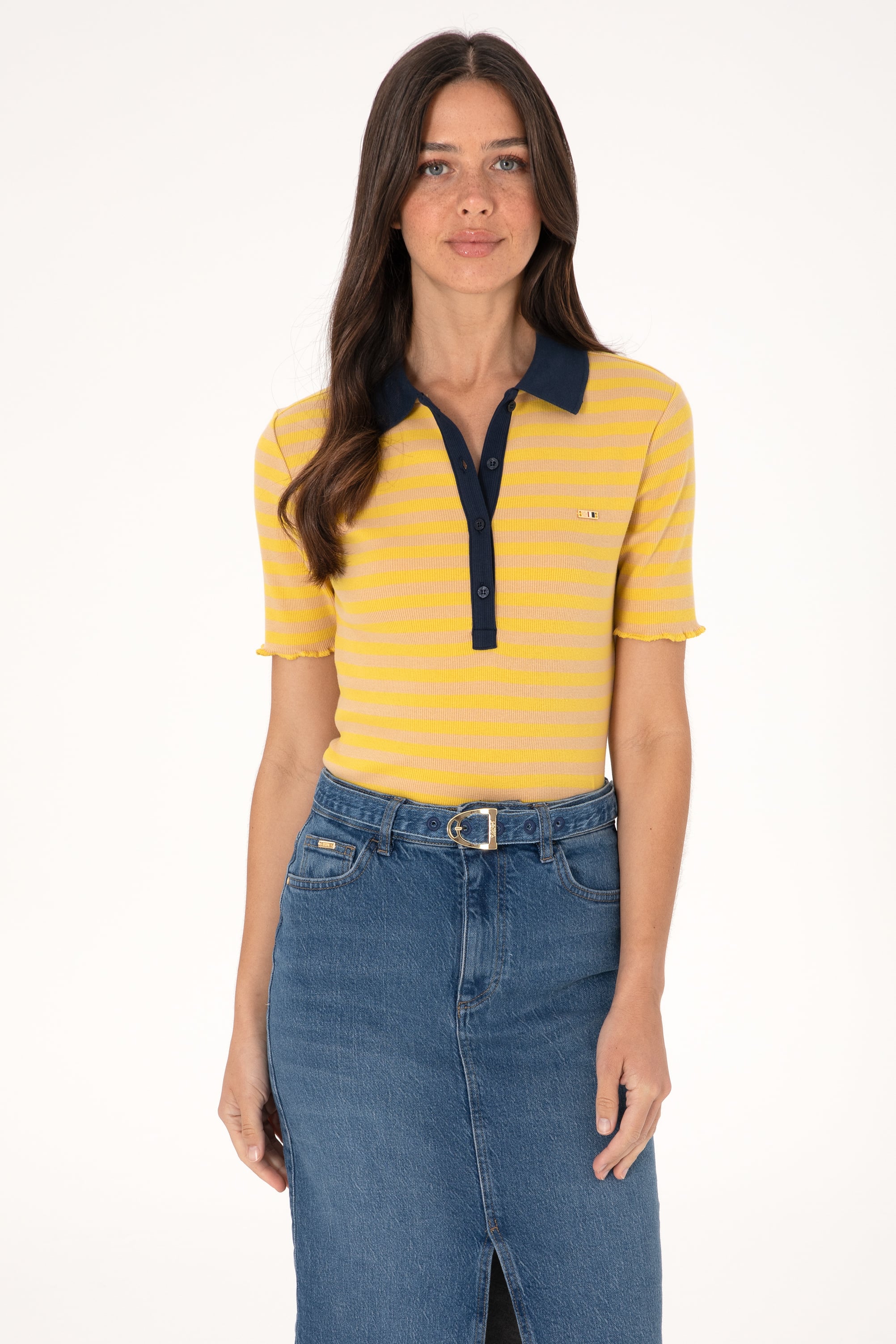 Kadın Koyu Sarı Çizgili Polo Yaka Tişört
