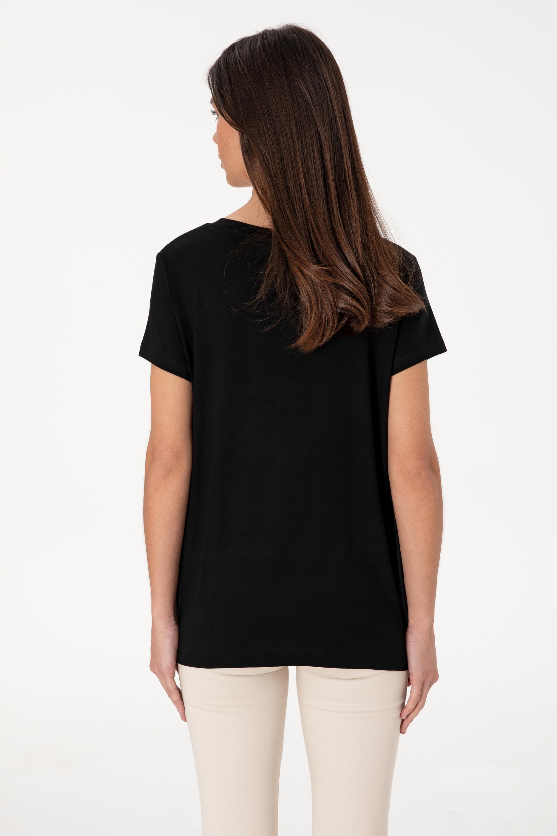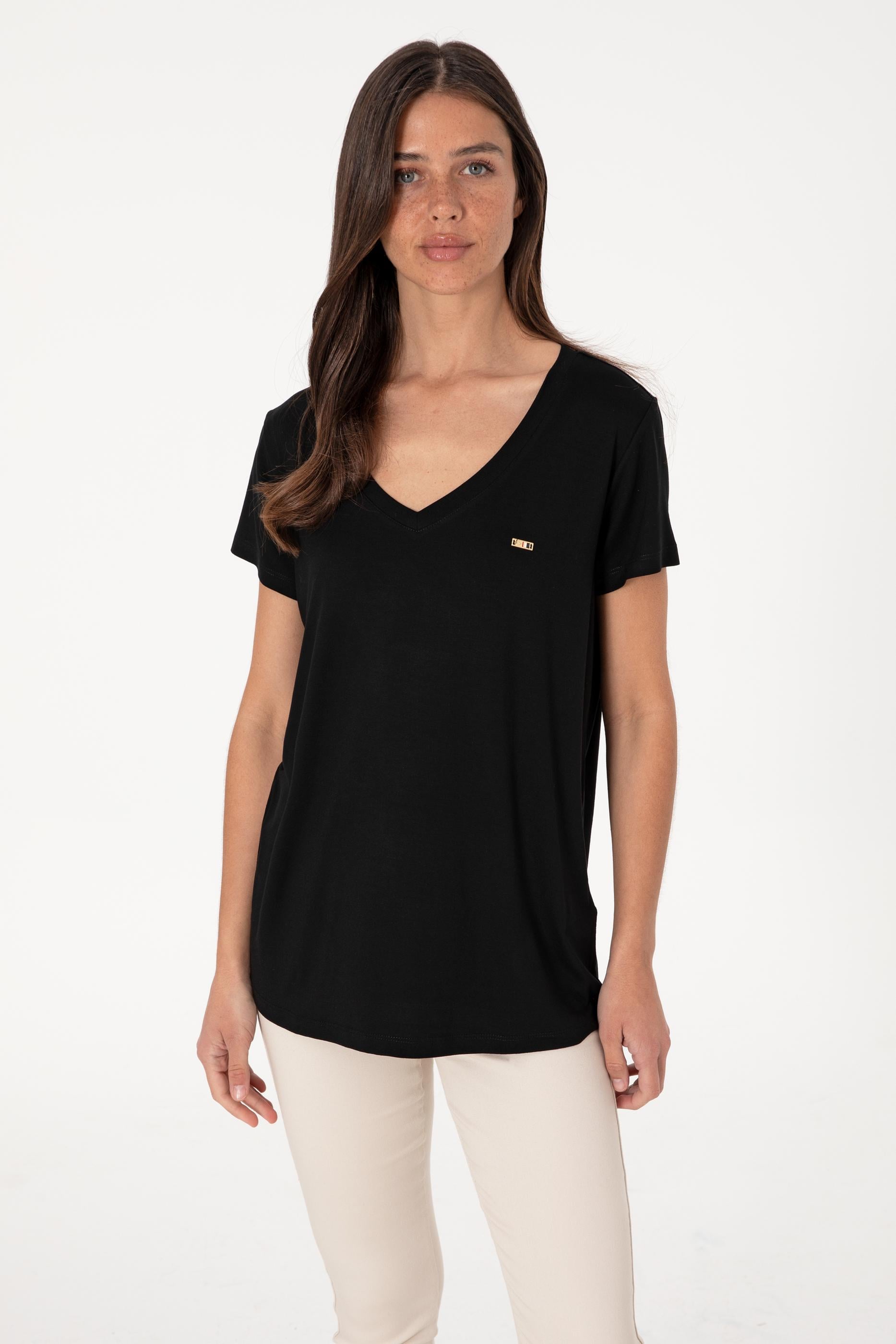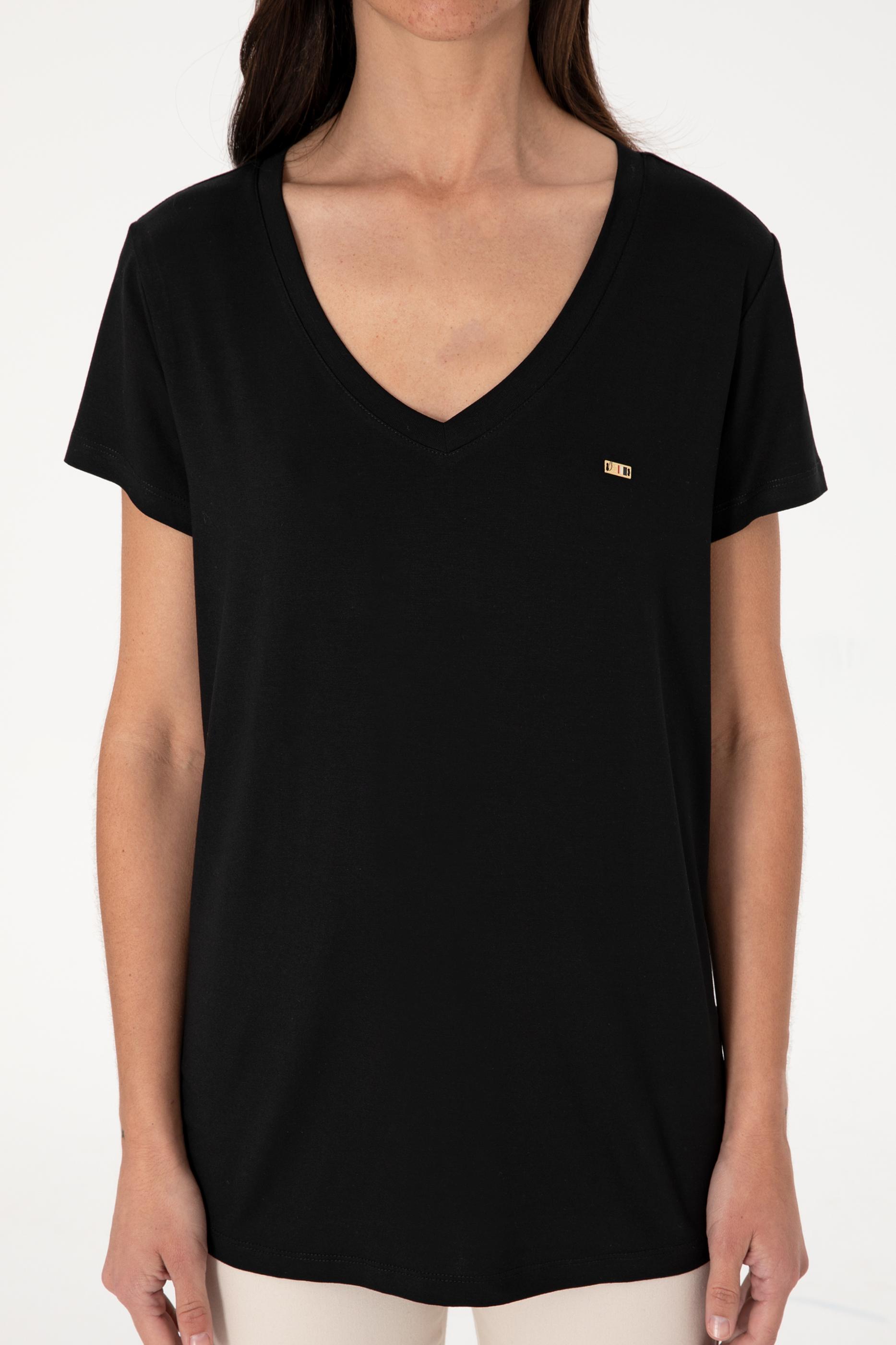 Kadın Siyah Modal Karışımlı V Yaka Basic Tişört