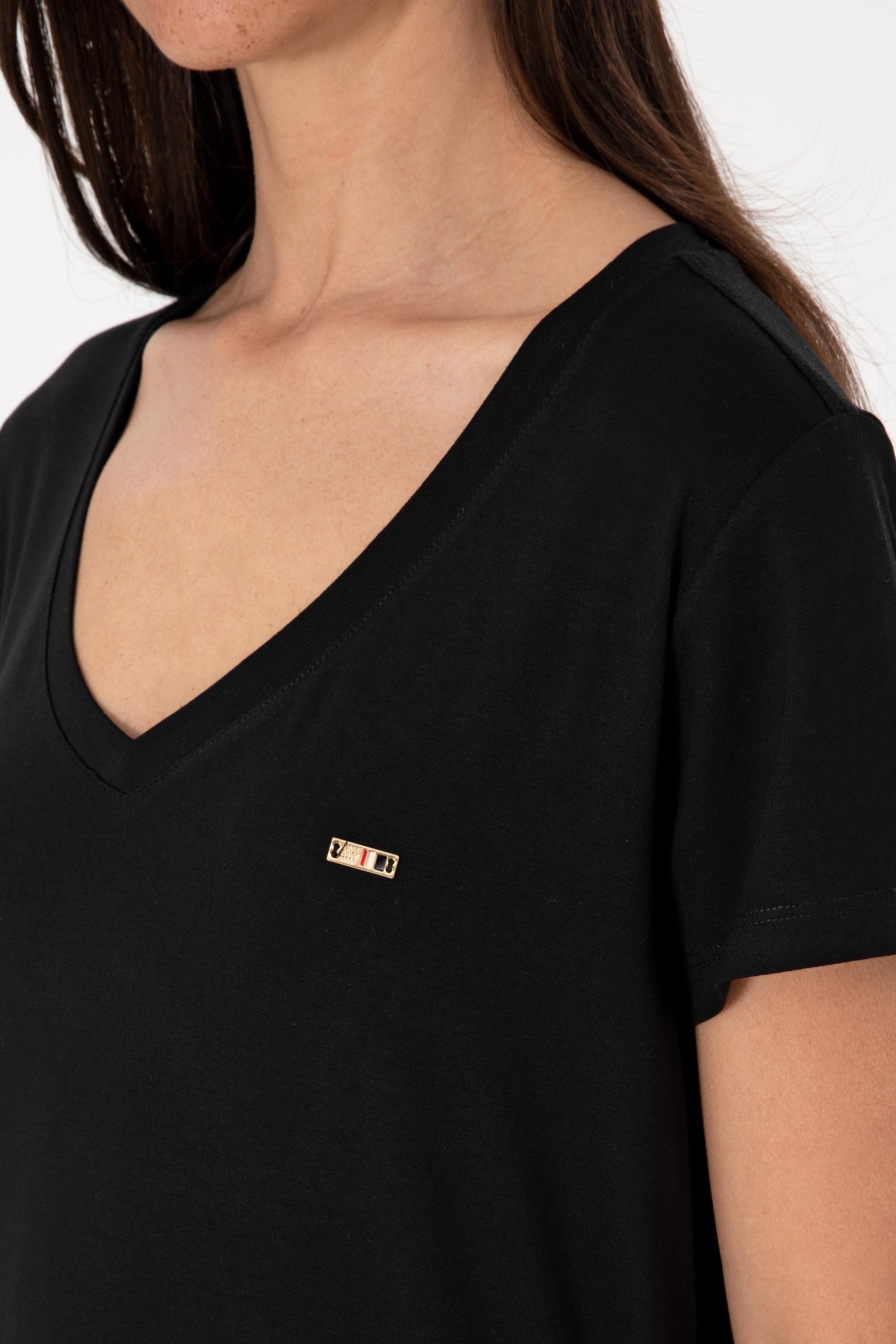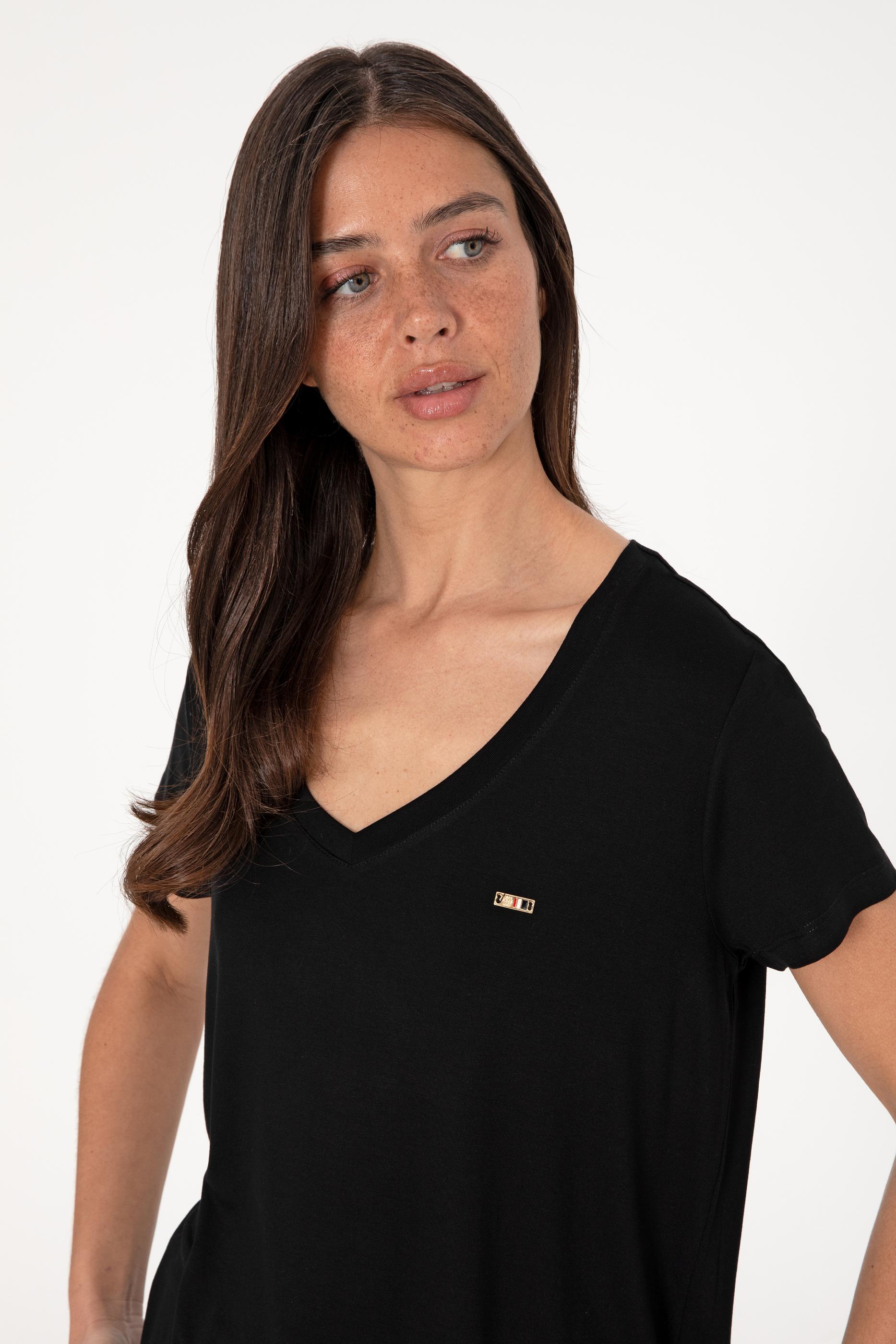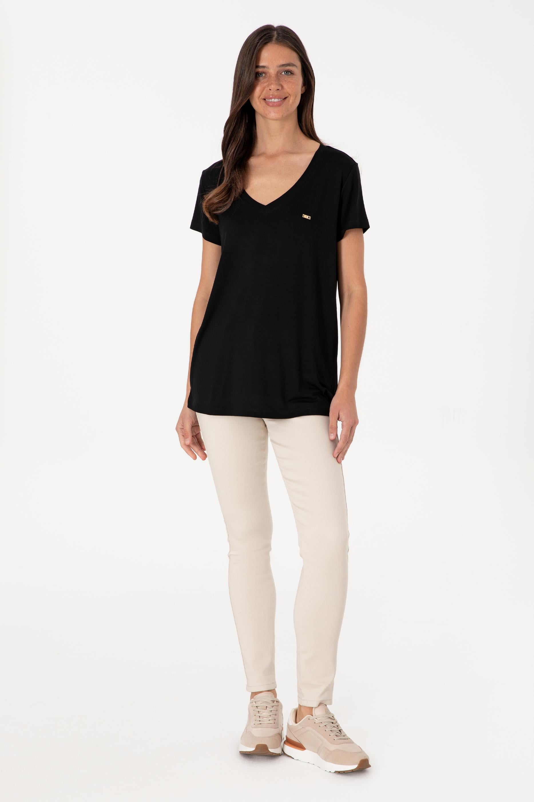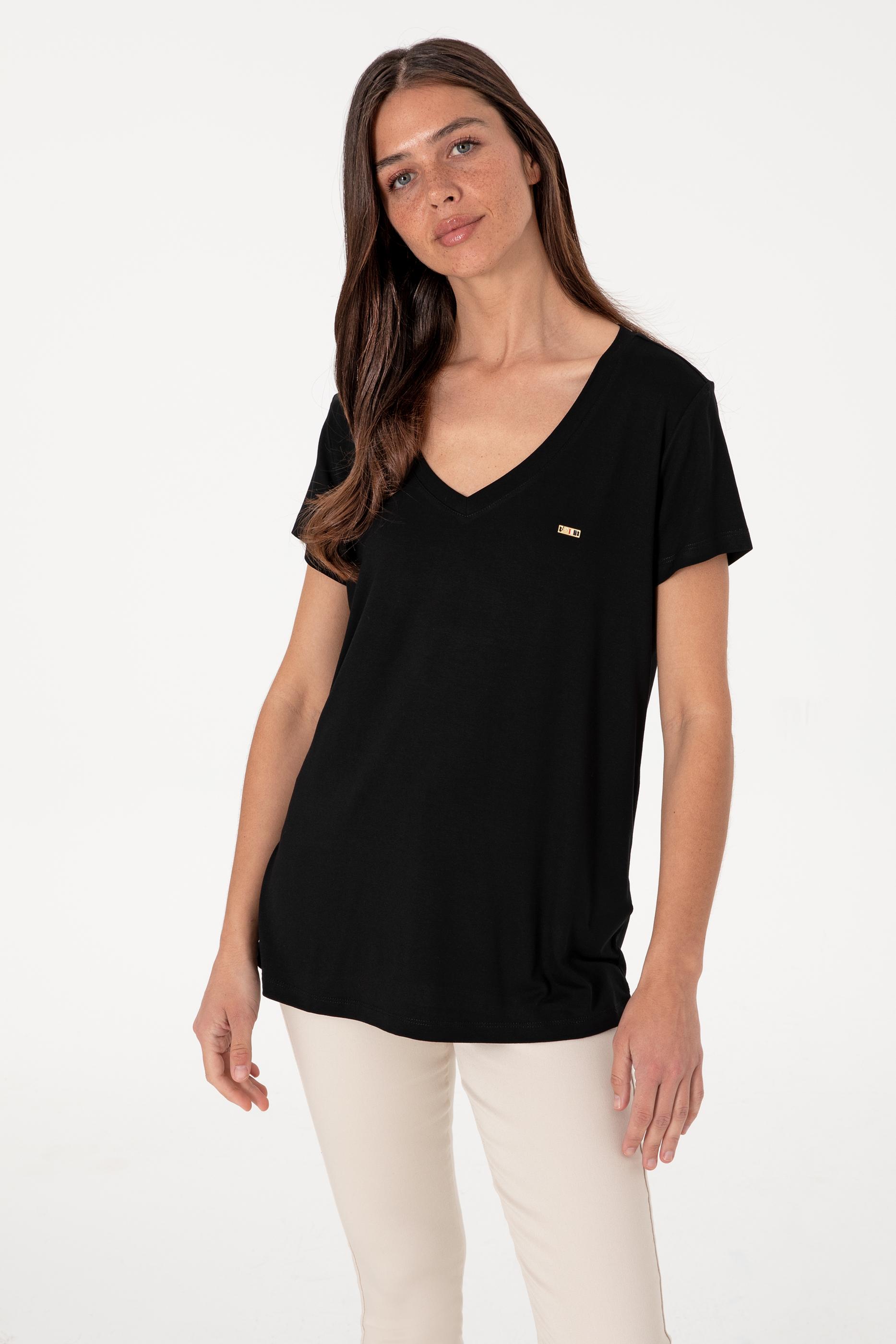 Kadın Siyah Modal Karışımlı V Yaka Basic Tişört