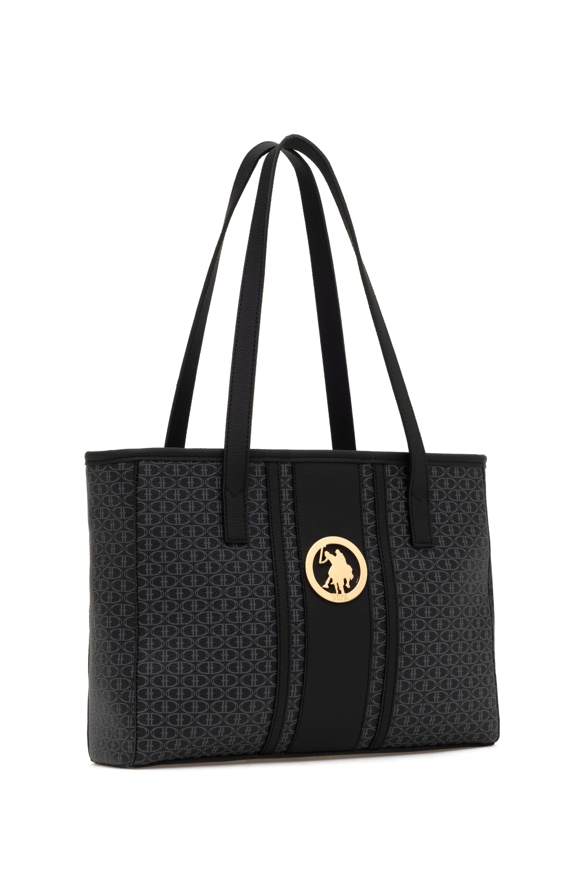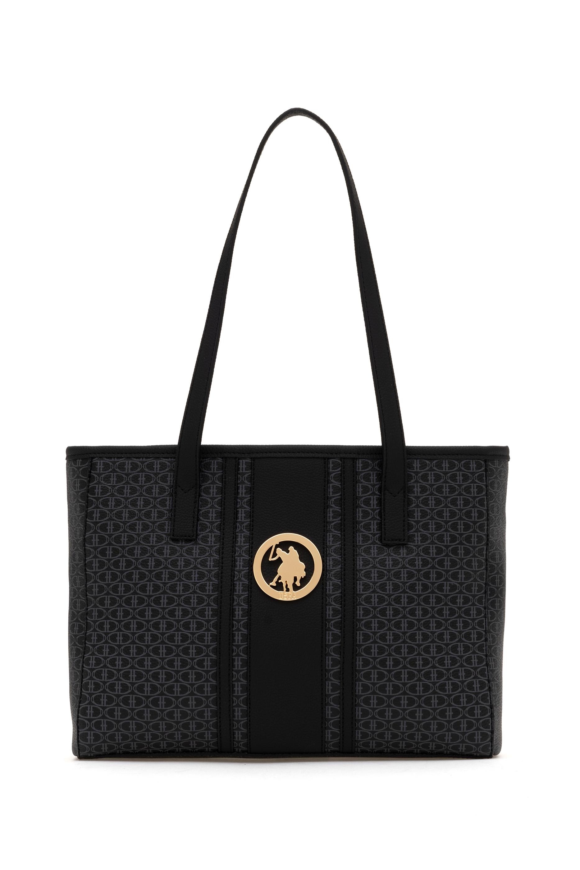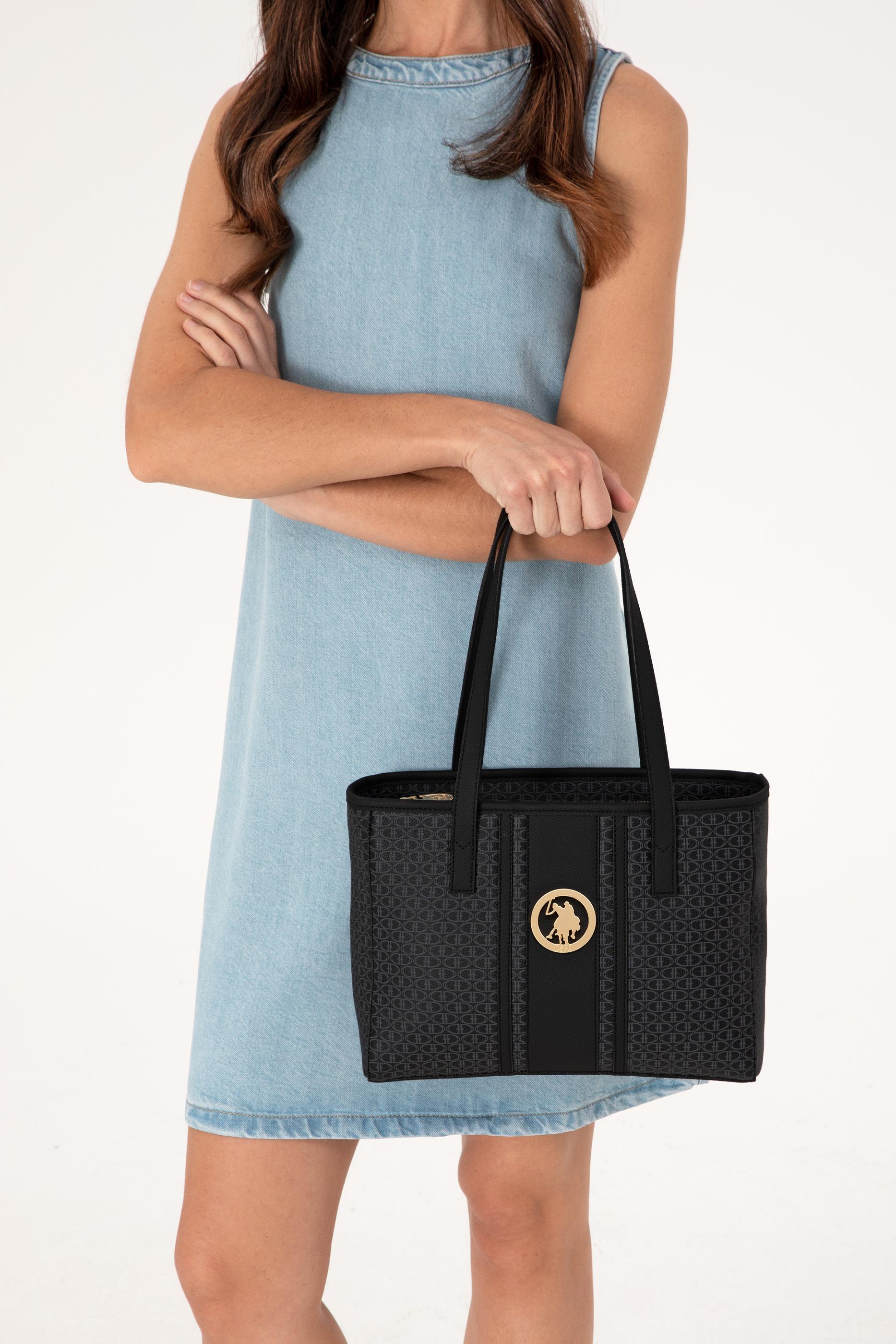 Keskin hatlı dikdörtgen formuyla öne çıkan bu siyah kol çantası, düz tabanı sayesinde ayakta durabilen sağlam bir yapı sunar. Yüzeyindeki monogram deseni dolgun ve tok bir his verirken, ortadaki kontrast şerit modern bir vurgu yaratır. Deri efektli dış yüzeyi kaliteli bir duruş sergilerken, geniş iç hacmi günlük ihtiyaçları rahatça taşımaya uygundur. İnce ve dayanıklı sapları sayesinde elde veya omuzda konforla kullanılabilir. Altın renkli metal logo detayı çantaya şık bir son dokunuş kazandırır.