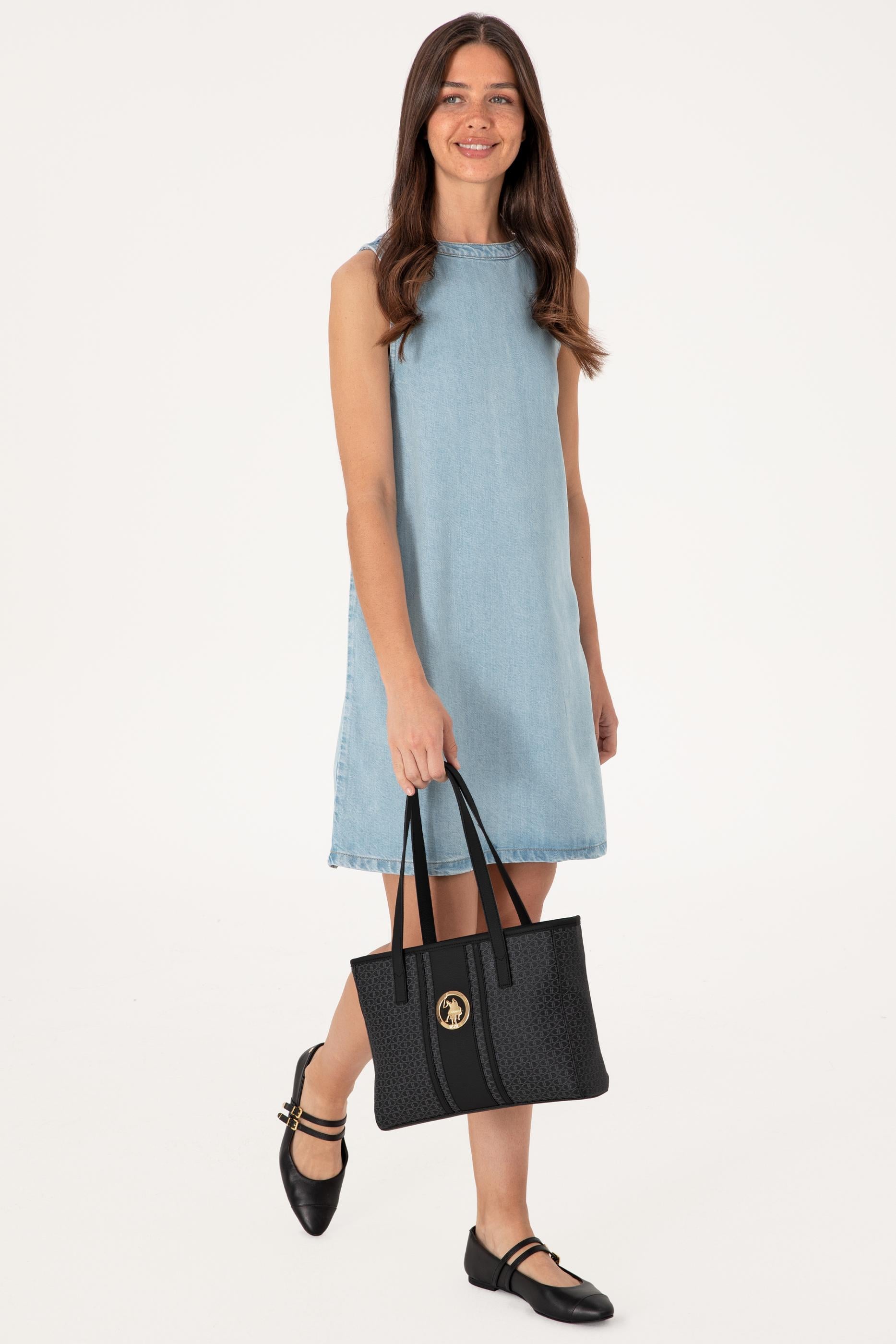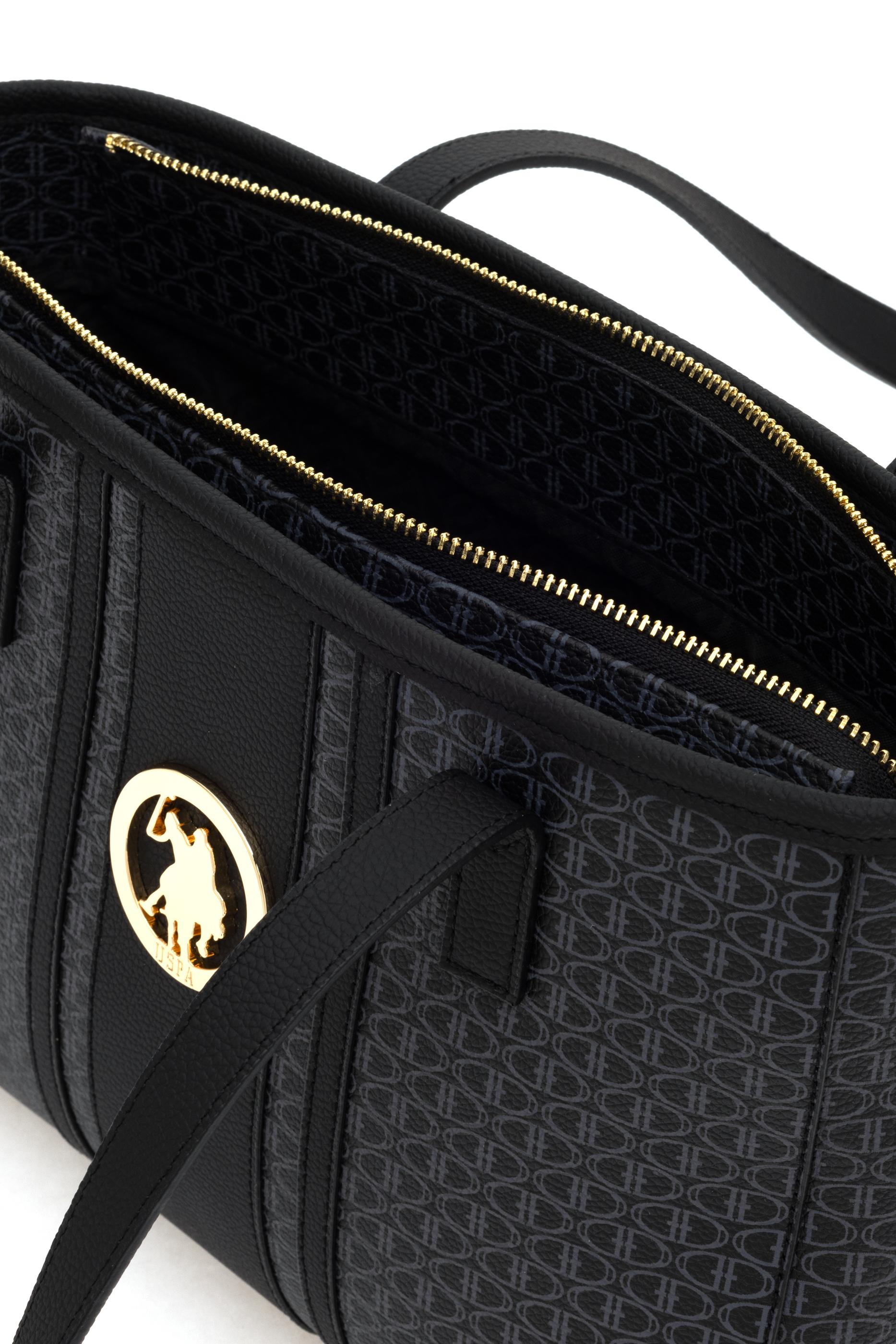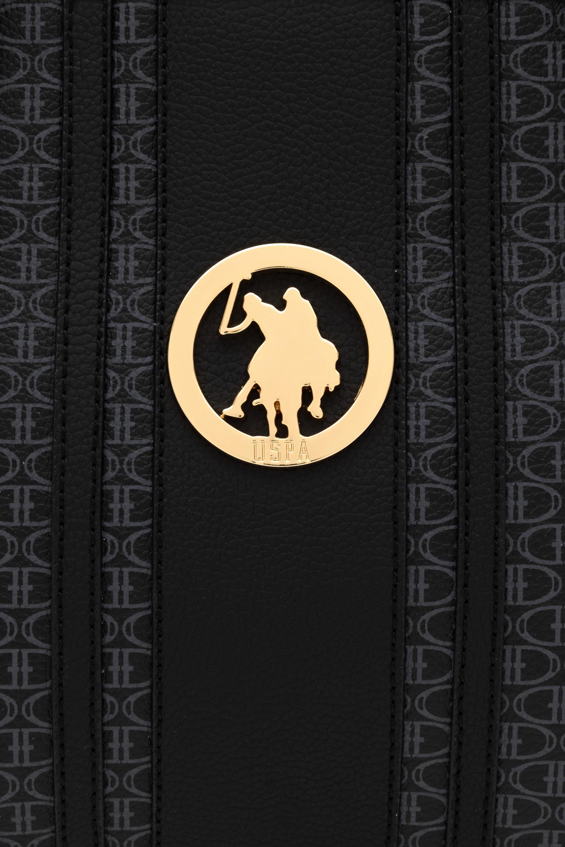 Keskin hatlı dikdörtgen formuyla öne çıkan bu siyah kol çantası, düz tabanı sayesinde ayakta durabilen sağlam bir yapı sunar. Yüzeyindeki monogram deseni dolgun ve tok bir his verirken, ortadaki kontrast şerit modern bir vurgu yaratır. Deri efektli dış yüzeyi kaliteli bir duruş sergilerken, geniş iç hacmi günlük ihtiyaçları rahatça taşımaya uygundur. İnce ve dayanıklı sapları sayesinde elde veya omuzda konforla kullanılabilir. Altın renkli metal logo detayı çantaya şık bir son dokunuş kazandırır.