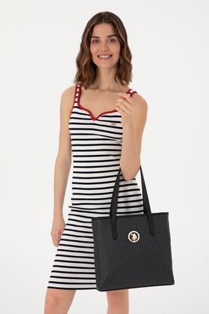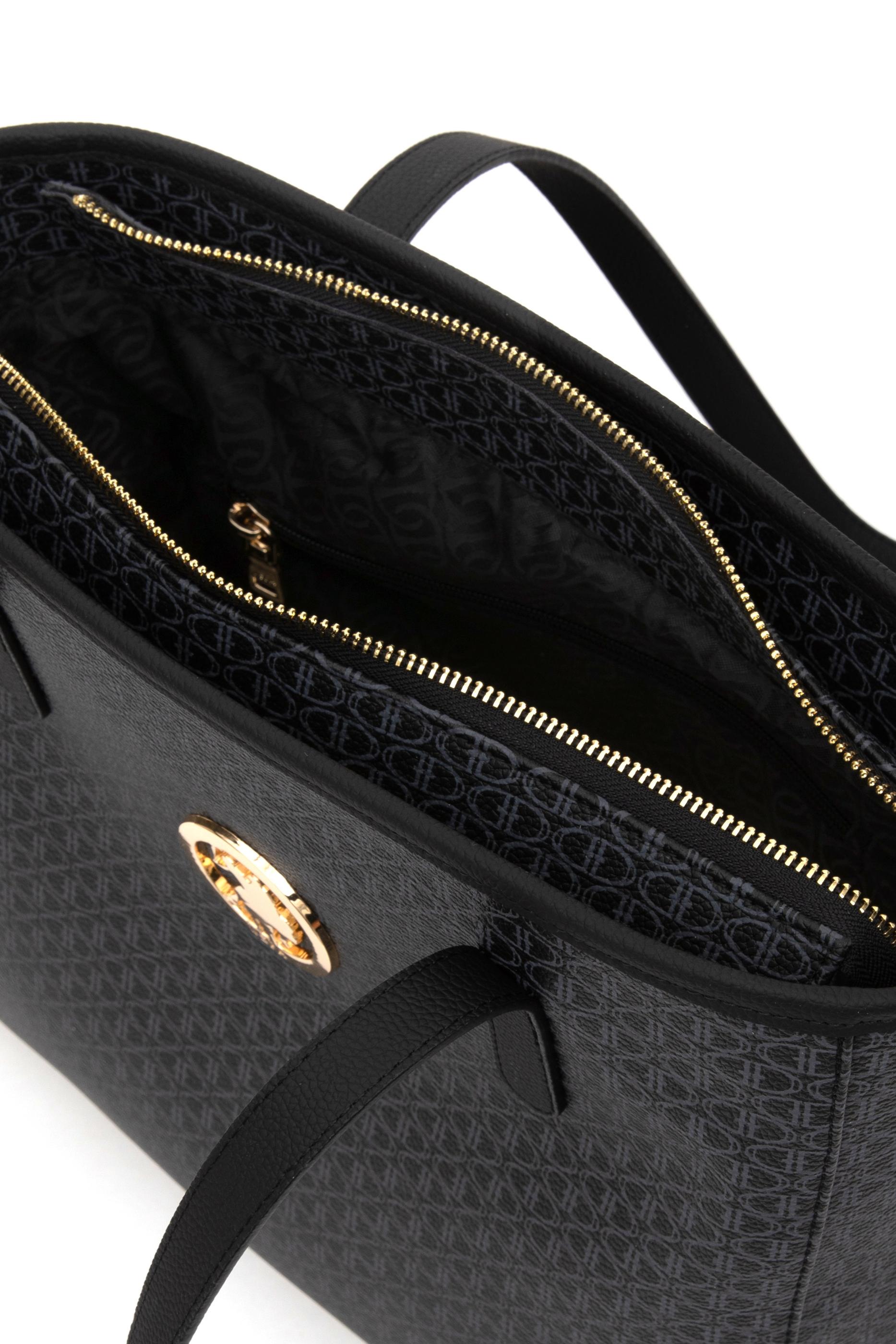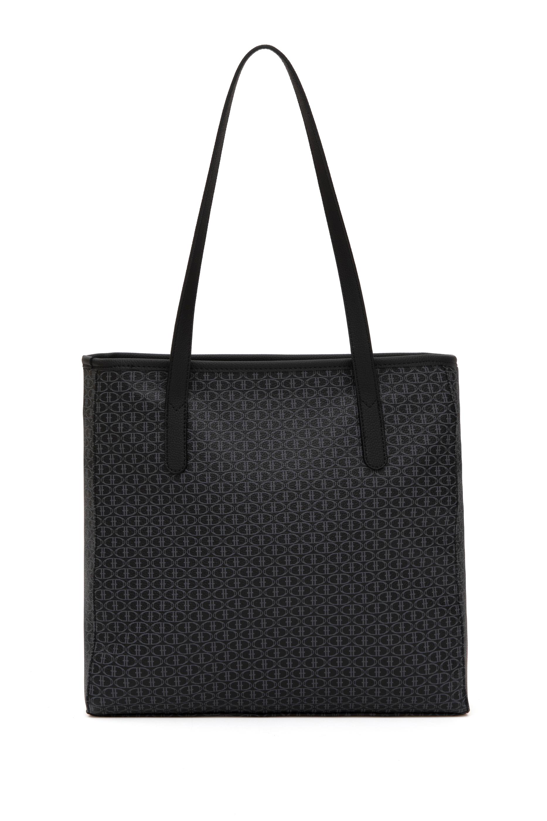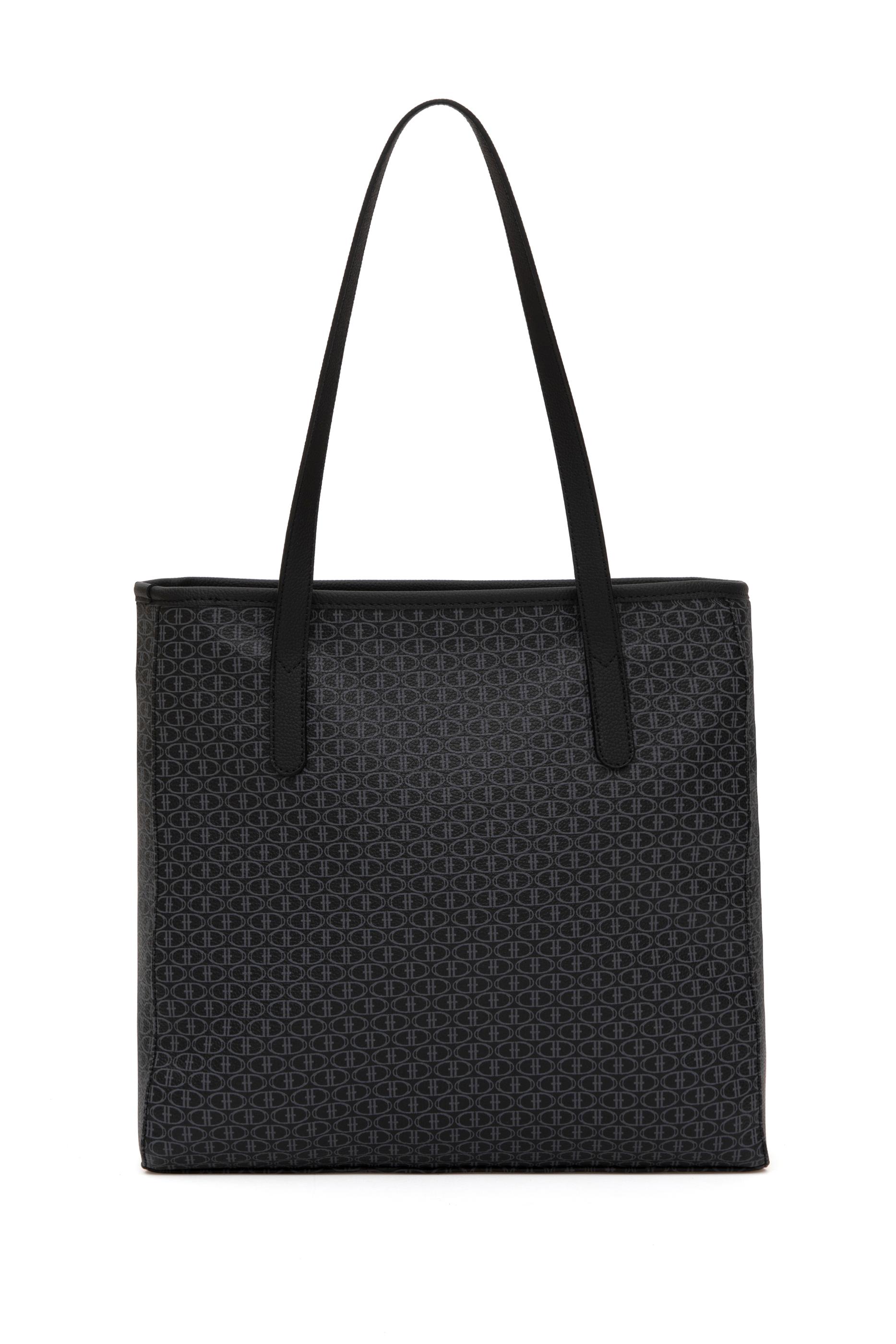 Yumuşak dokulu monogram desenli yüzeyiyle dikkat çeken bu siyah omuz çantası, geniş dikdörtgen formuyla günlük kullanım için ideal alan sunar. Düz tabanlı yapısı formunu korurken, uzun siyah kulpları omuzda rahat taşıma imkânı sağlar. Üst kısımdaki deri efektli şerit ve ortadaki altın tonlu yuvarlak logo, sade tasarıma zarif bir kontrast katar. Şehirli ve klasik bir görünüm isteyenler için işlevsel ve zarif bir tamamlayıcıdır.