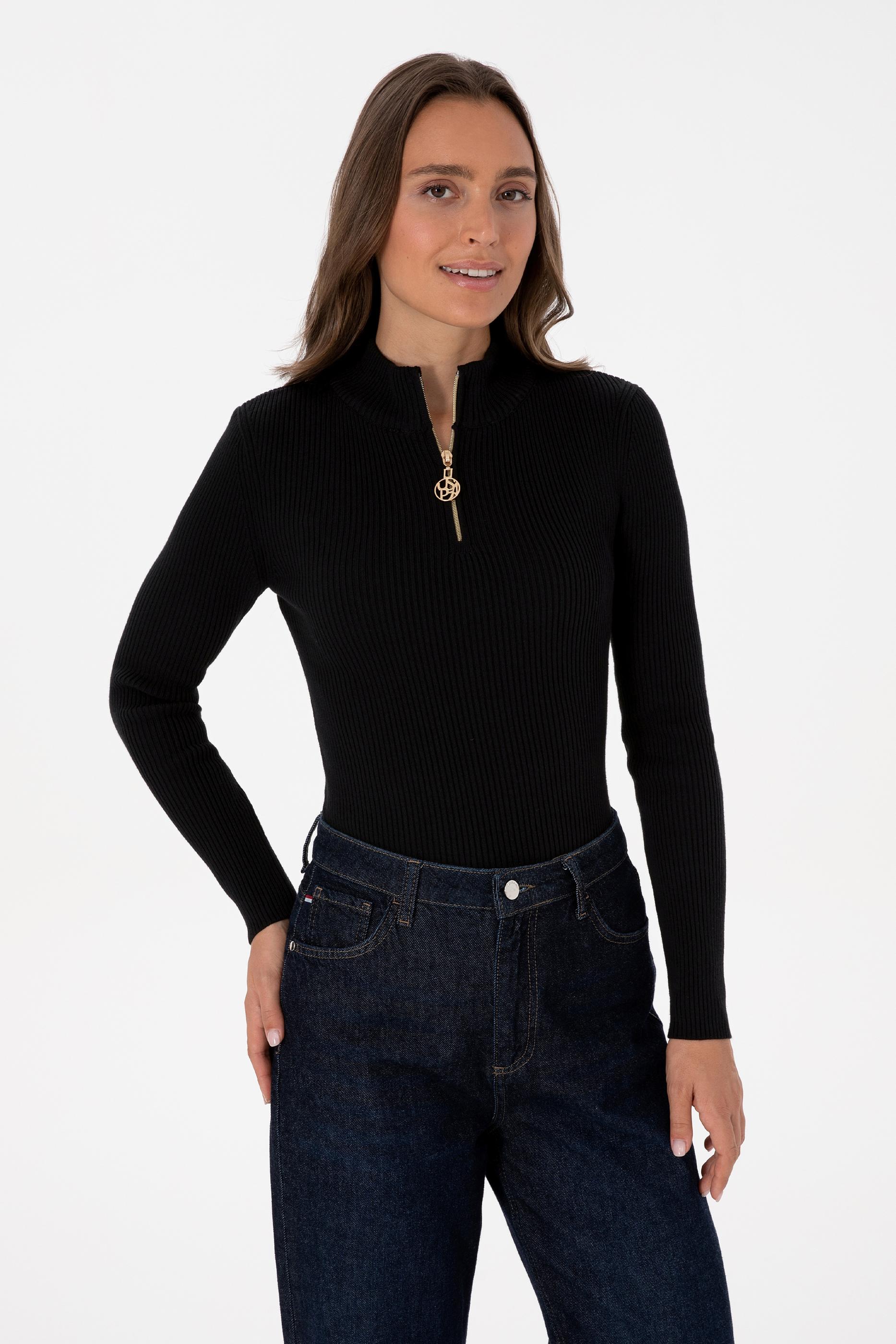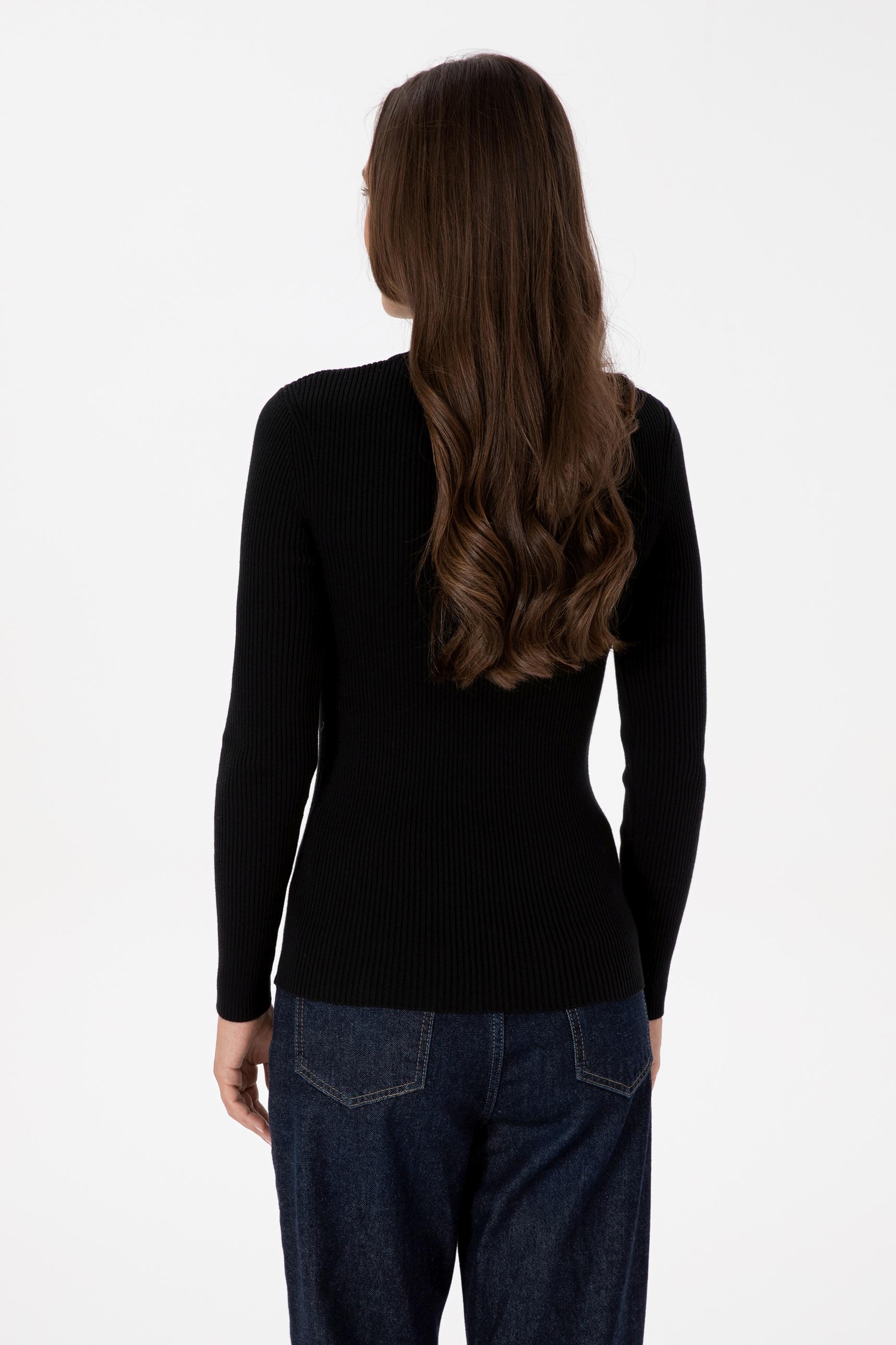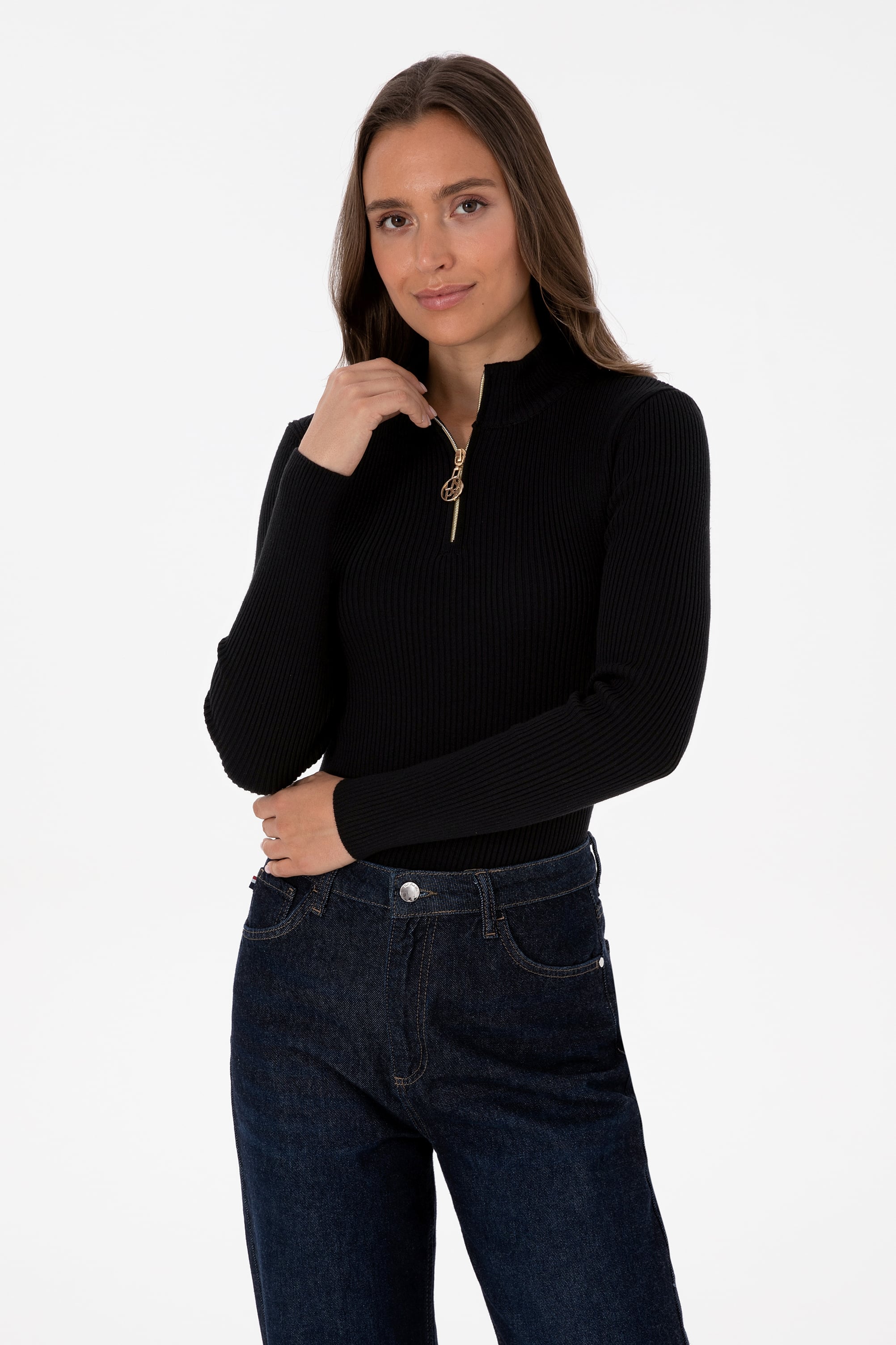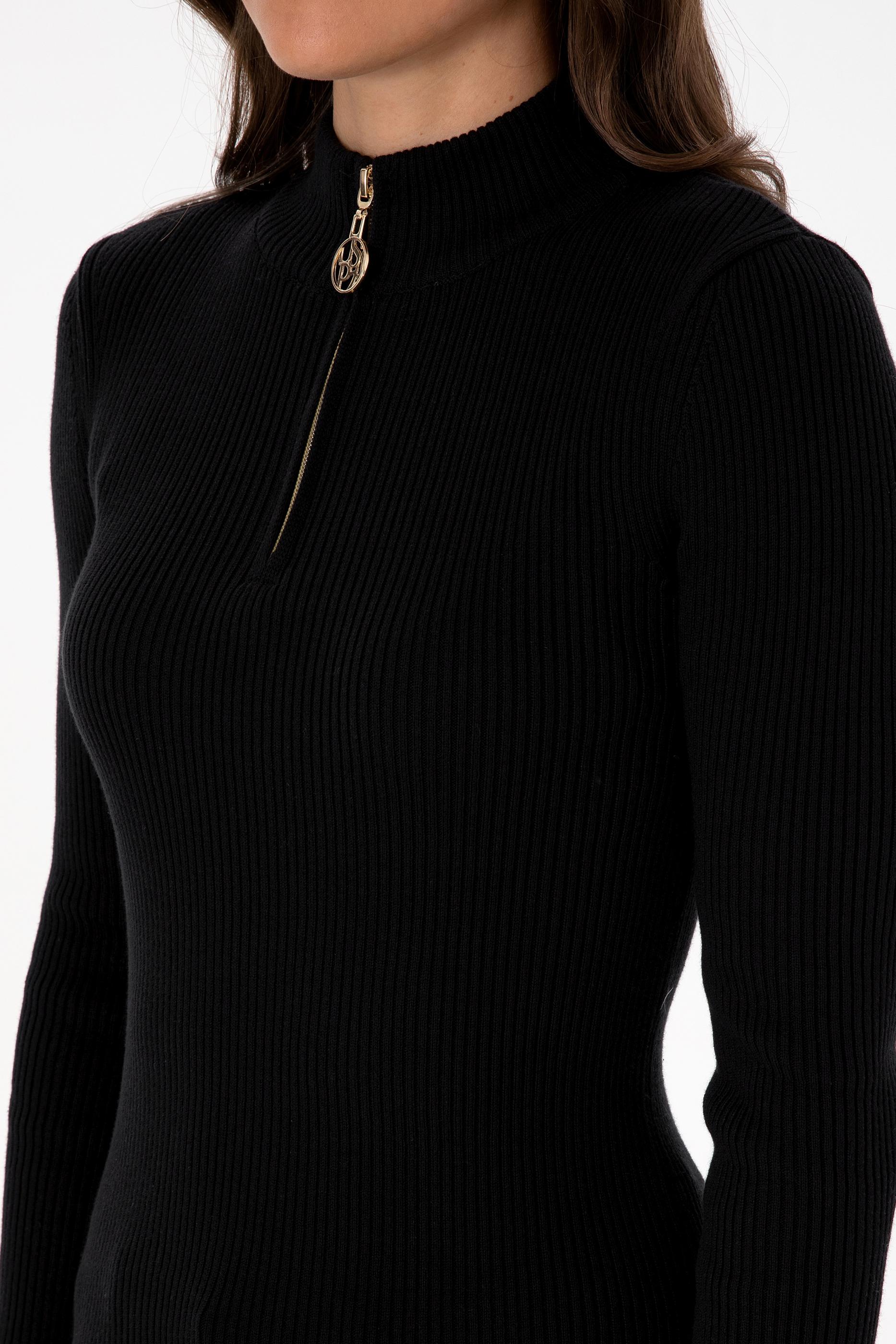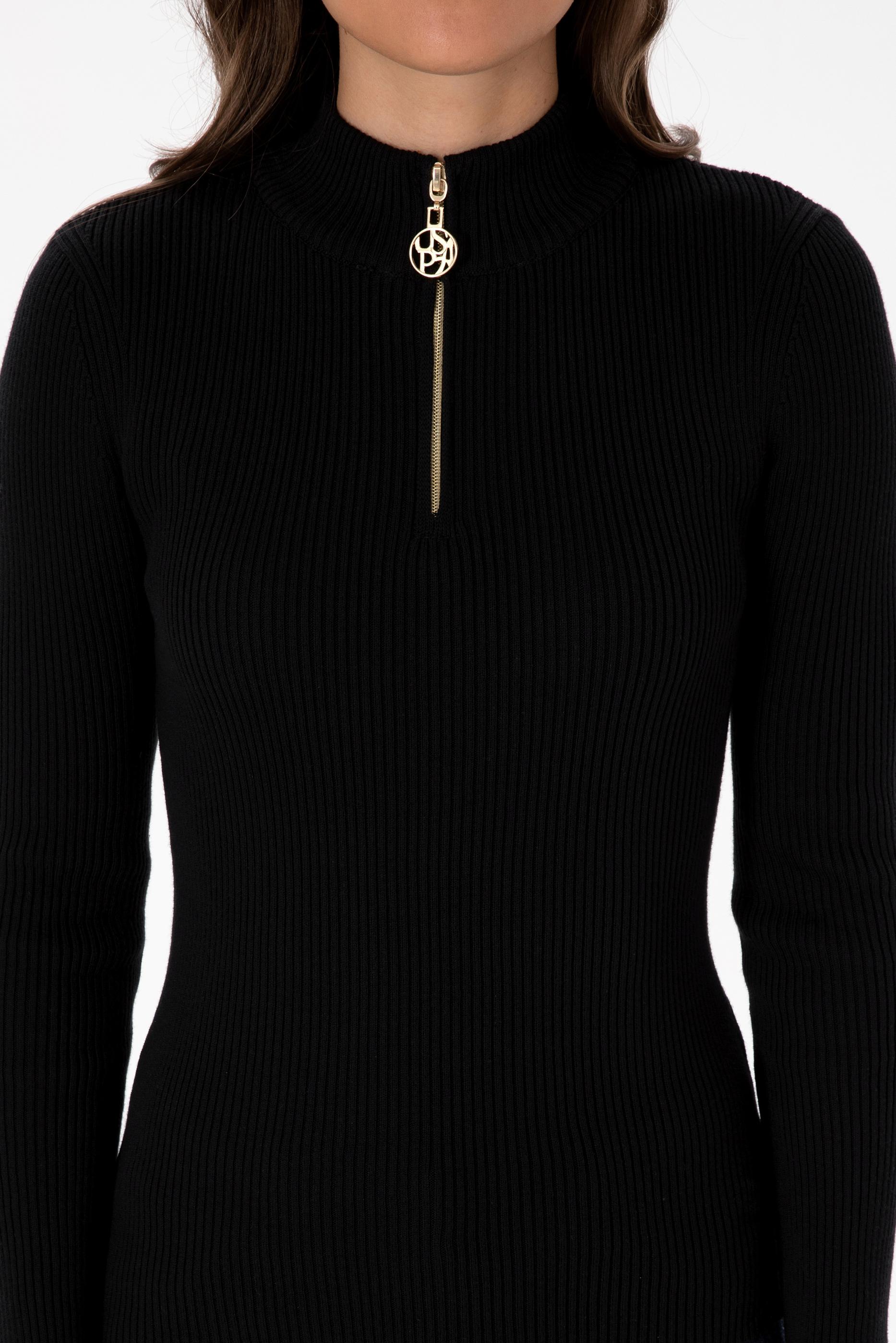 Kadın Siyah V Yaka Fermuarlı Kazak