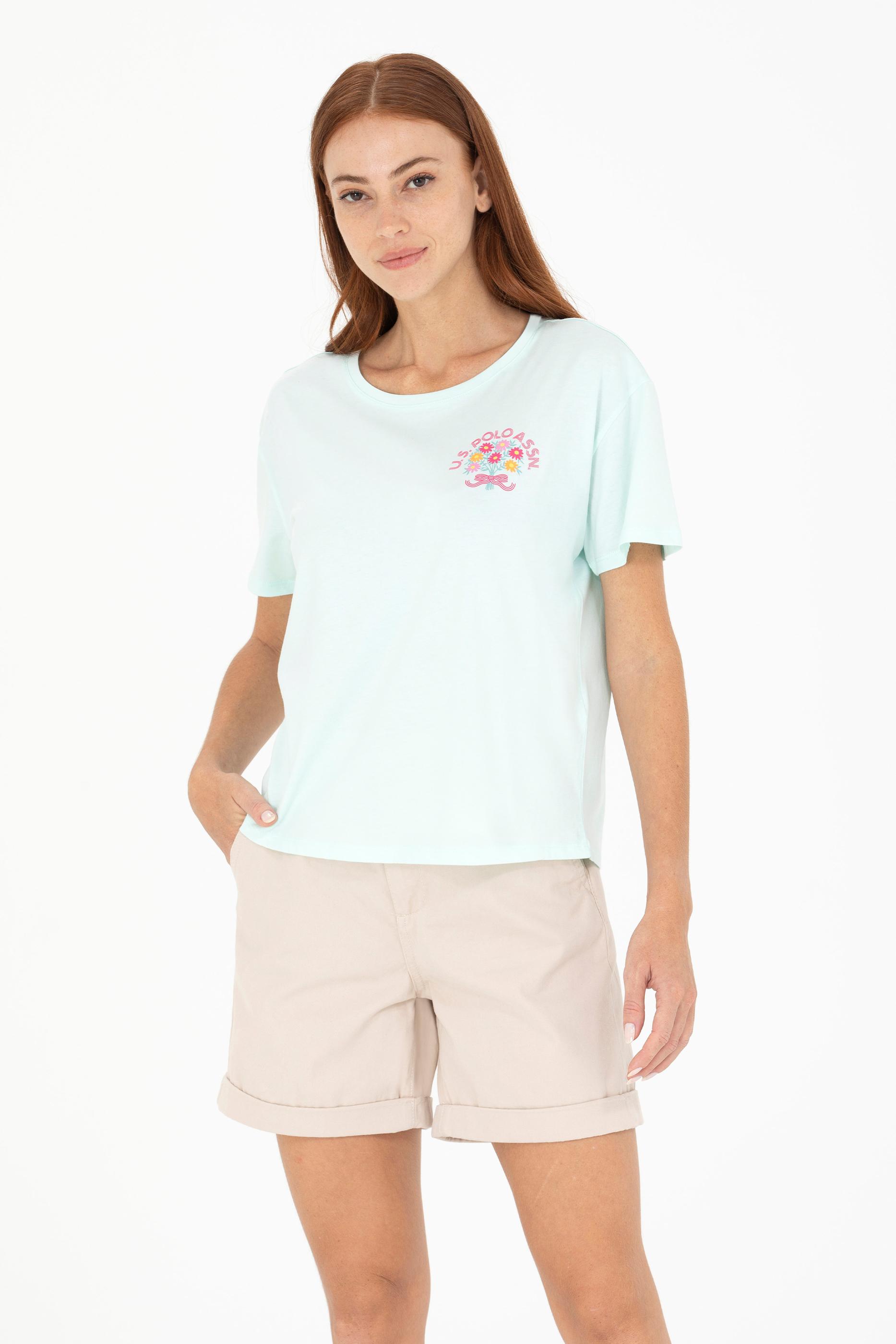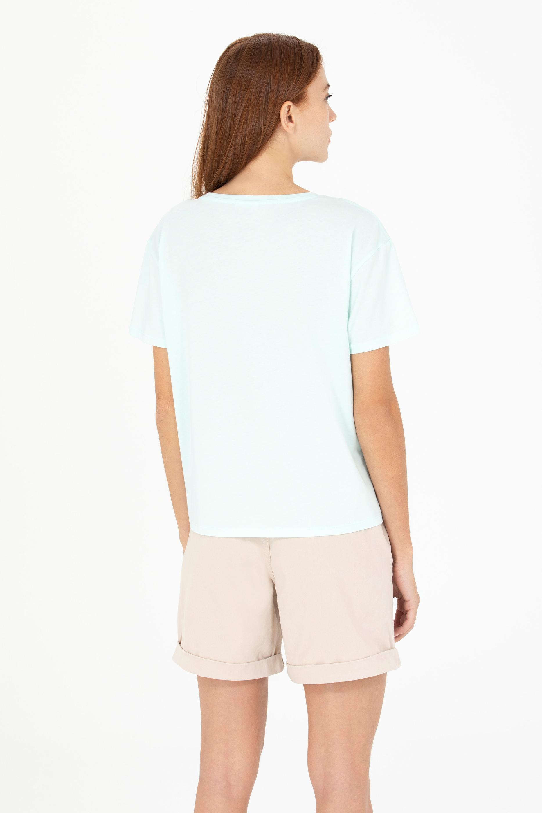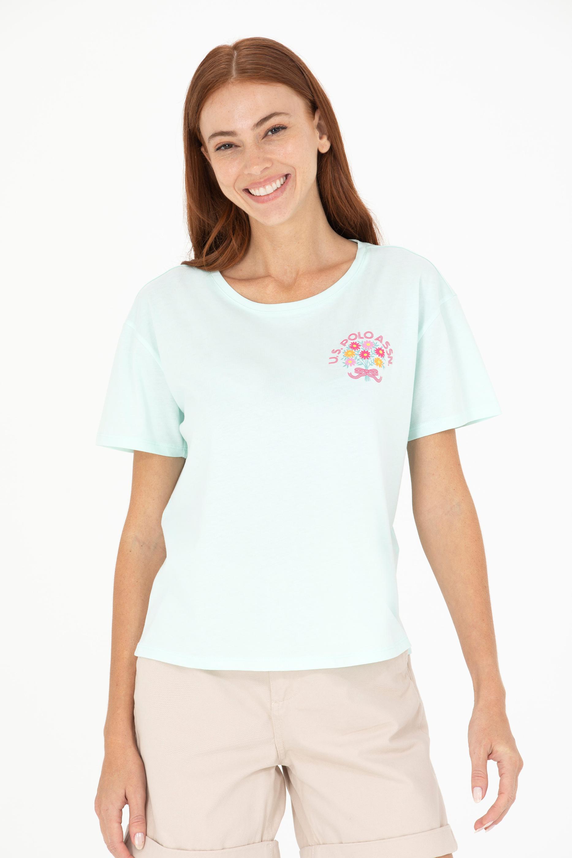 Su yeşili tişört kadınların yaz günlerine enerji katarken, bisiklet yaka tişört tasarımıyla da gün boyu ferah hissettiriyor. Yazlık tişört arayan bayanlar için ideal bir seçenek olup %100 pamuk kullanıldığından dolayı cilt dostudur. Comfort kalıp tişört olması sayesinde vücudu sıkıştırmadan geniş bir hareket özgürlüğü sunuyor. Online alışverişe özel bu kadın tişörtüne hemen sahip olun çiçek desenli USPA baskısıyla farkınızı yansıtın.