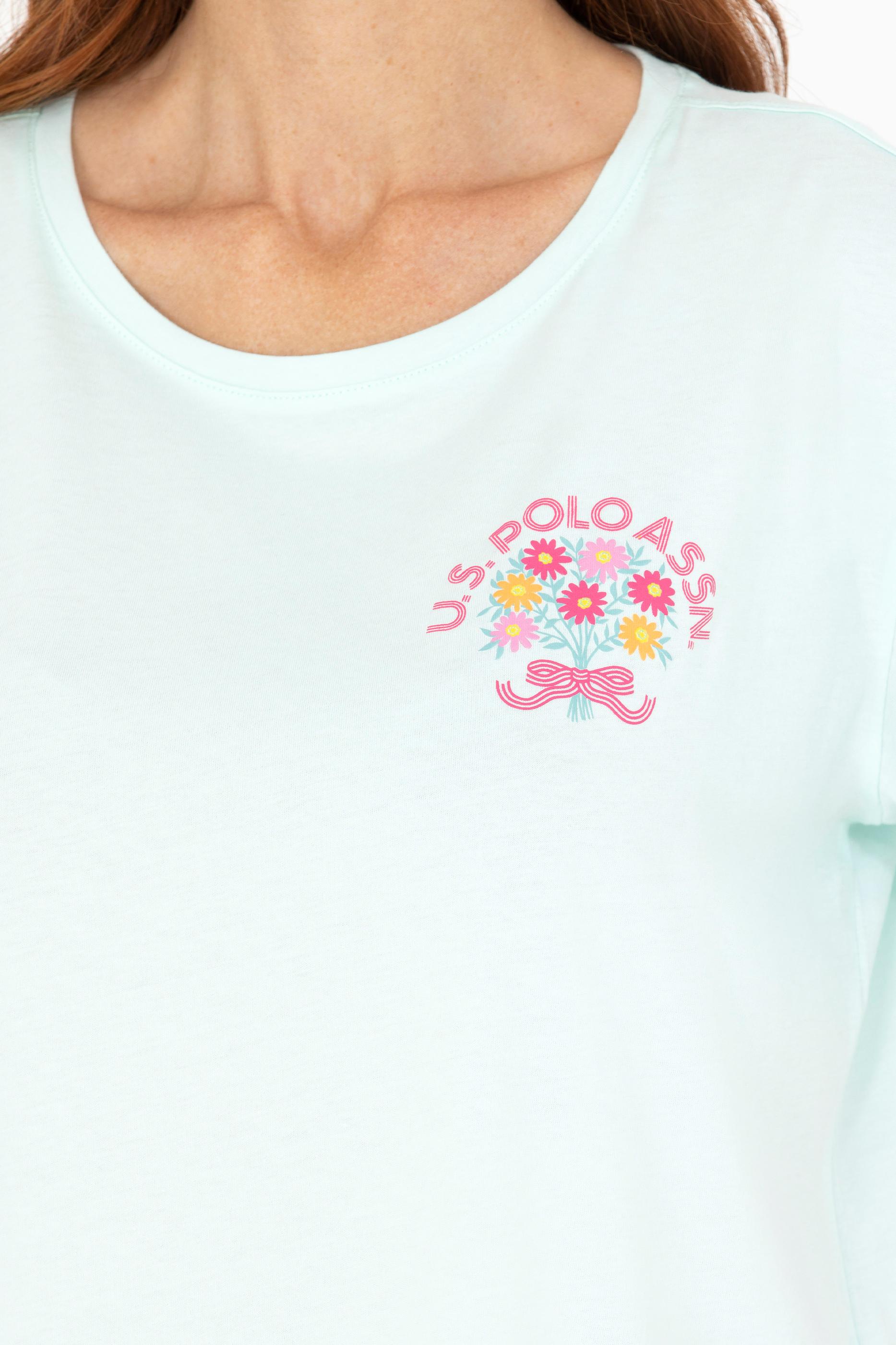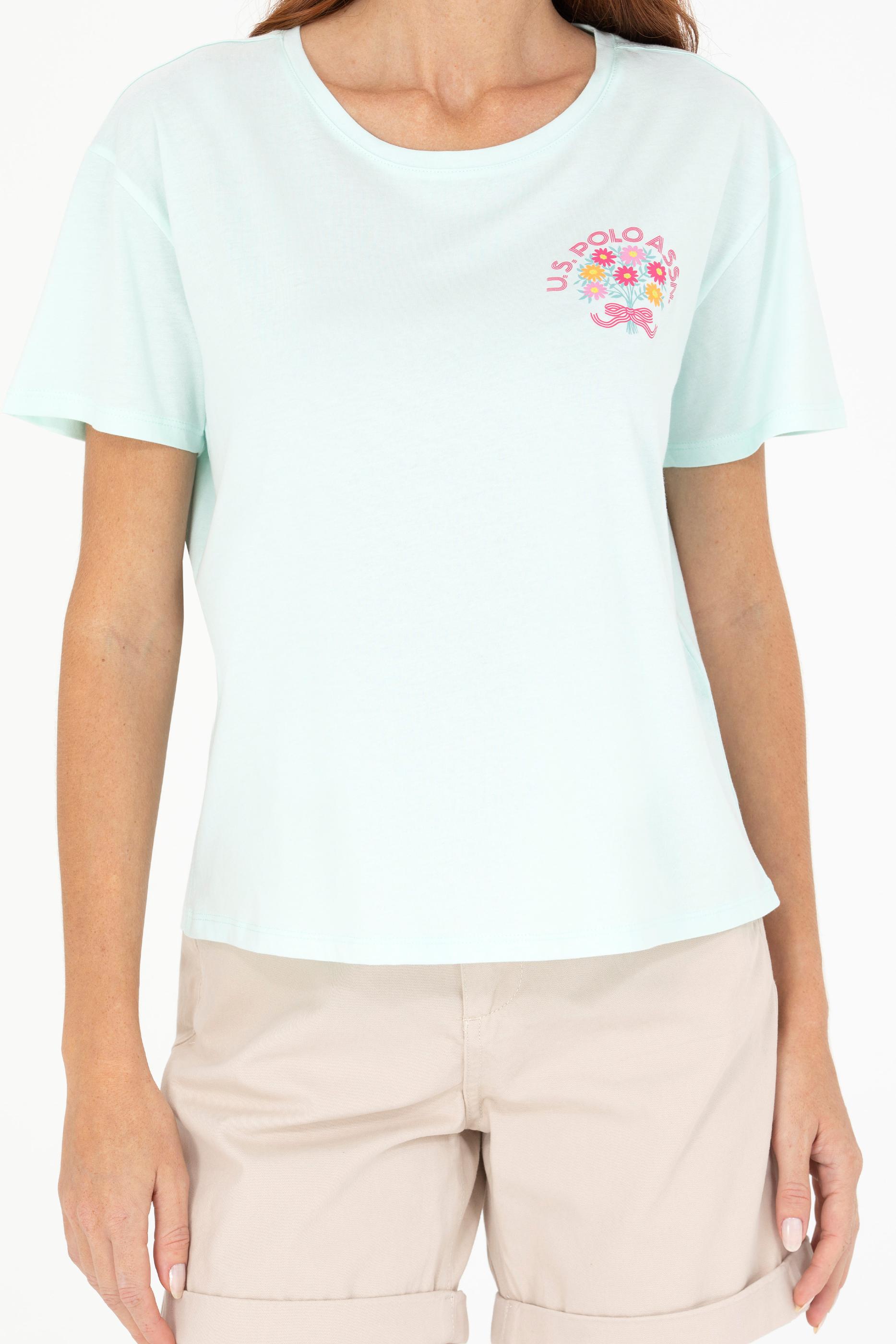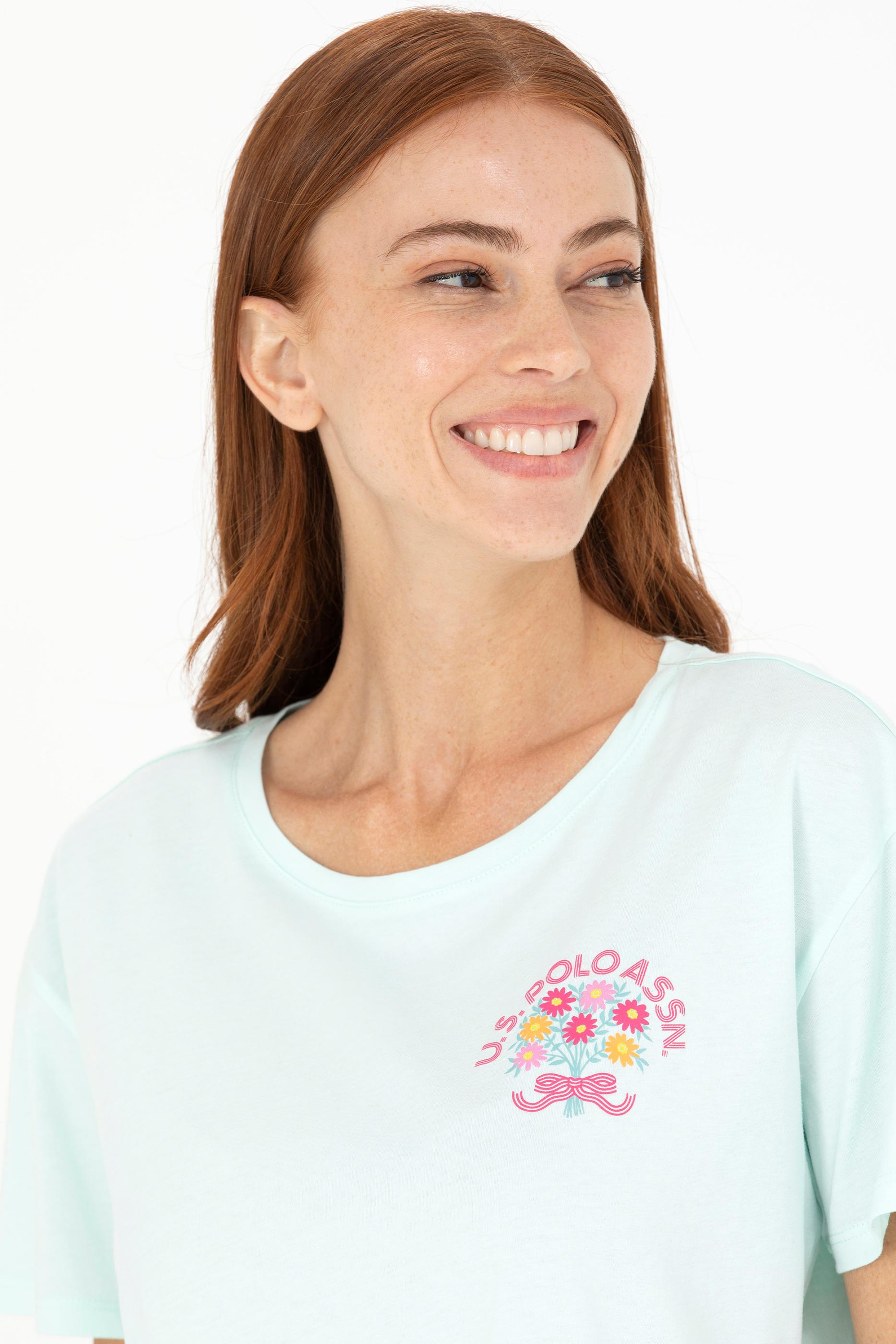 Su yeşili tişört kadınların yaz günlerine enerji katarken, bisiklet yaka tişört tasarımıyla da gün boyu ferah hissettiriyor. Yazlık tişört arayan bayanlar için ideal bir seçenek olup %100 pamuk kullanıldığından dolayı cilt dostudur. Comfort kalıp tişört olması sayesinde vücudu sıkıştırmadan geniş bir hareket özgürlüğü sunuyor. Online alışverişe özel bu kadın tişörtüne hemen sahip olun çiçek desenli USPA baskısıyla farkınızı yansıtın.