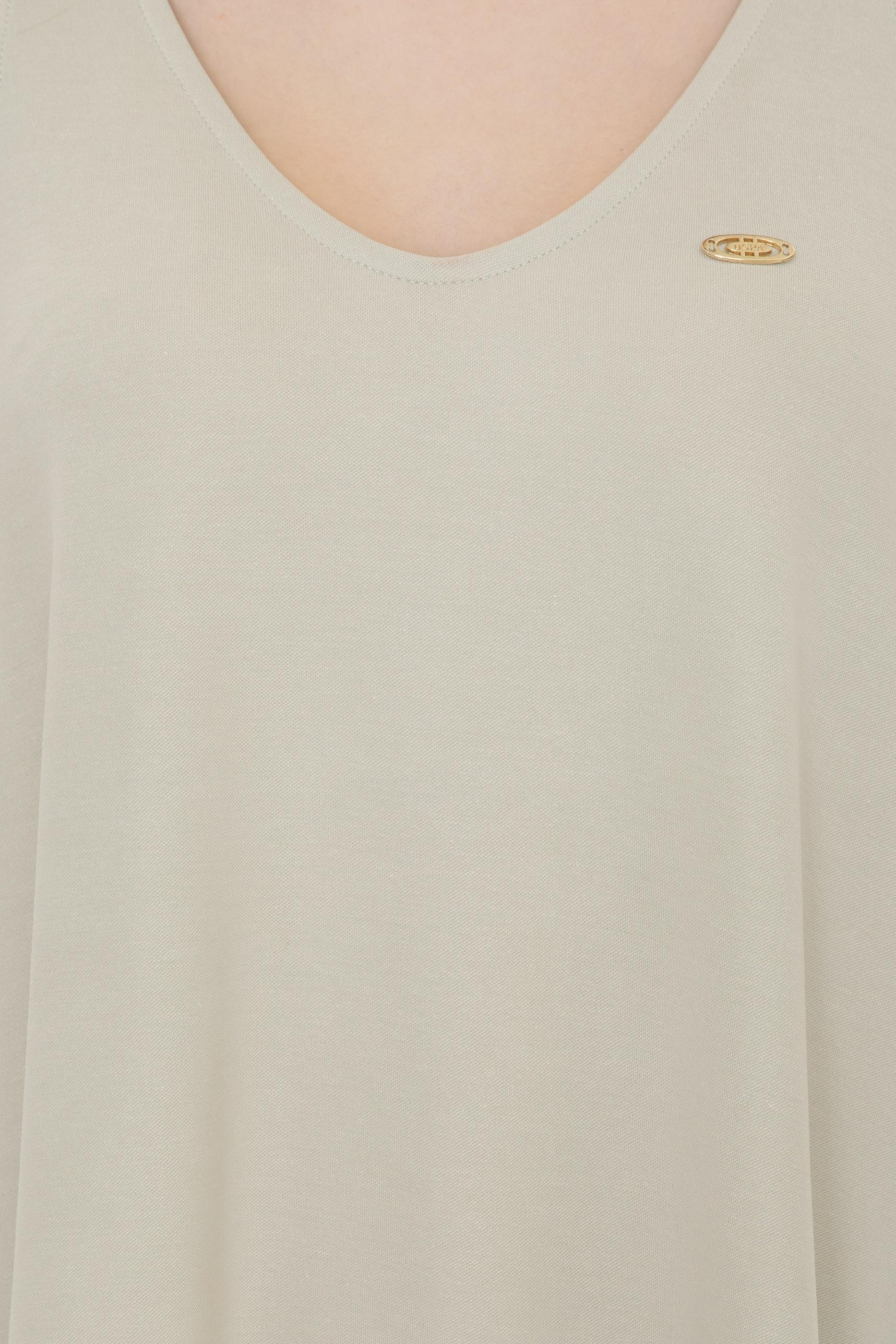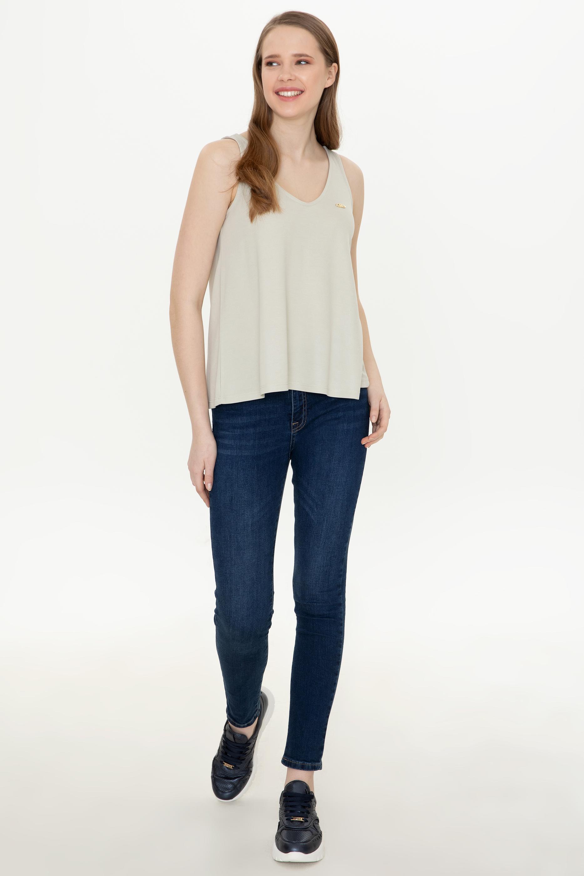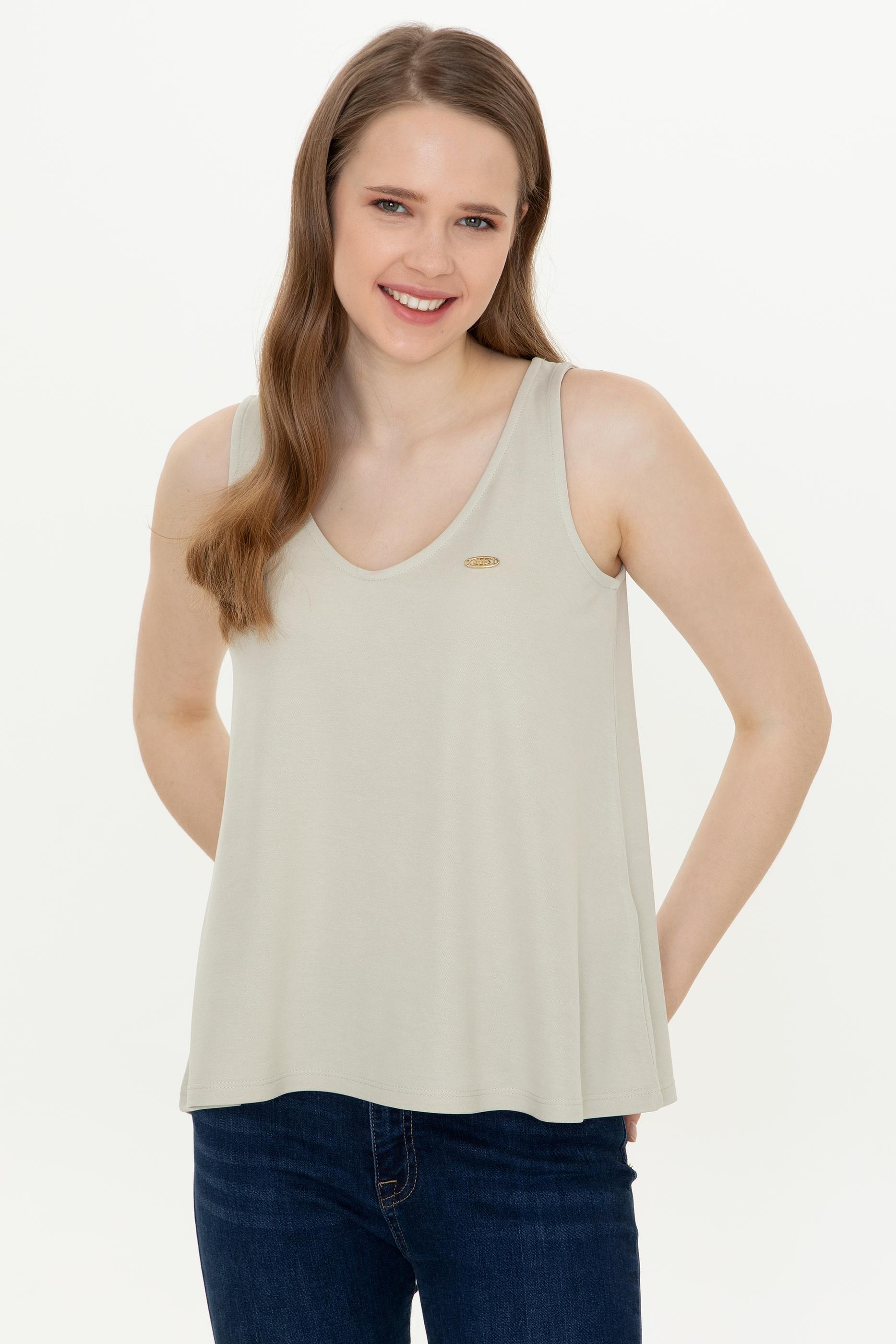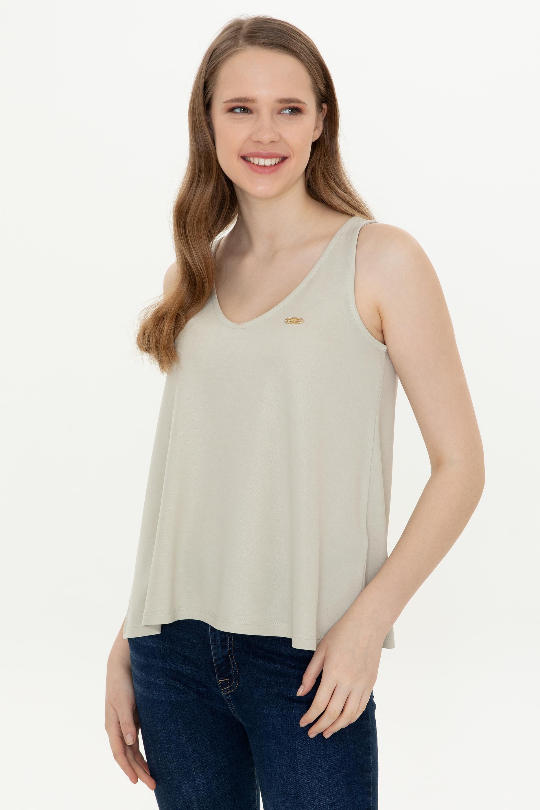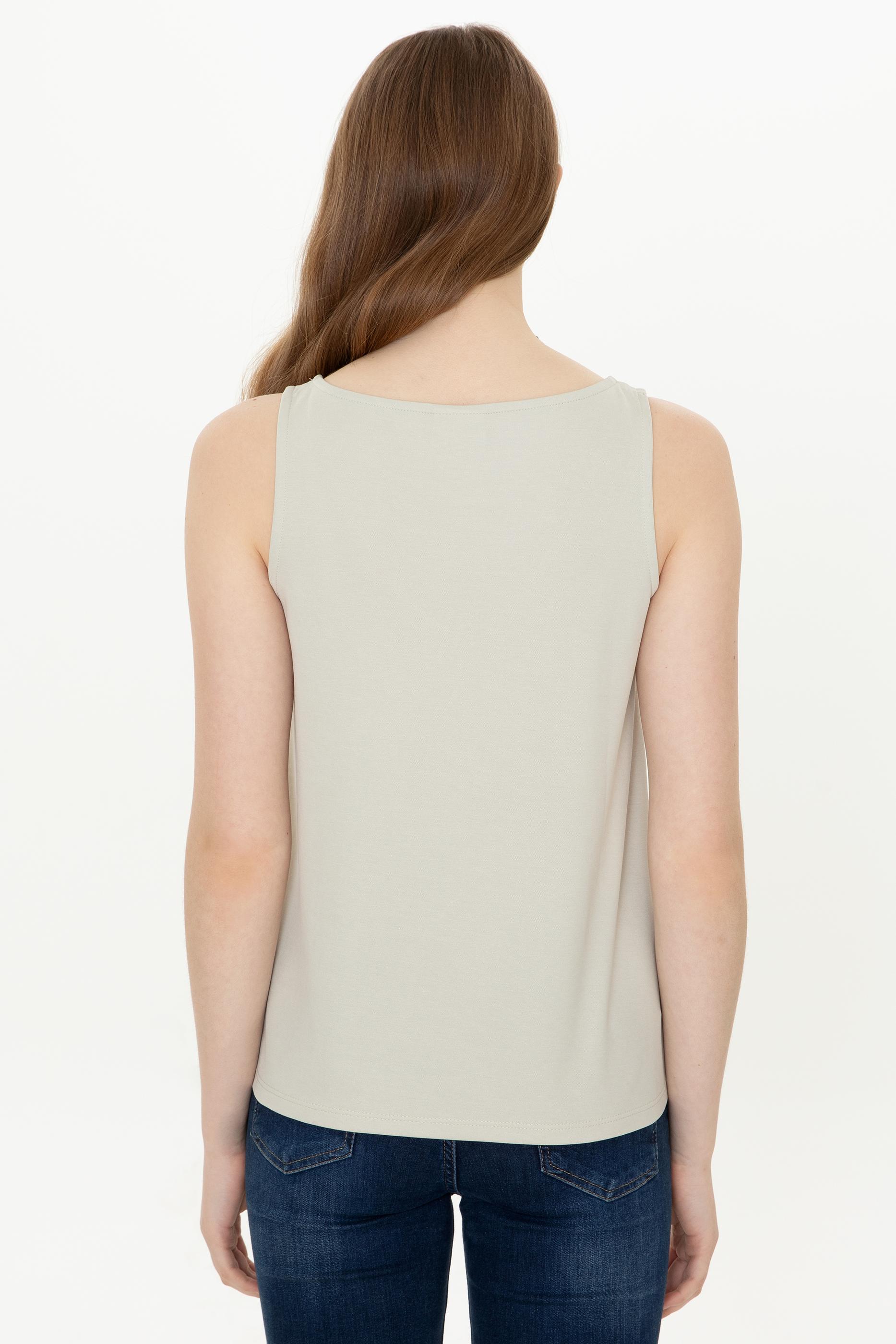 Sıcak yaz aylarını hem bunalmadan hem de şıklığınızdan ödün vermeden geçirmek için kadın kolsuz t-shirt modelimizi tercih edebilirsiniz. Kolsuz ve v yaka t-shirt modelimiz a form kesimiyle rahat tarzın yeni gözdesi oluyor. %70 modal, %30 polyester karışımı kumaştan üretilen model sıcak havalarda tiril tiril ve ferah bir kullanım vadediyor. Taş t-shirt modelimizin rengi ise tarzınıza iç açıcı bir hava katıyor.