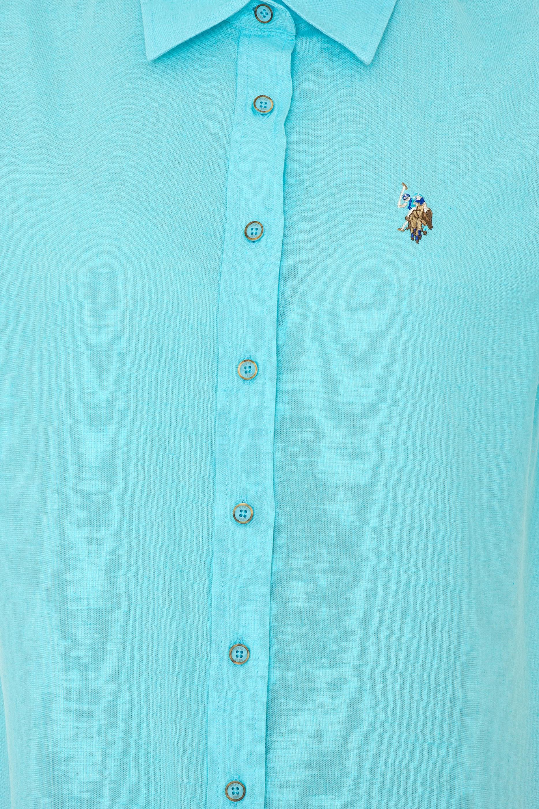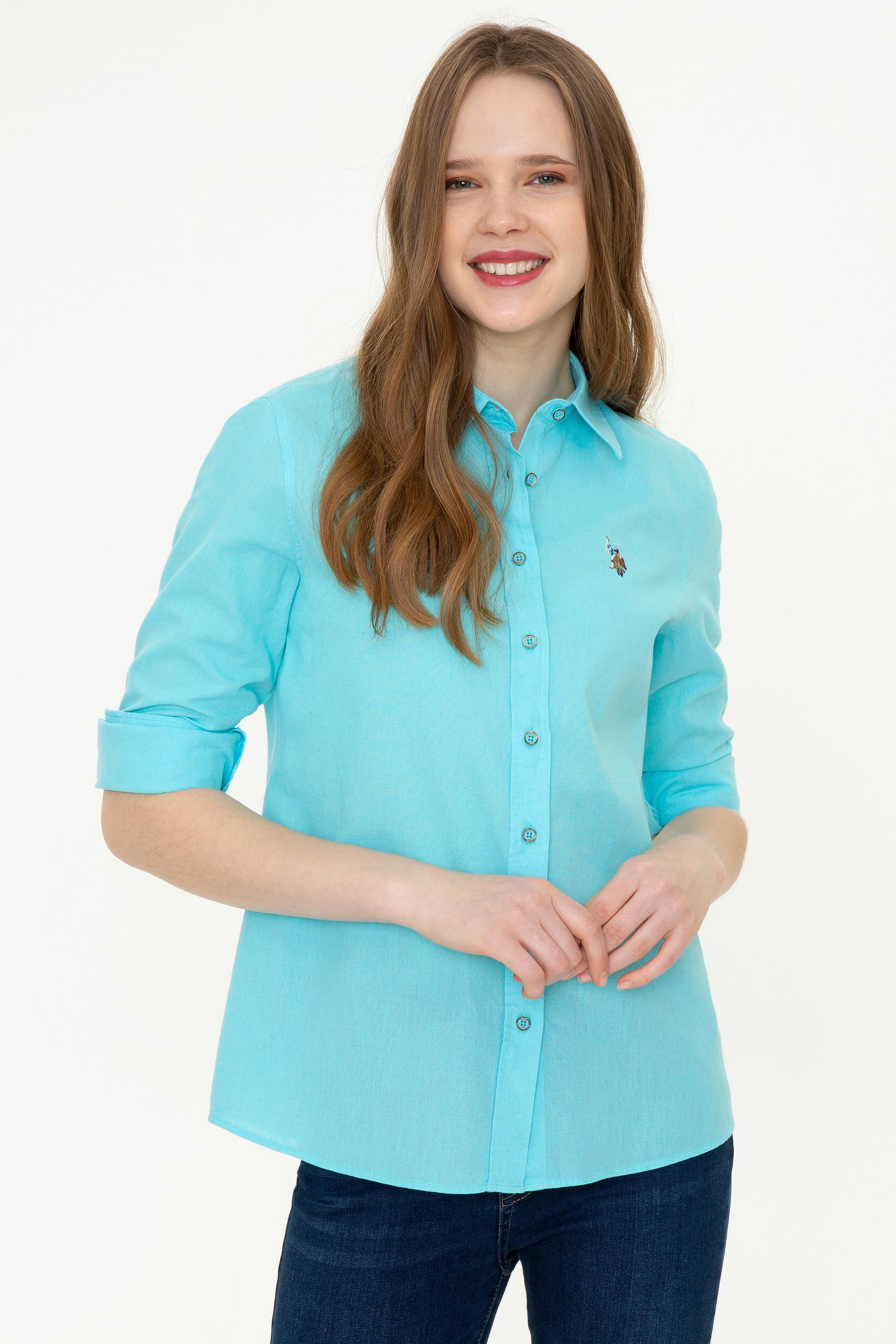 Kadın Turkuaz Keten Görünümlü Uzun Kollu Basic Gömlek