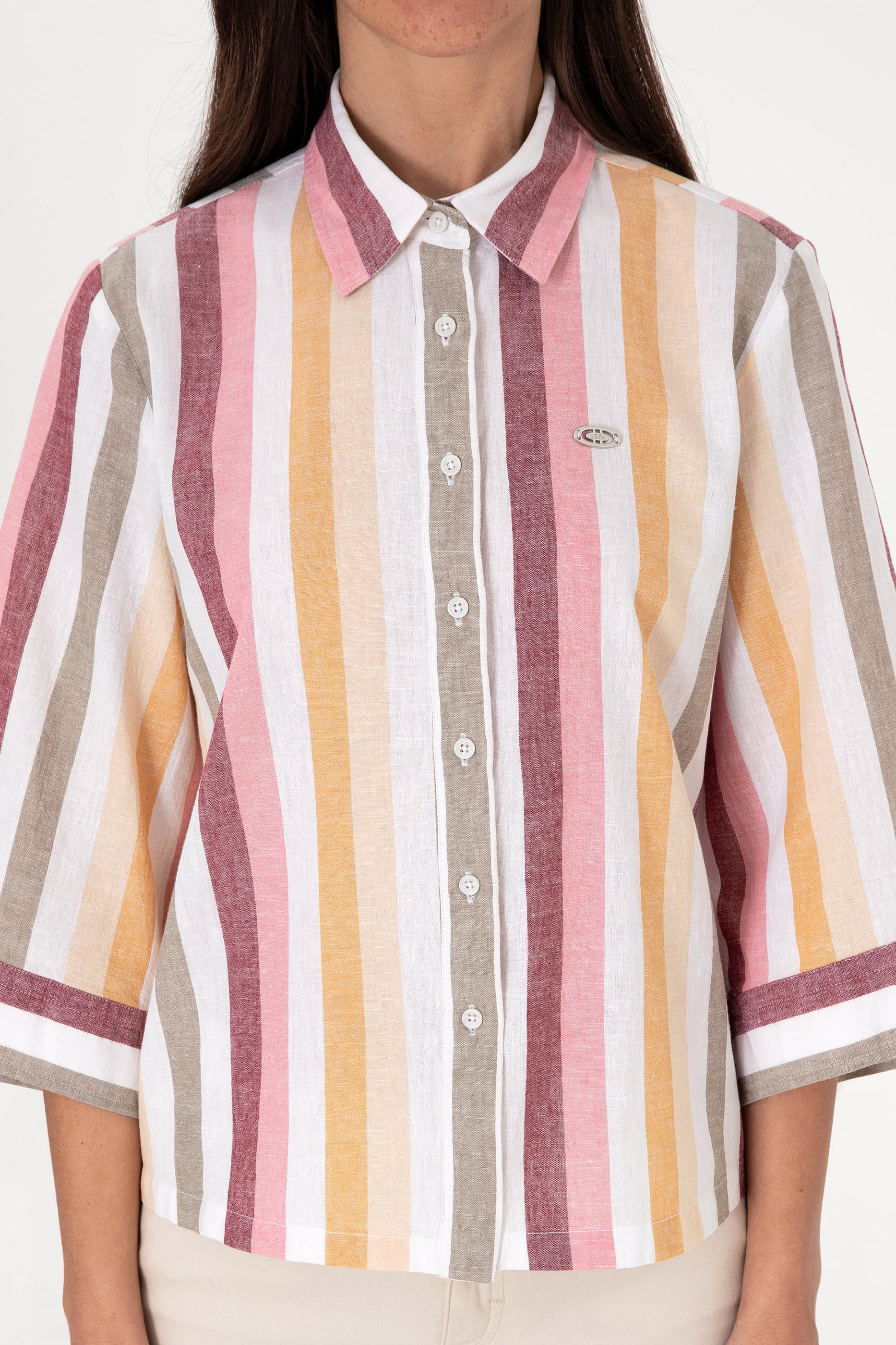 Kadın Turuncu Çizgili Keten Karışımlı Uzun Kollu Gömlek