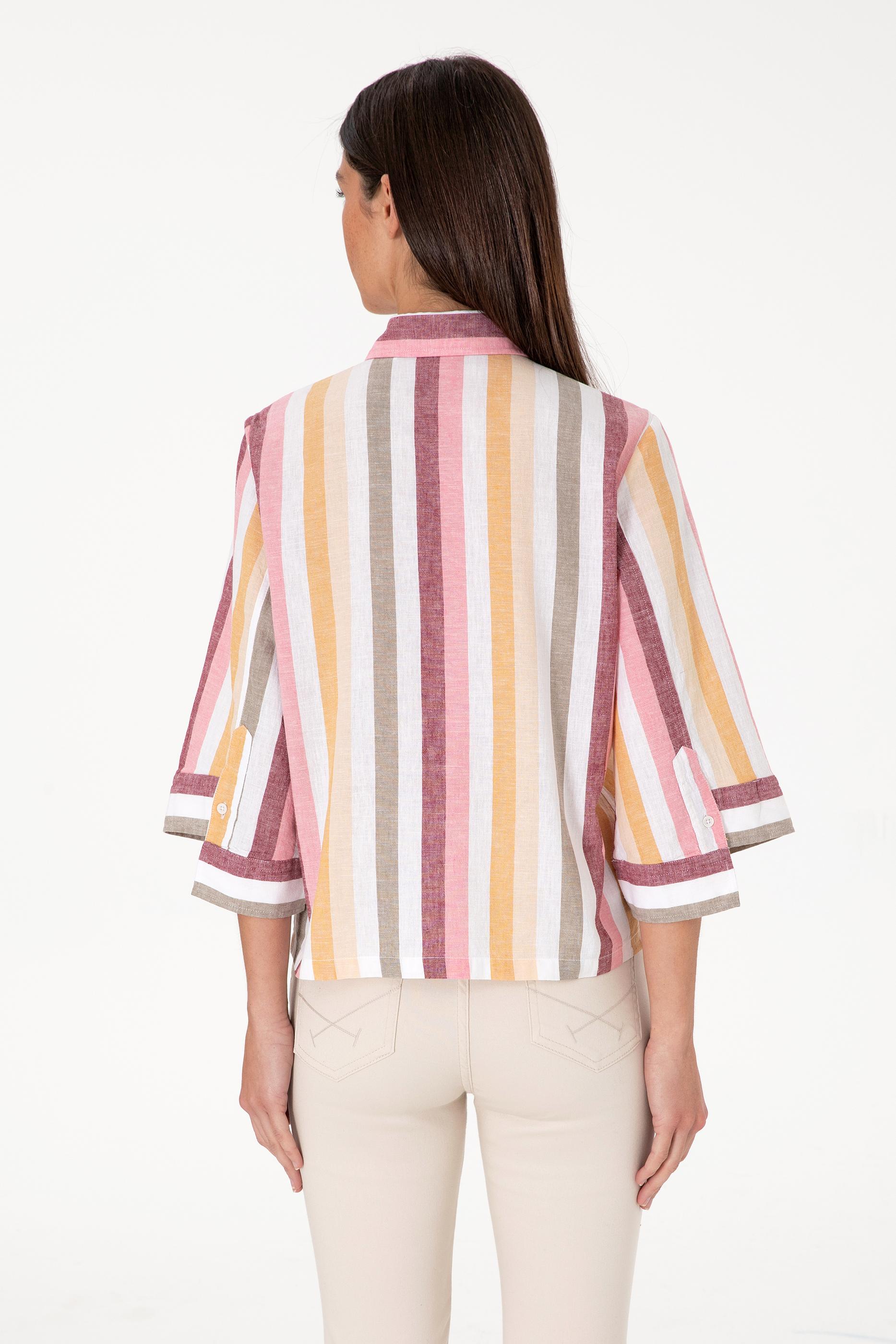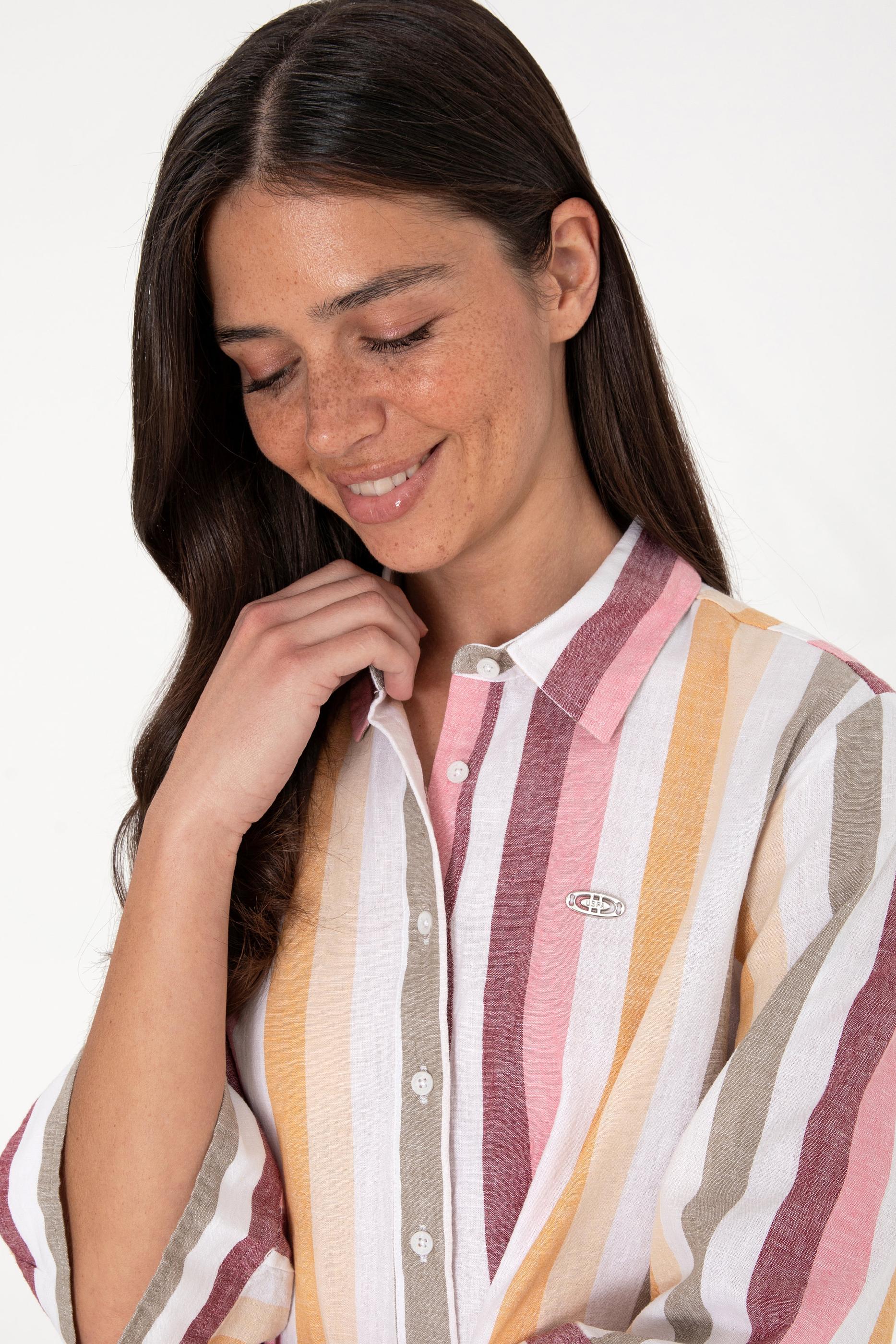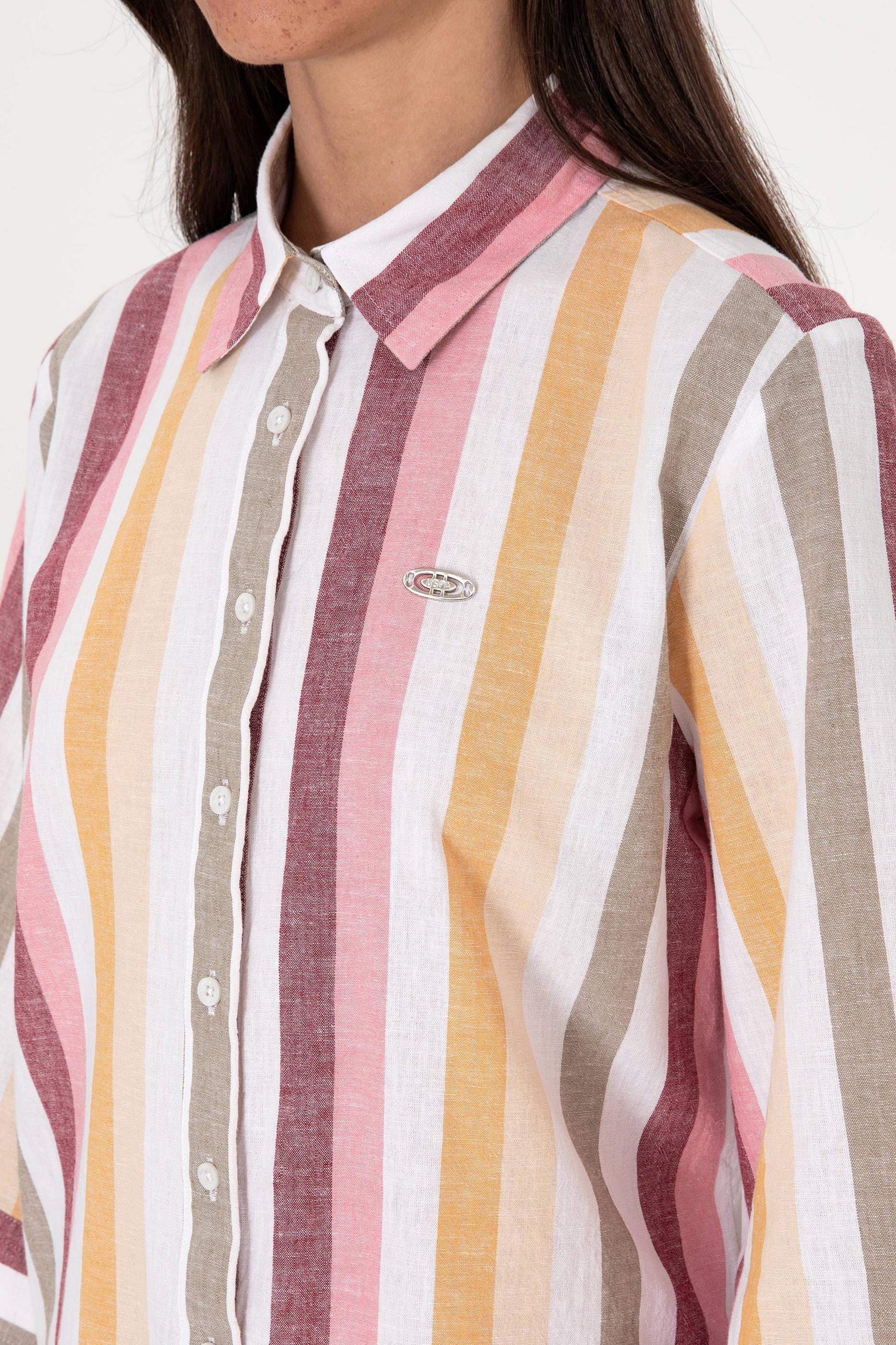 - Kadın Turuncu Çizgili Keten Karışımlı Uzun Kollu Gömlek