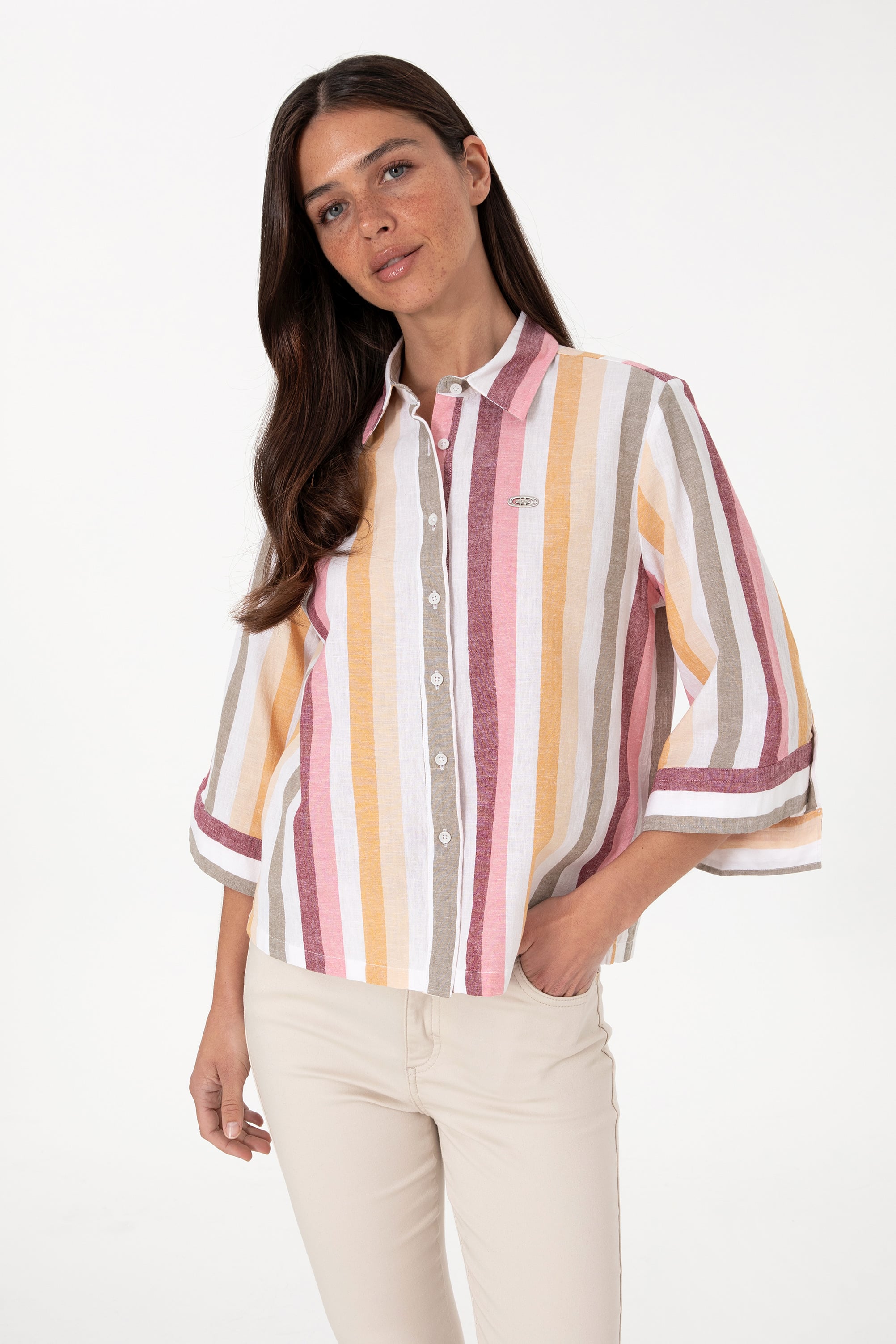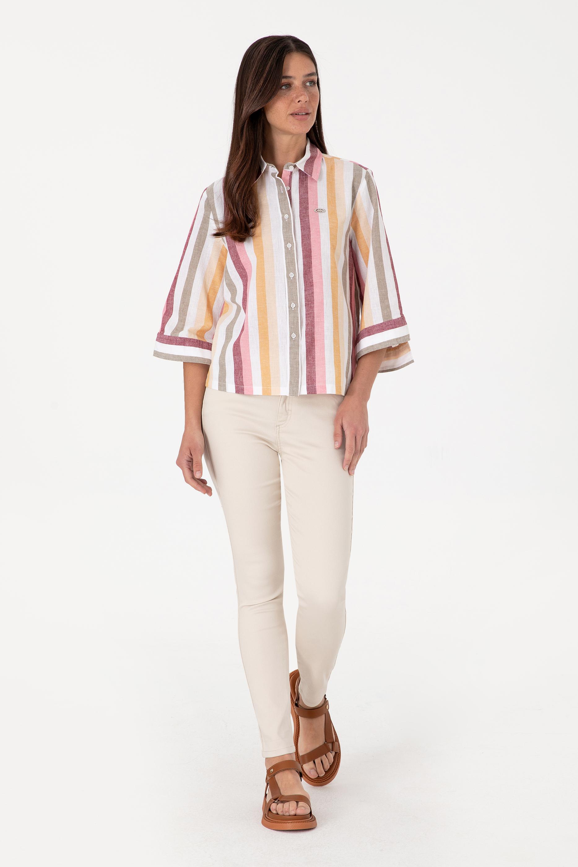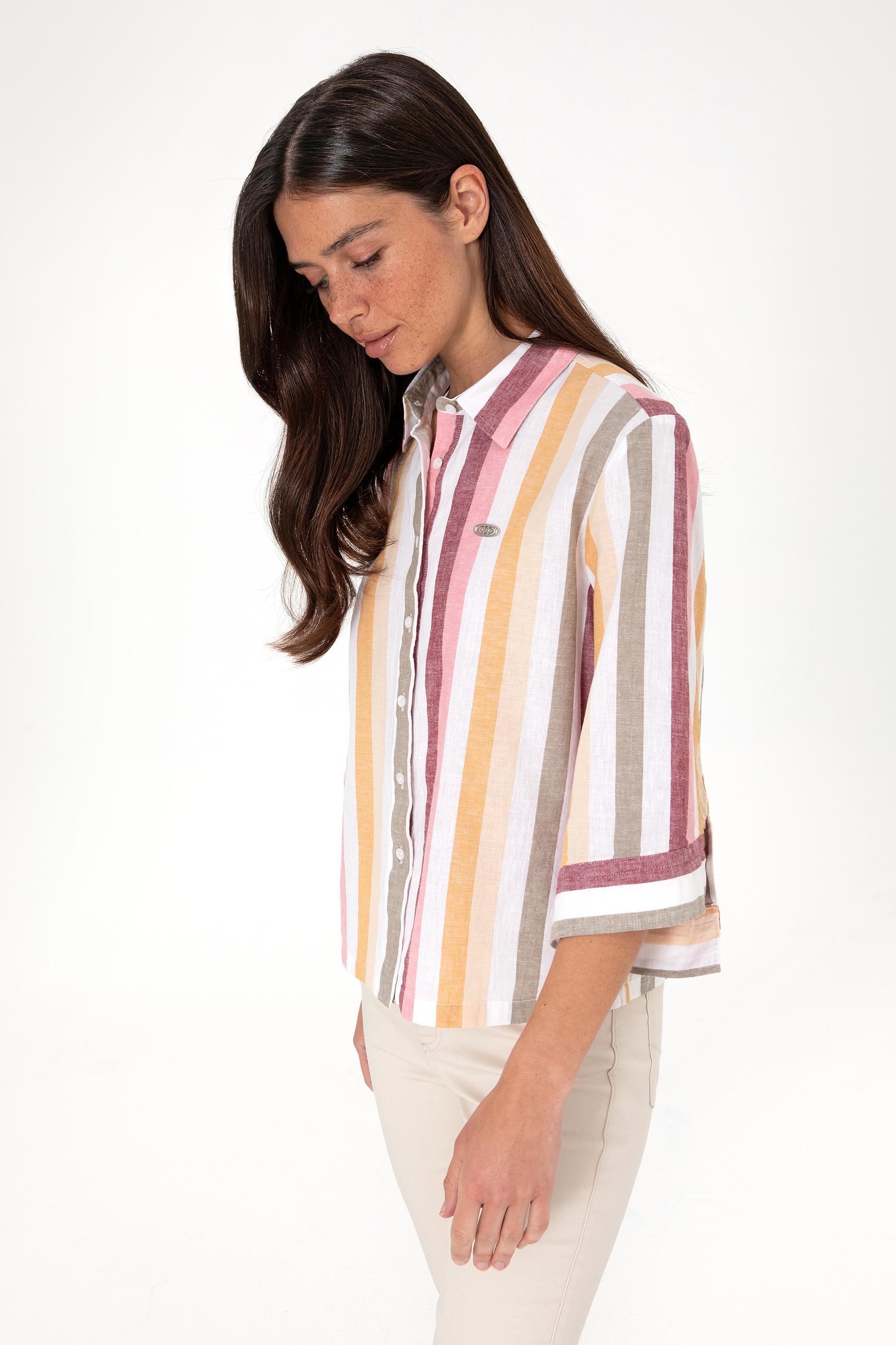- Kadın Turuncu Çizgili Keten Karışımlı Uzun Kollu Gömlek