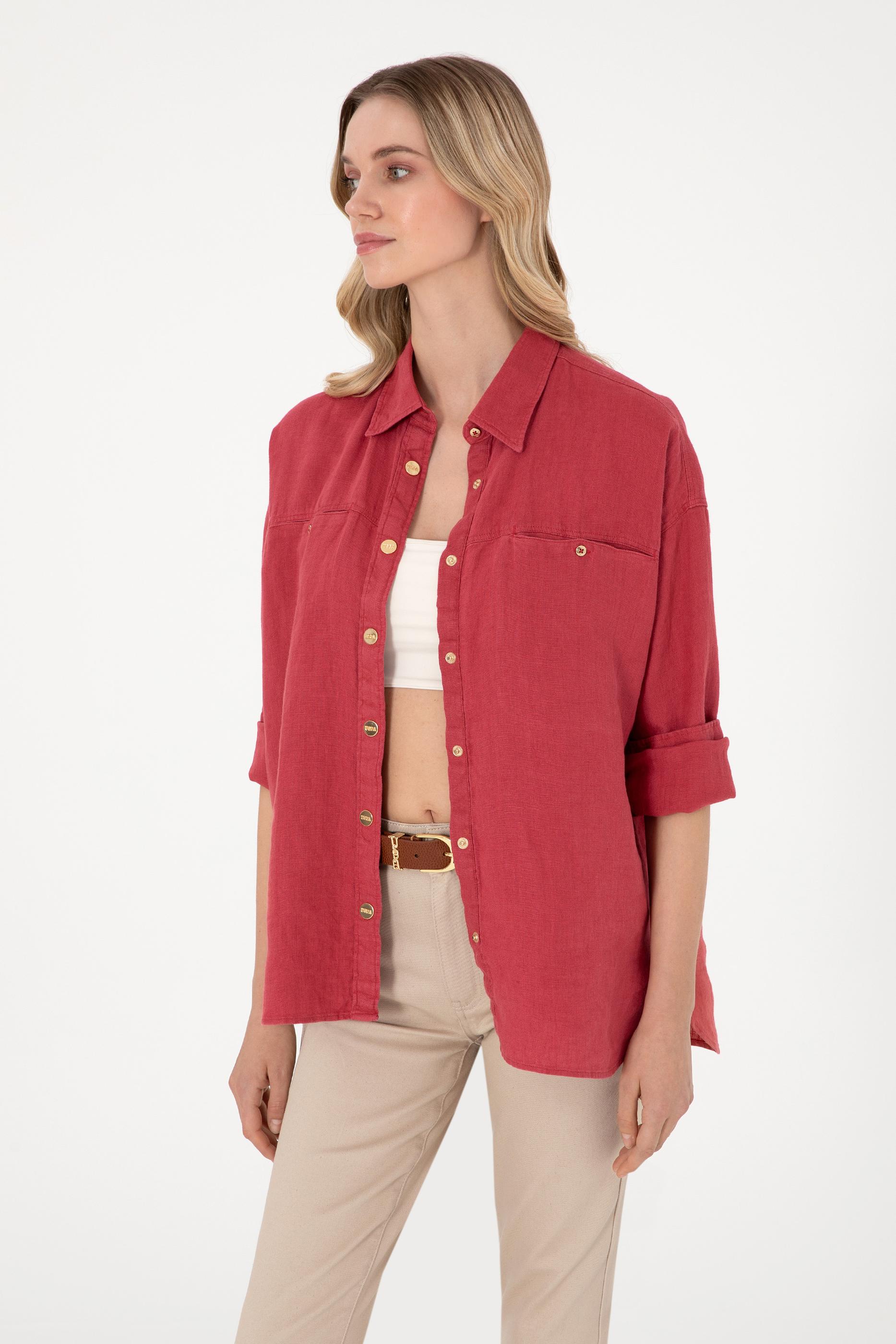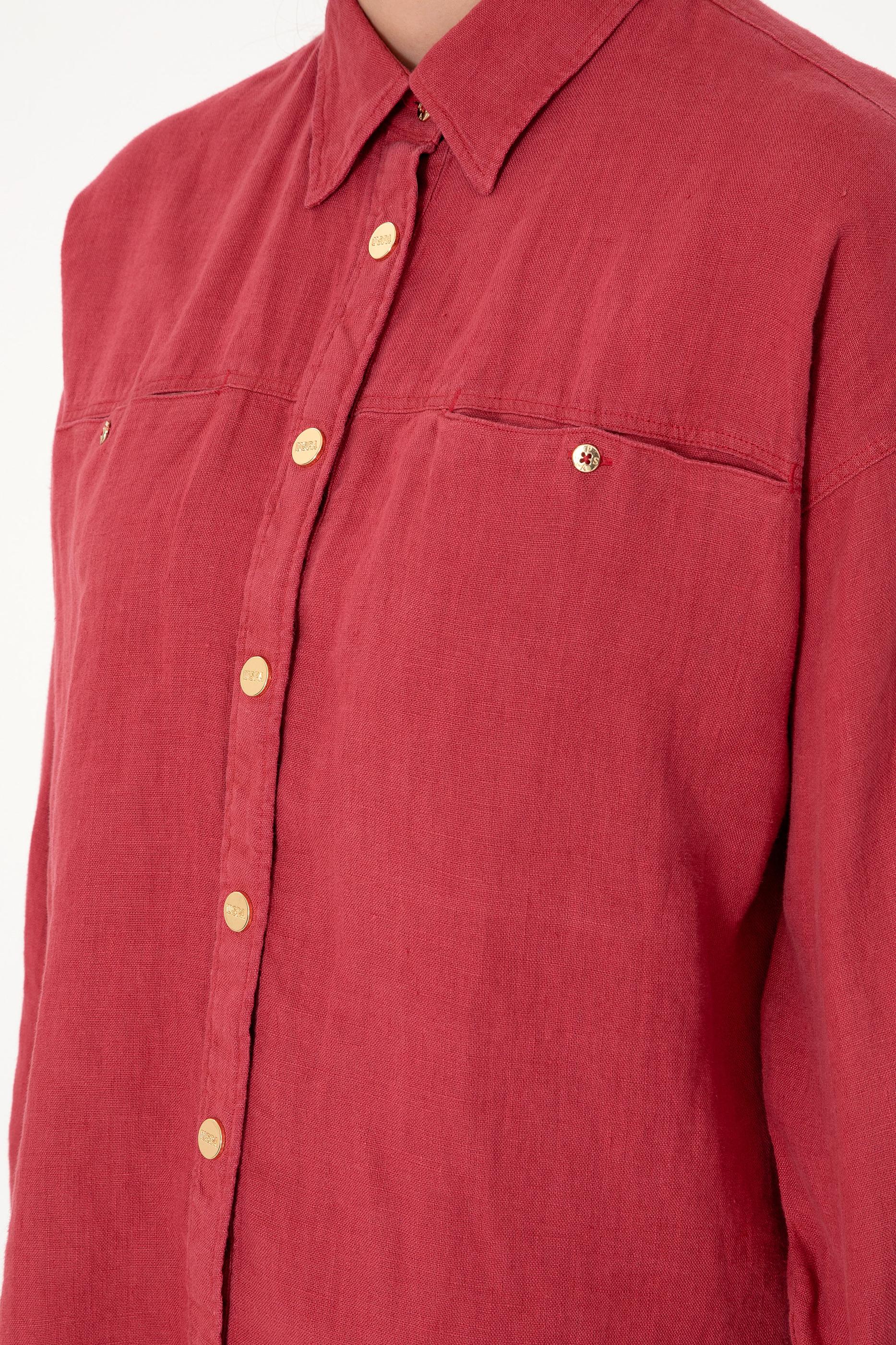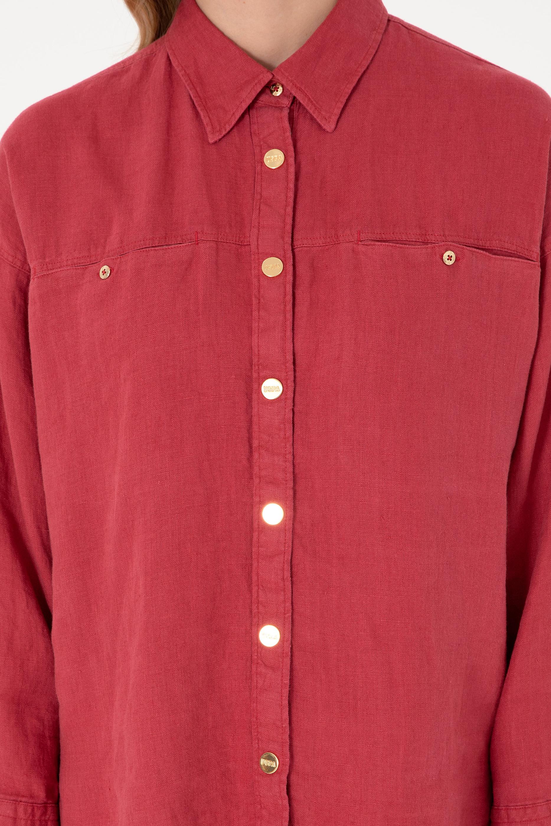 Kadın Vişne Uzun Kollu Keten Tunik Gömlek