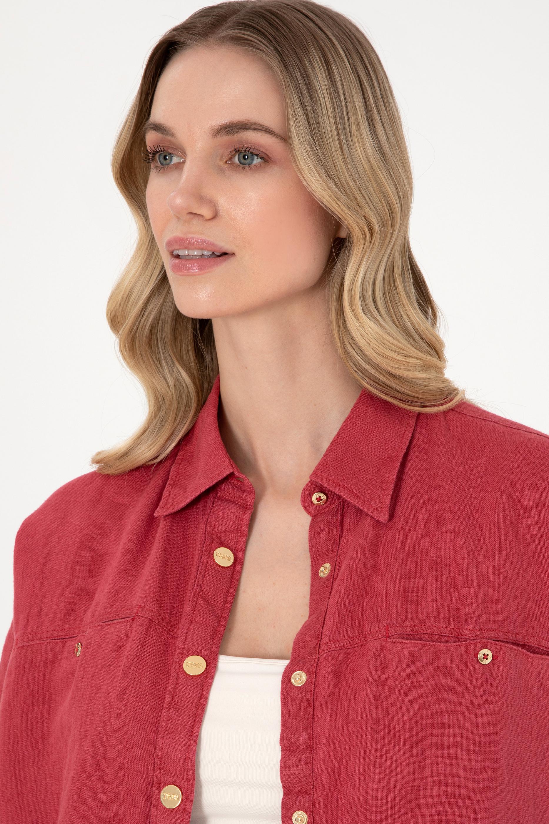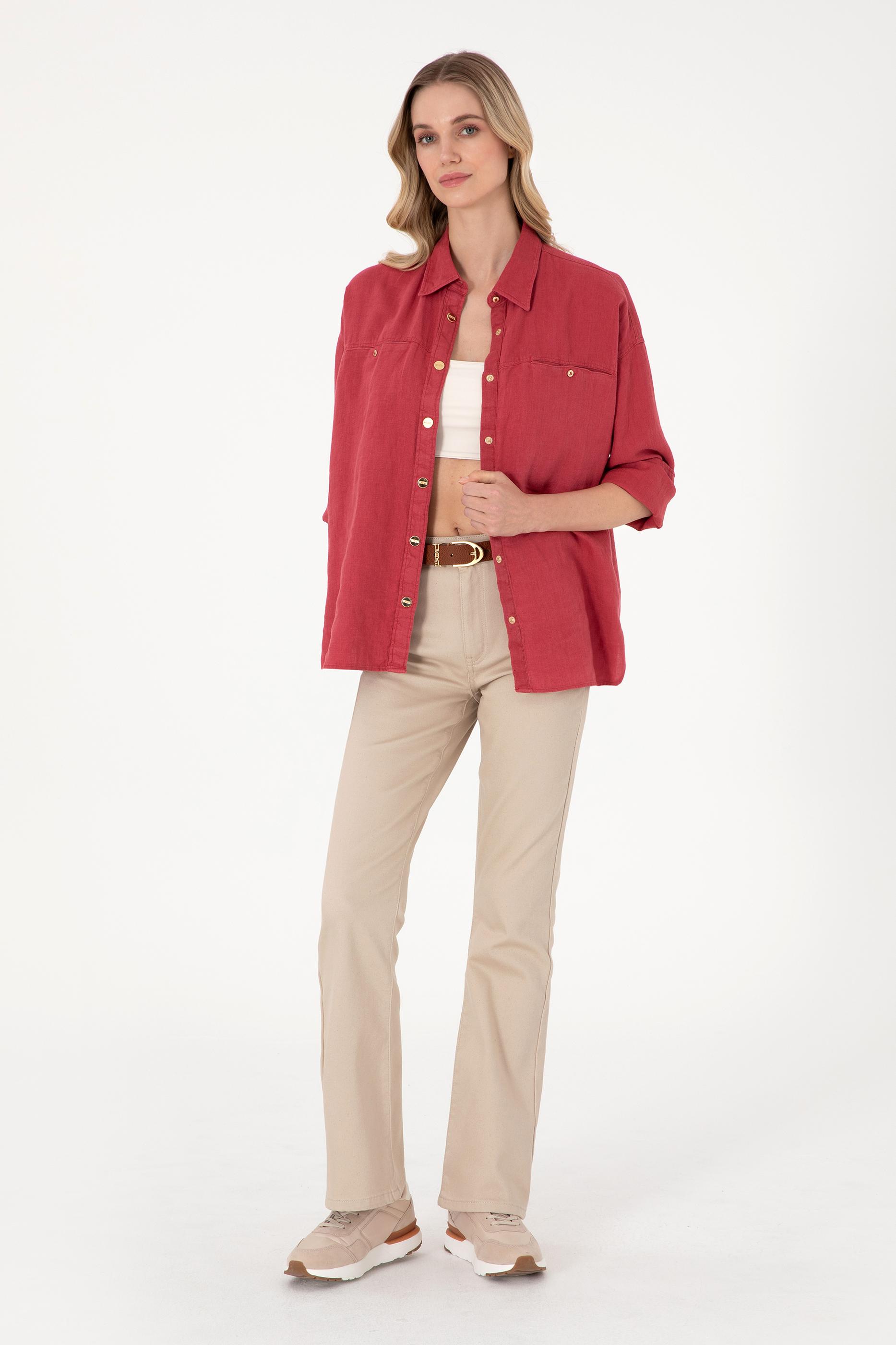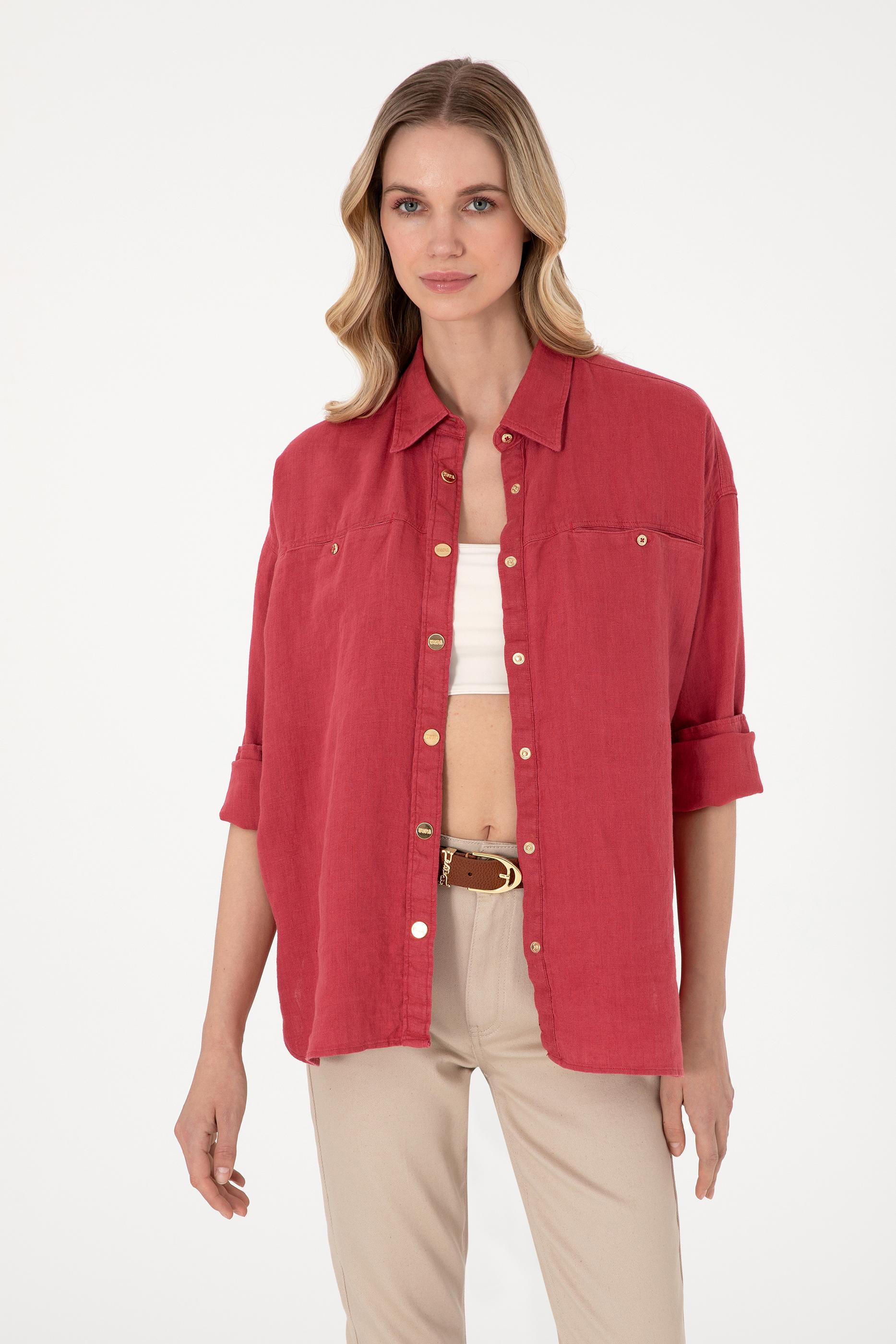 Kadın Vişne Uzun Kollu Keten Tunik Gömlek
