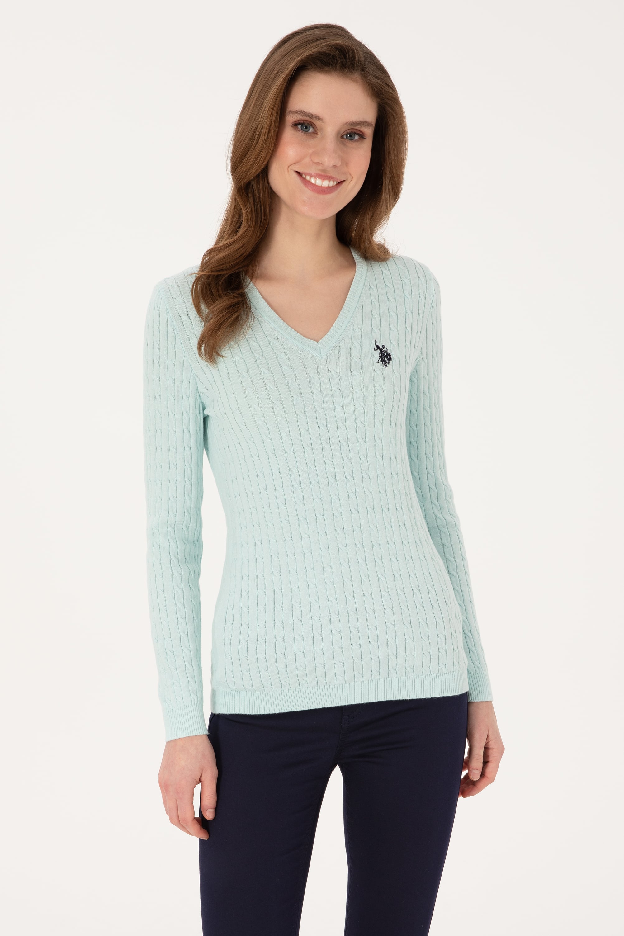 Kadın Mint V Yaka Basic Kazak