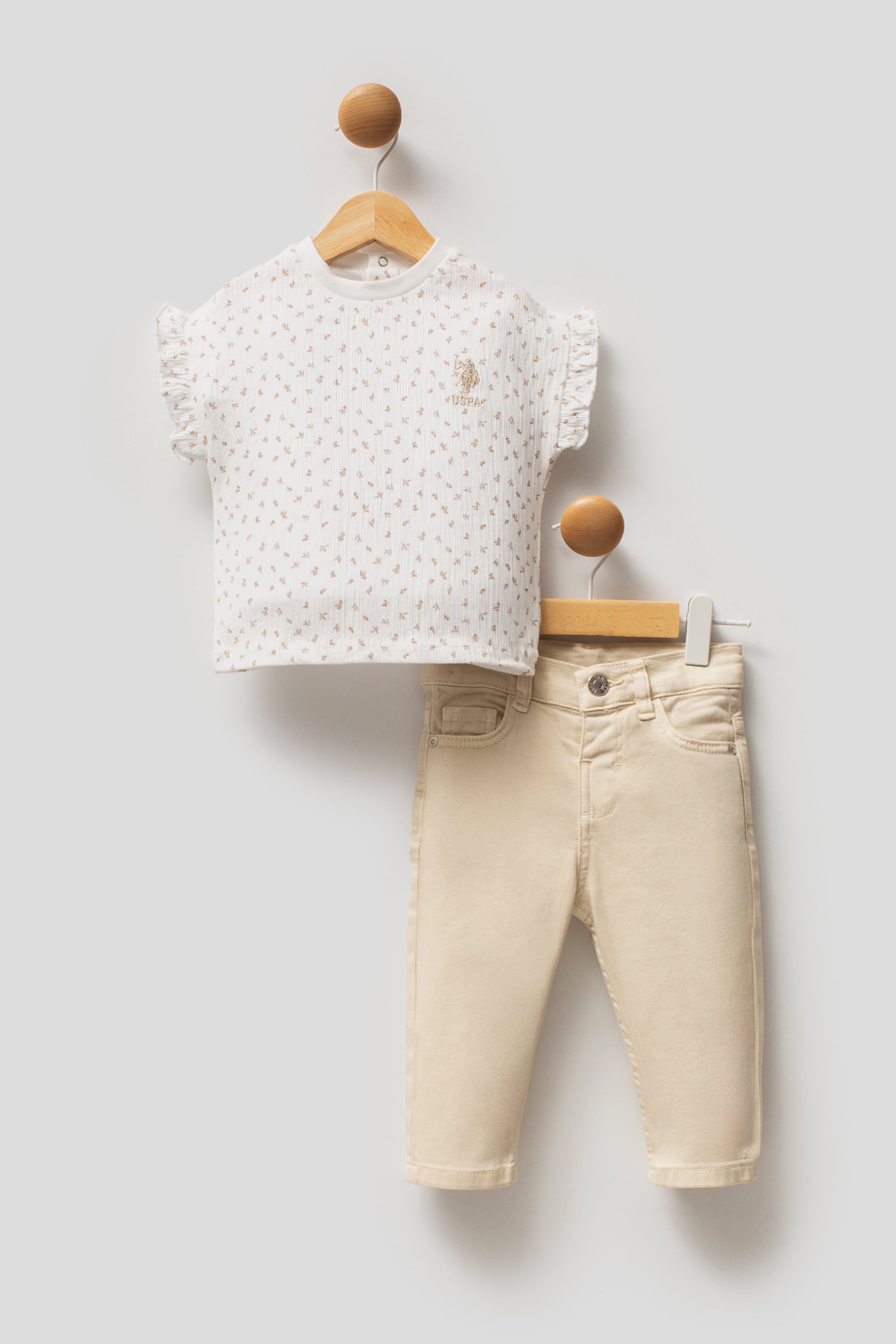 - Kız Bebek Ekru Fırfır Kollu Pamuklu Tişört Jean Pantolon Takım 2'li