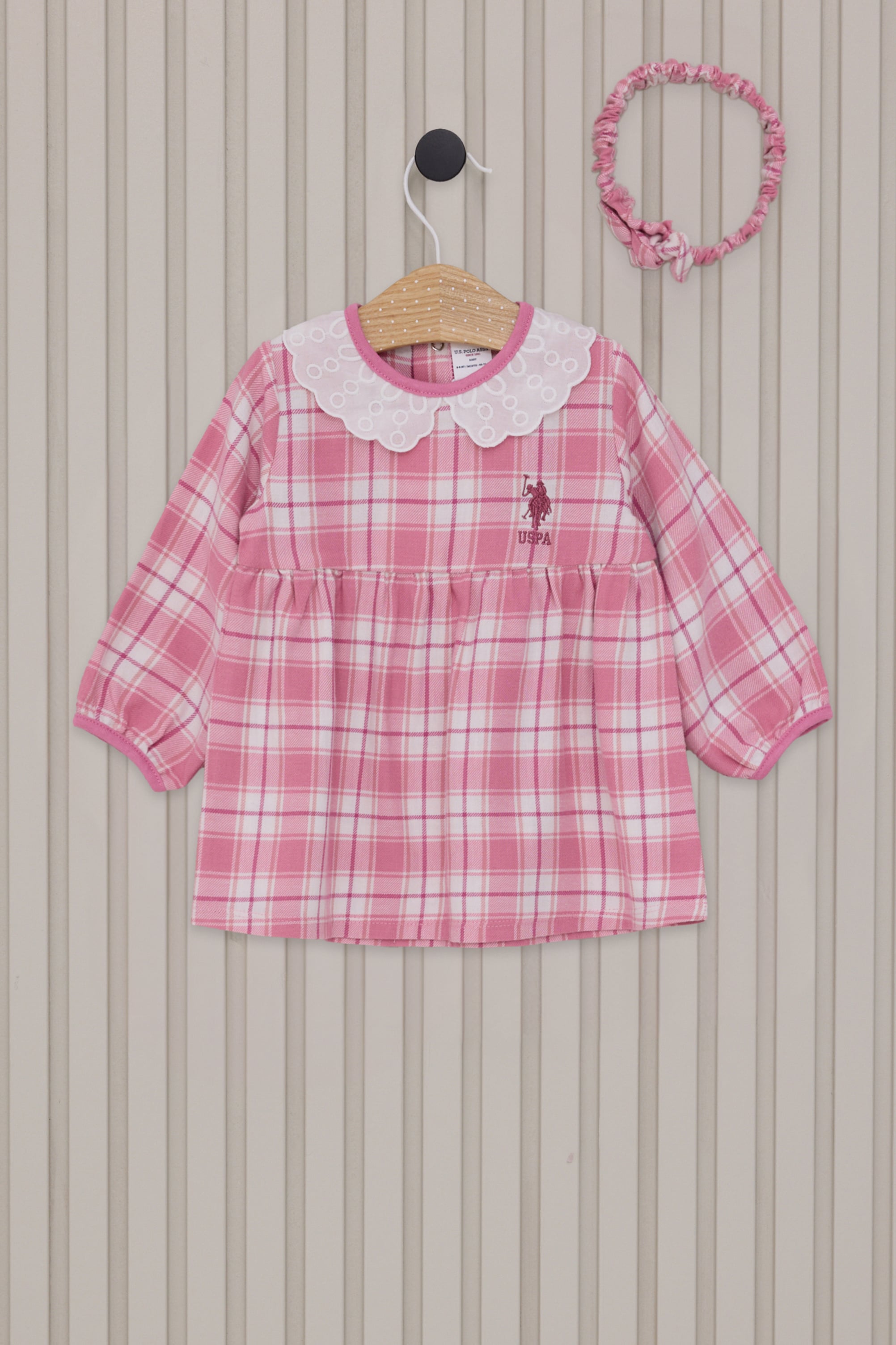 - Kız Bebek Pembe Ekose Desenli Elbise Bandana 2'li Set