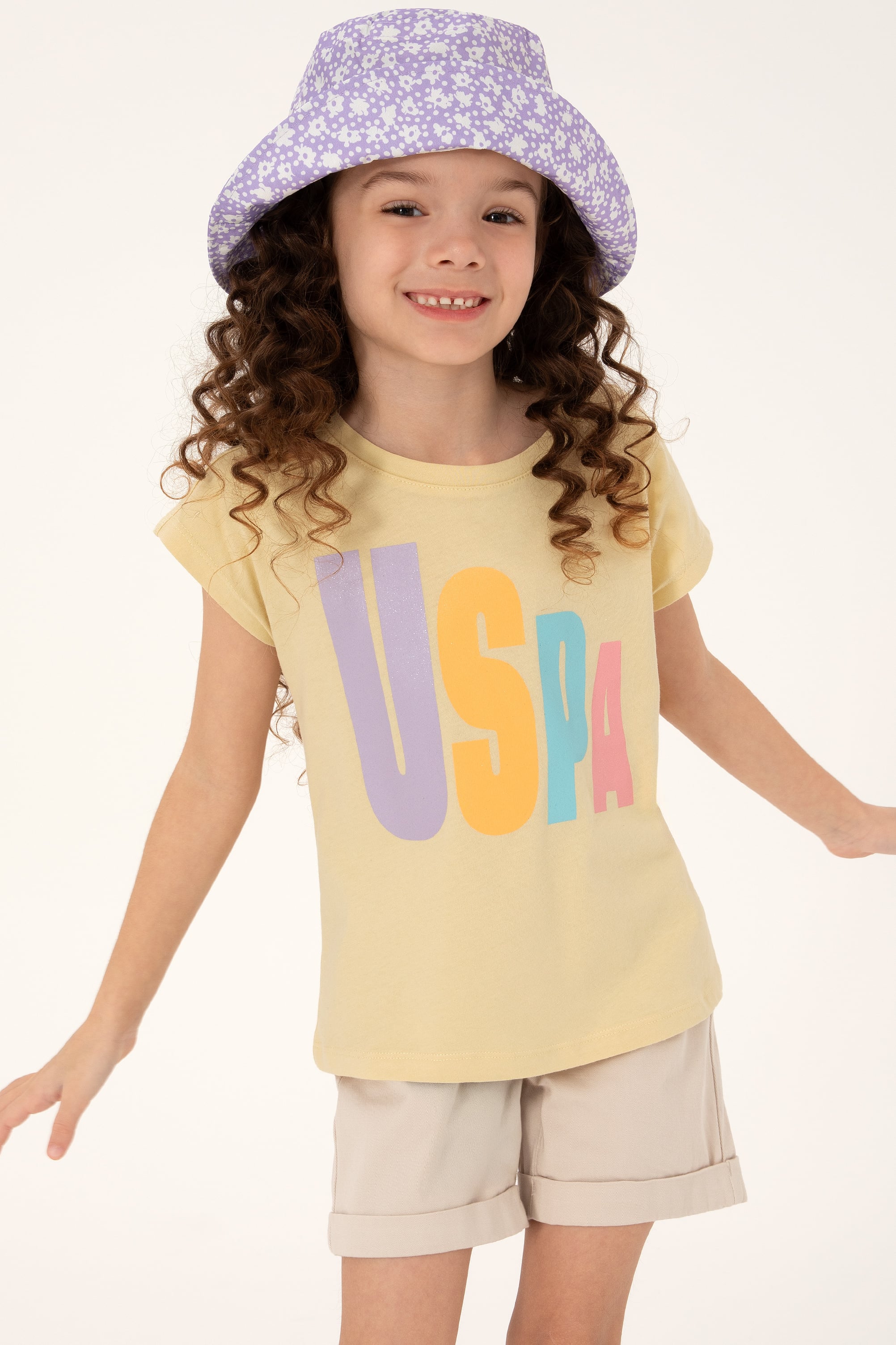 Kız Çocuk Açık Haki Bisiklet Yaka Pamuk Renkli Uspa Baskılı Tişört