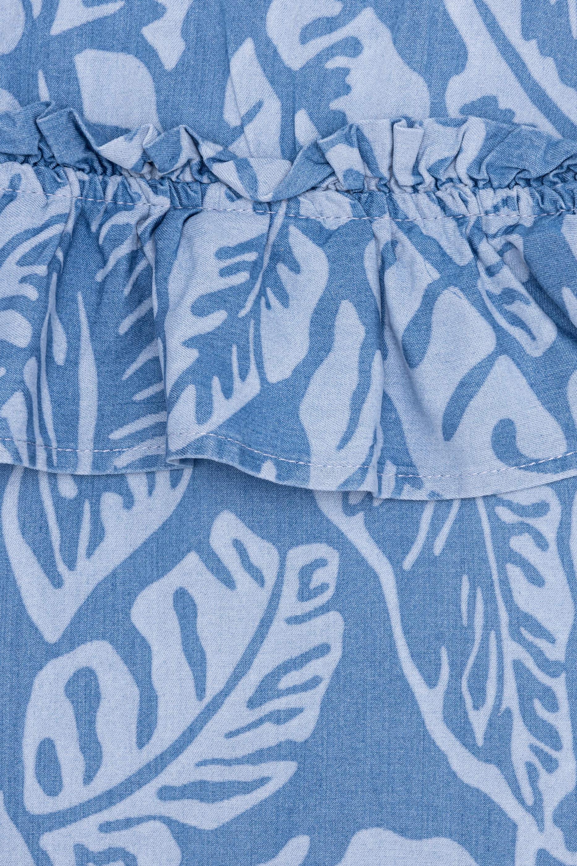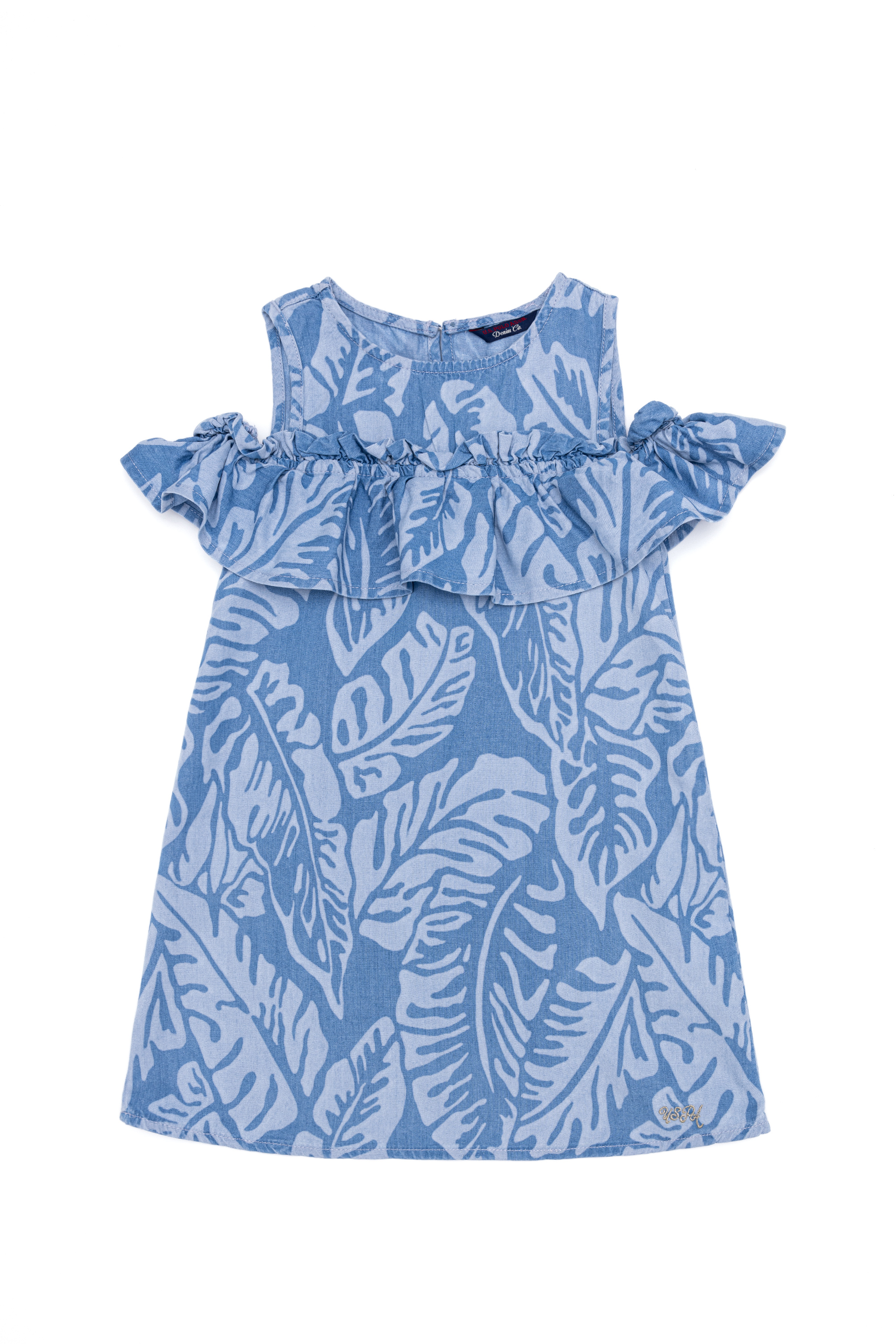 Fırfırlı detaylarıyla dinamiğini arttırdığımız kız çocuk denim elbisemiz baskılı tasarıma sahiptir; çocuğunuzun zengin hayal gücüne hitap eder.