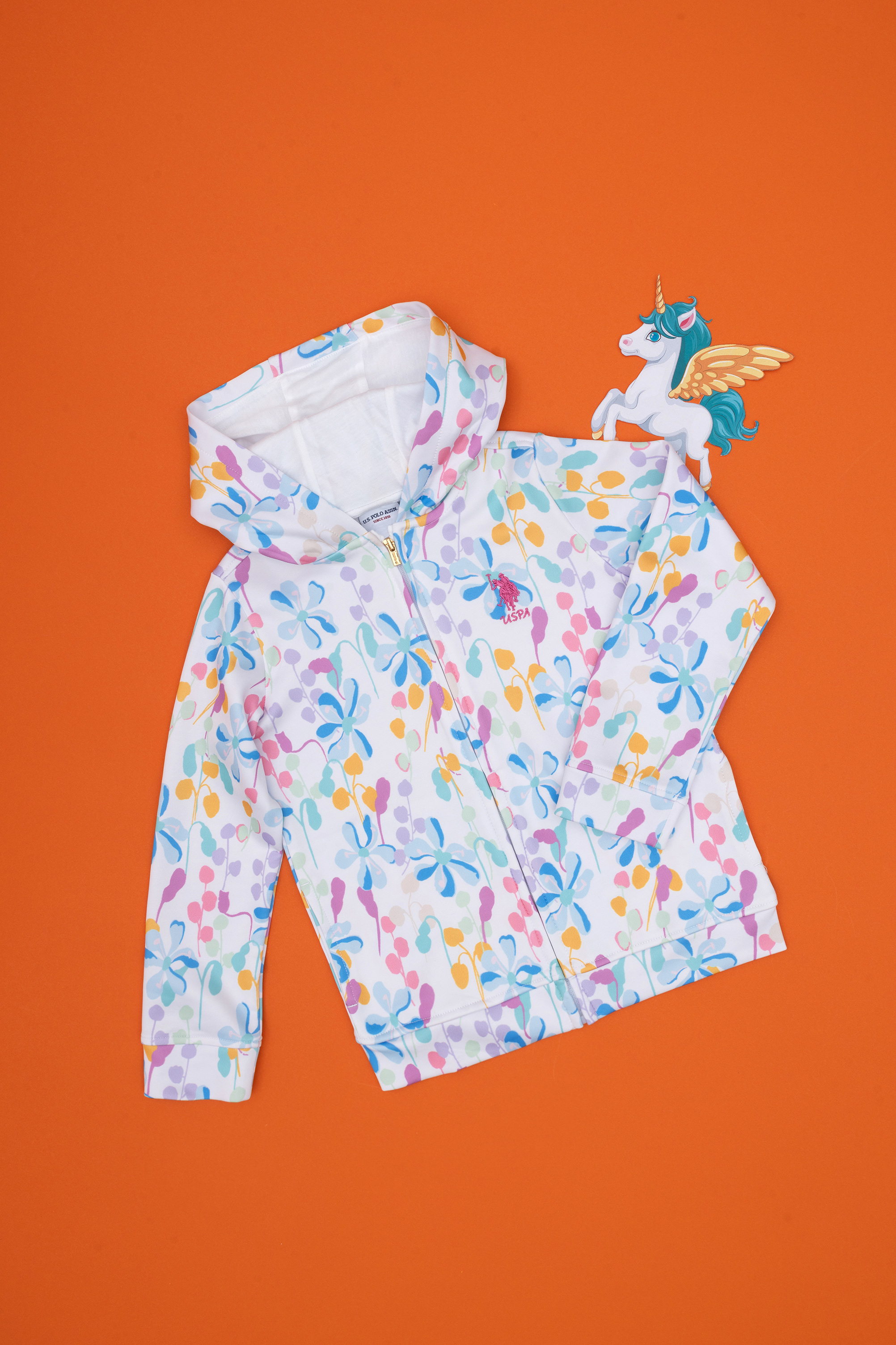 Kız Çocuk Beyaz Desenli Kapüşonlu Fermuarlı Sweatshirt