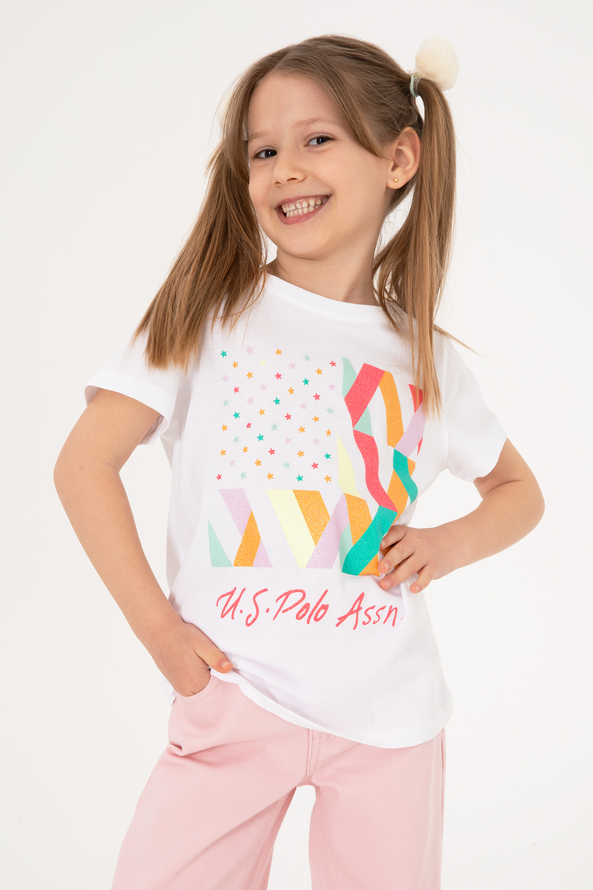 Kız Çocuk Beyaz Bisiklet Yaka Pamuk Renkli Simli Baskılı Tişört