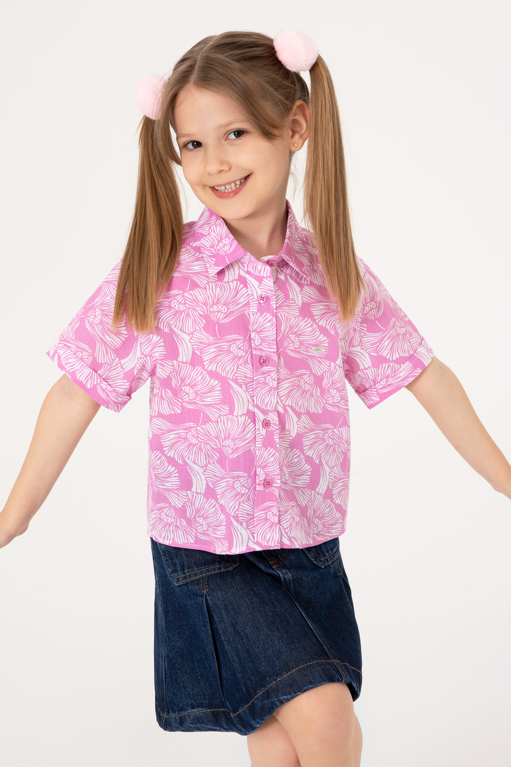- Kız Çocuk Fuşya Çiçek Desenli Keten Görünümlü Kısa Kollu Gömlek