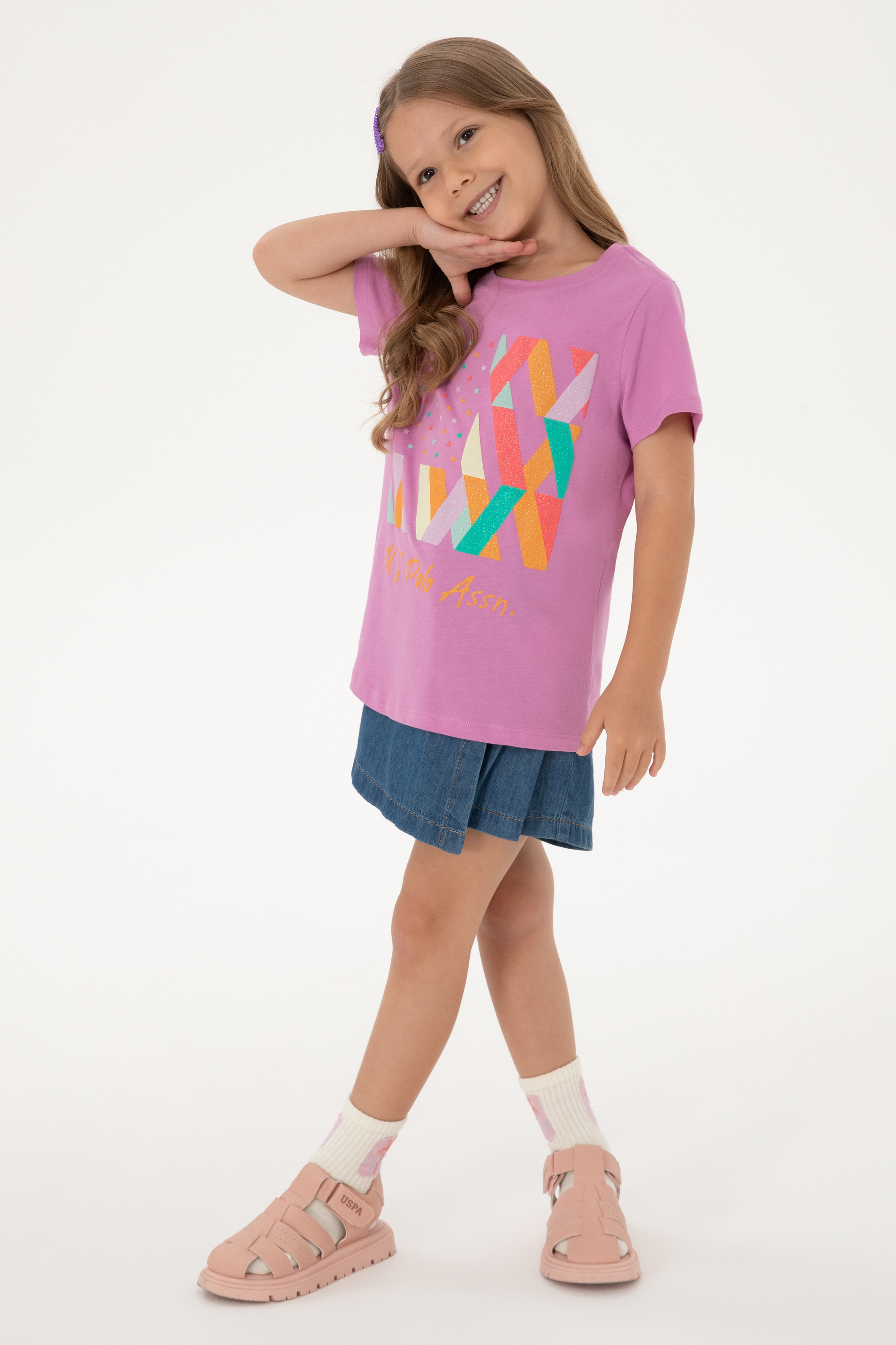 Kız Çocuk Fuşya Bisiklet Yaka Pamuk Renkli Simli Baskılı Tişört