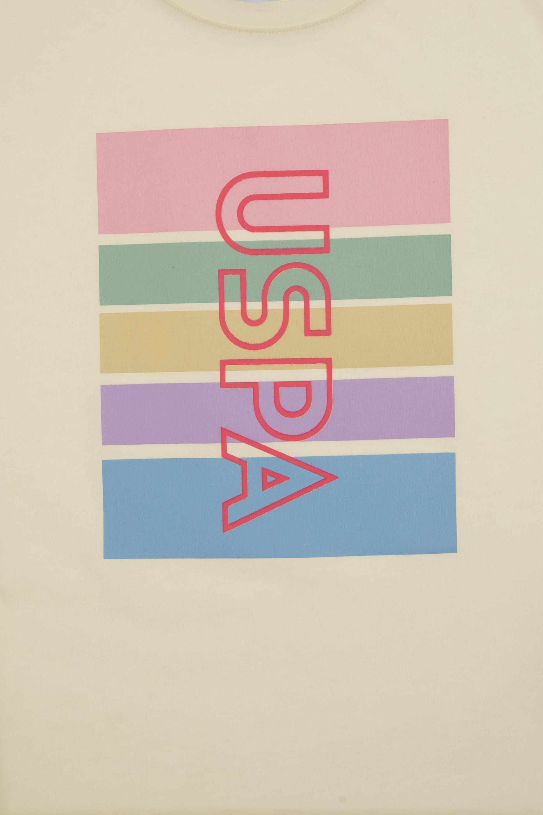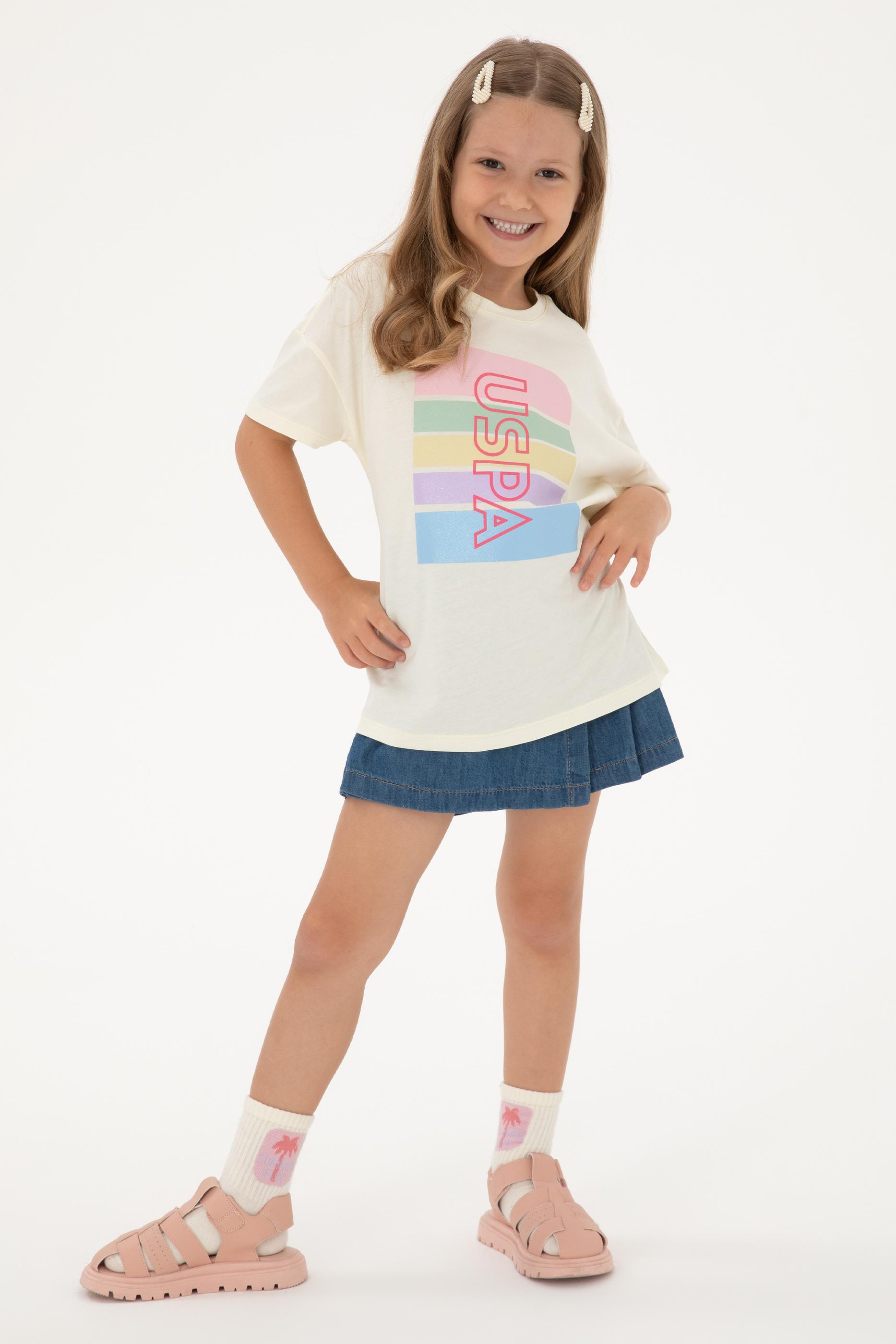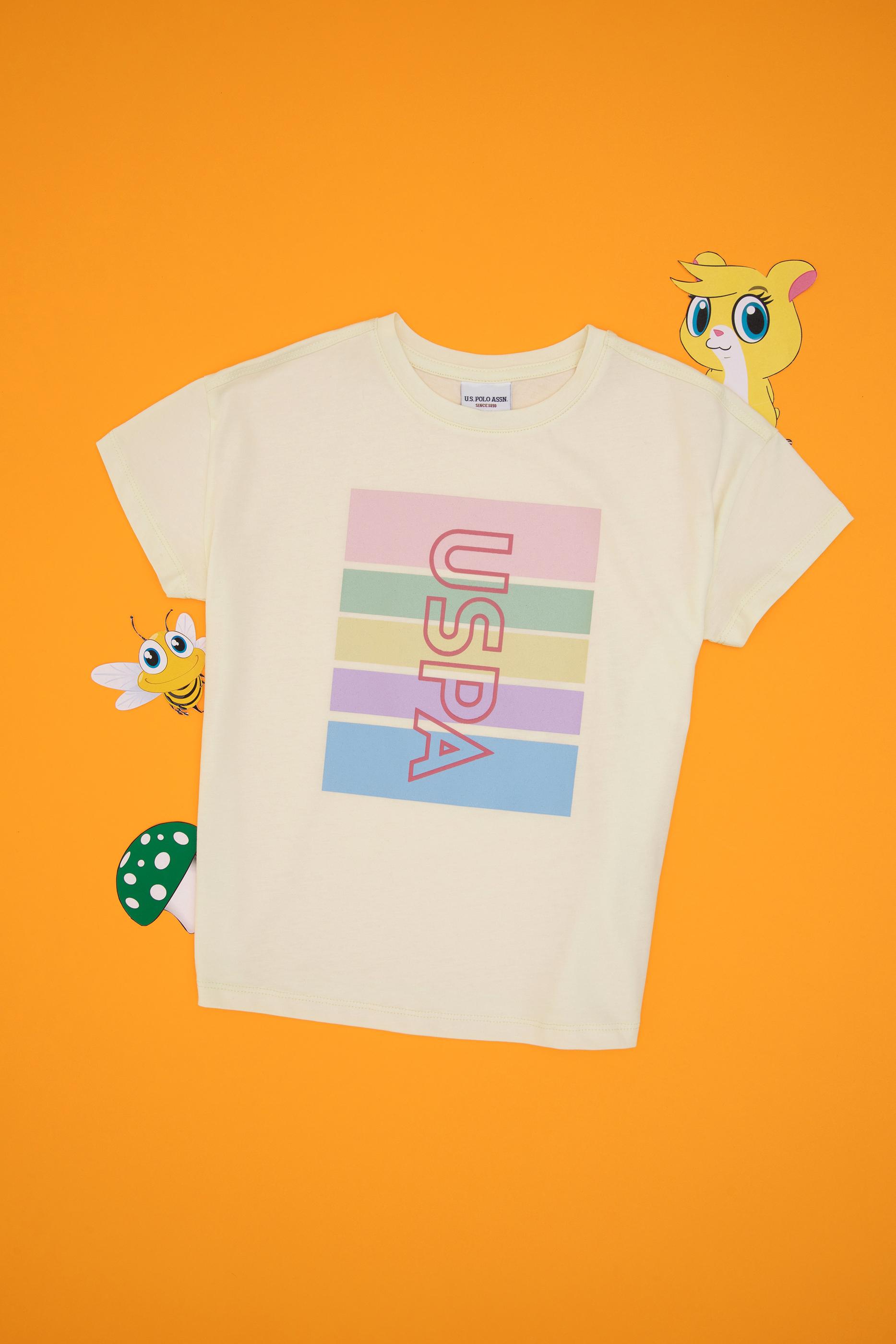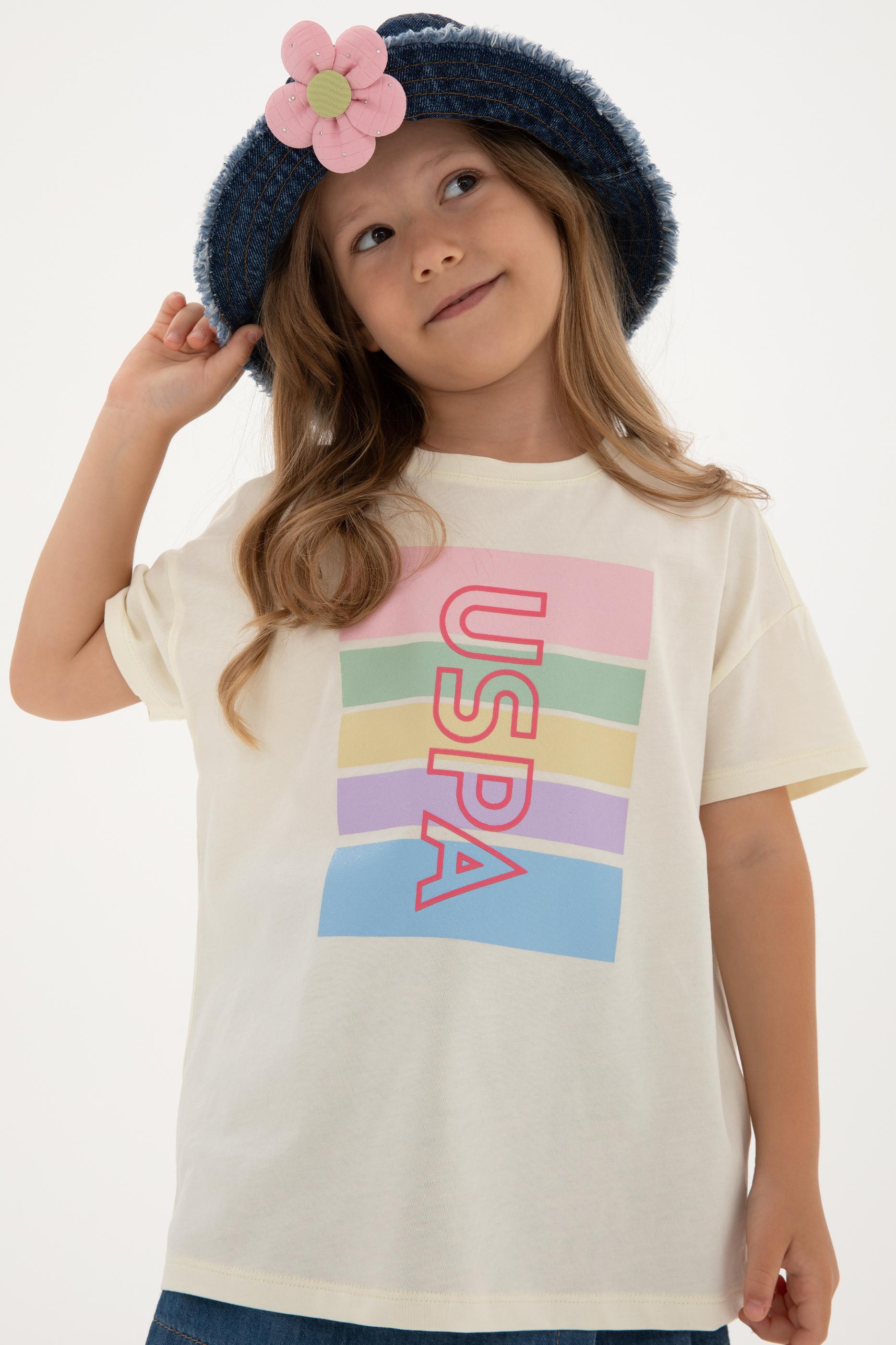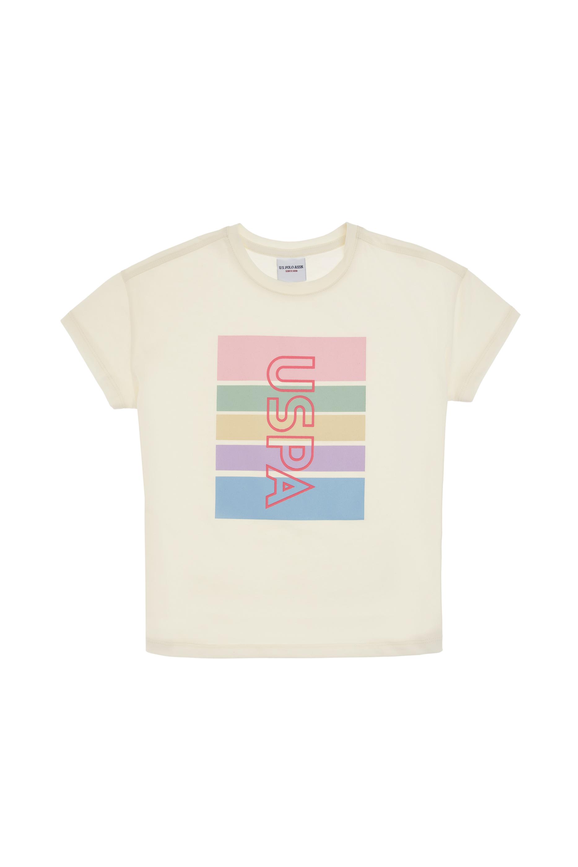 Kız Çocuk Krem Comfort Bisiklet Yaka Renkli Çizgi Baskılı Pamuk Tişört
