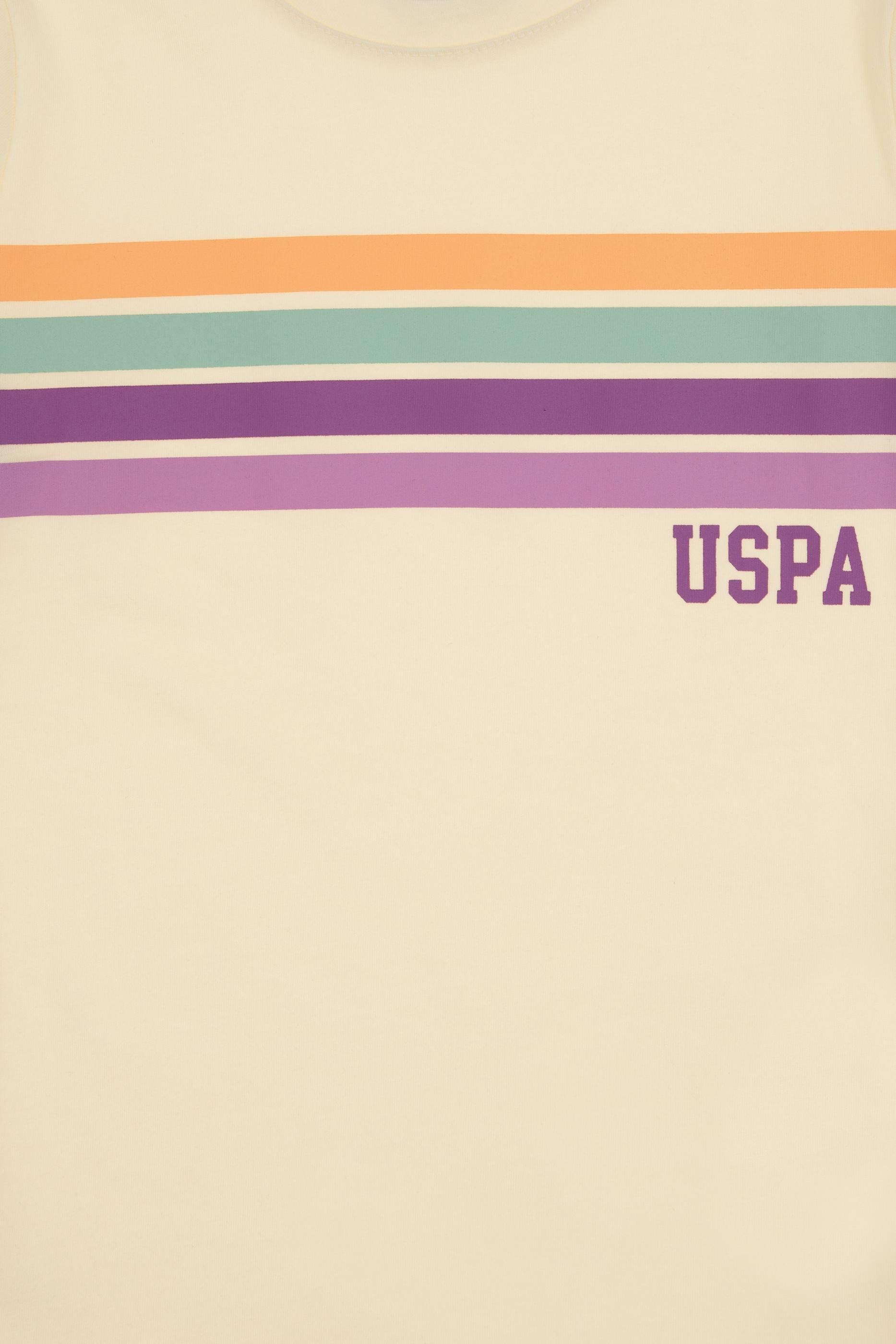 Kız Çocuk Krem Bisiklet Yaka Renkli Çizgi Baskılı Pamuk Tişört