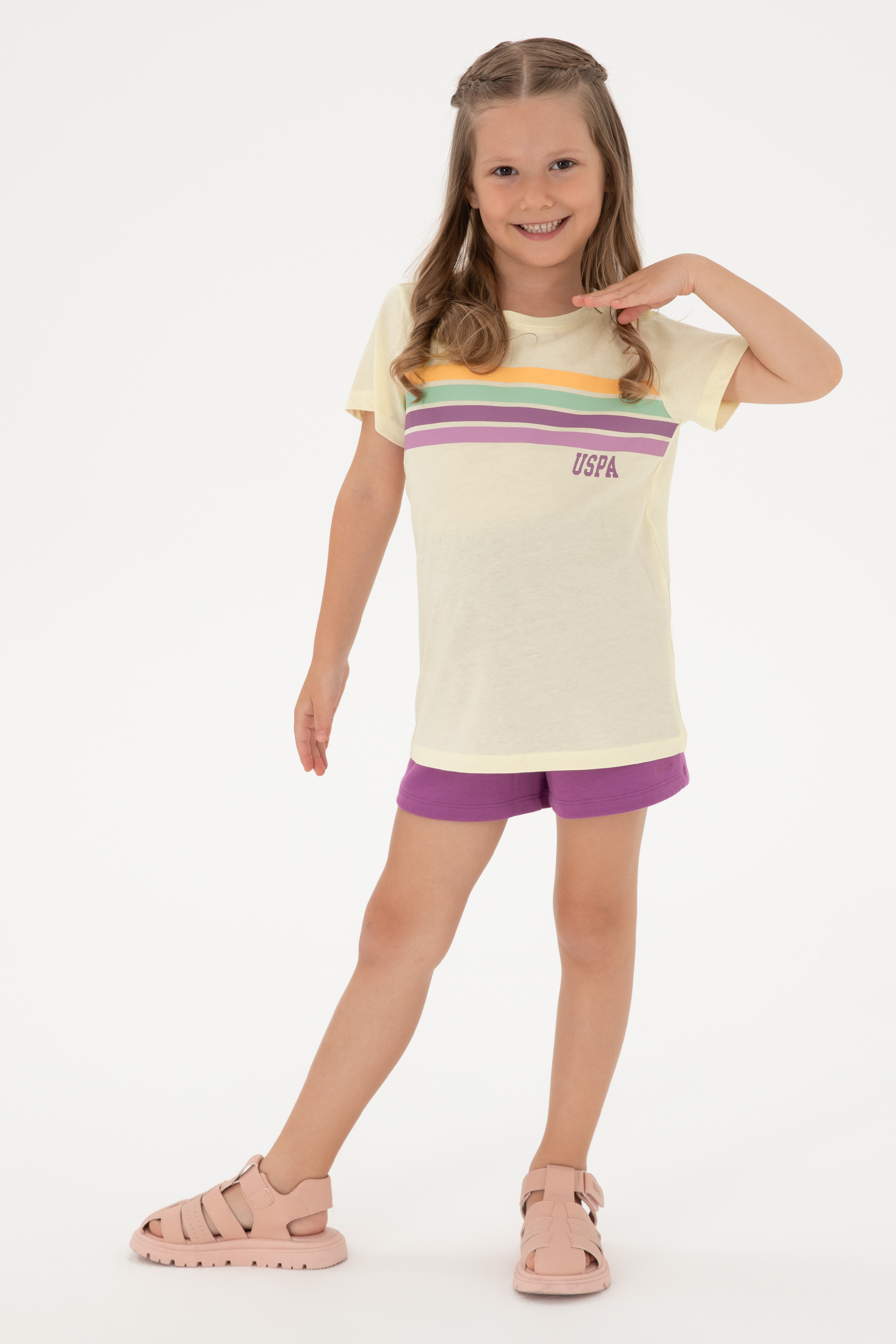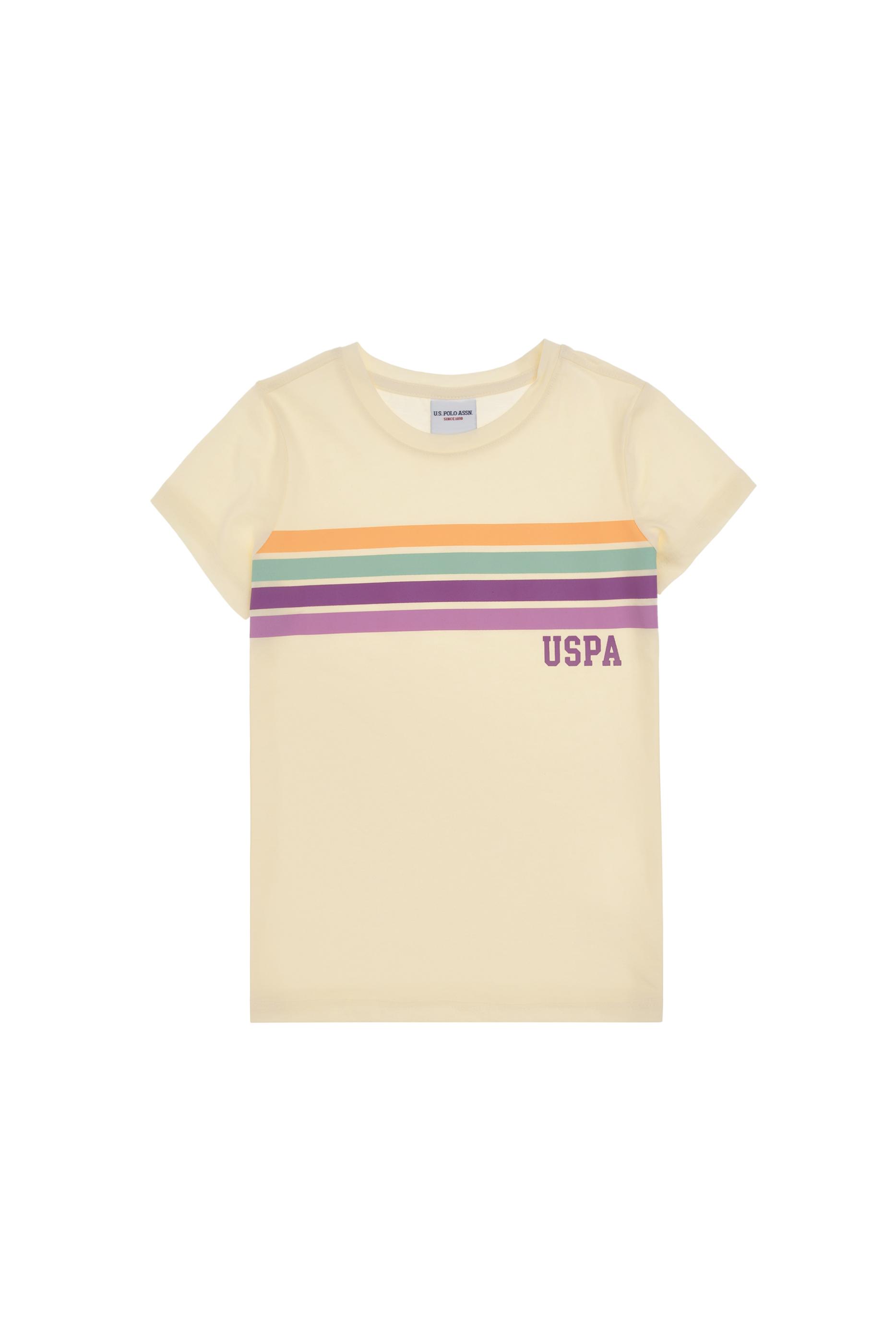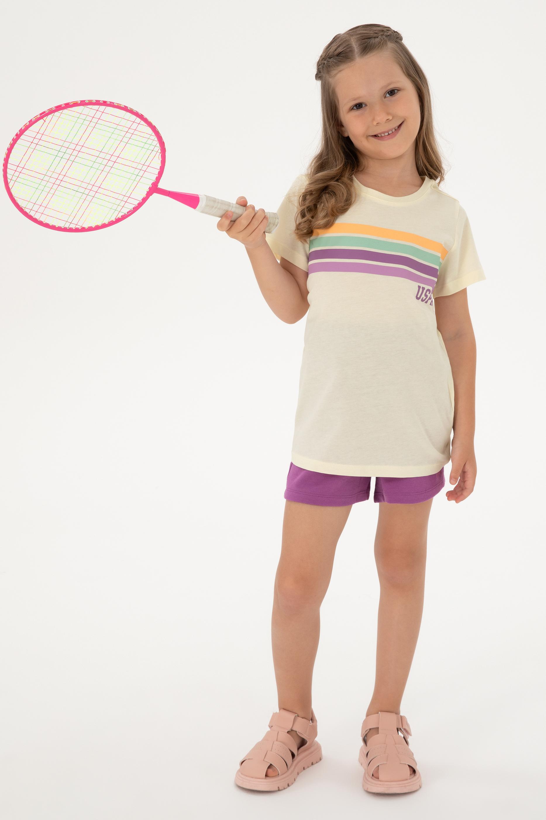 - Kız Çocuk Krem Bisiklet Yaka Renkli Çizgi Baskılı Pamuk Tişört